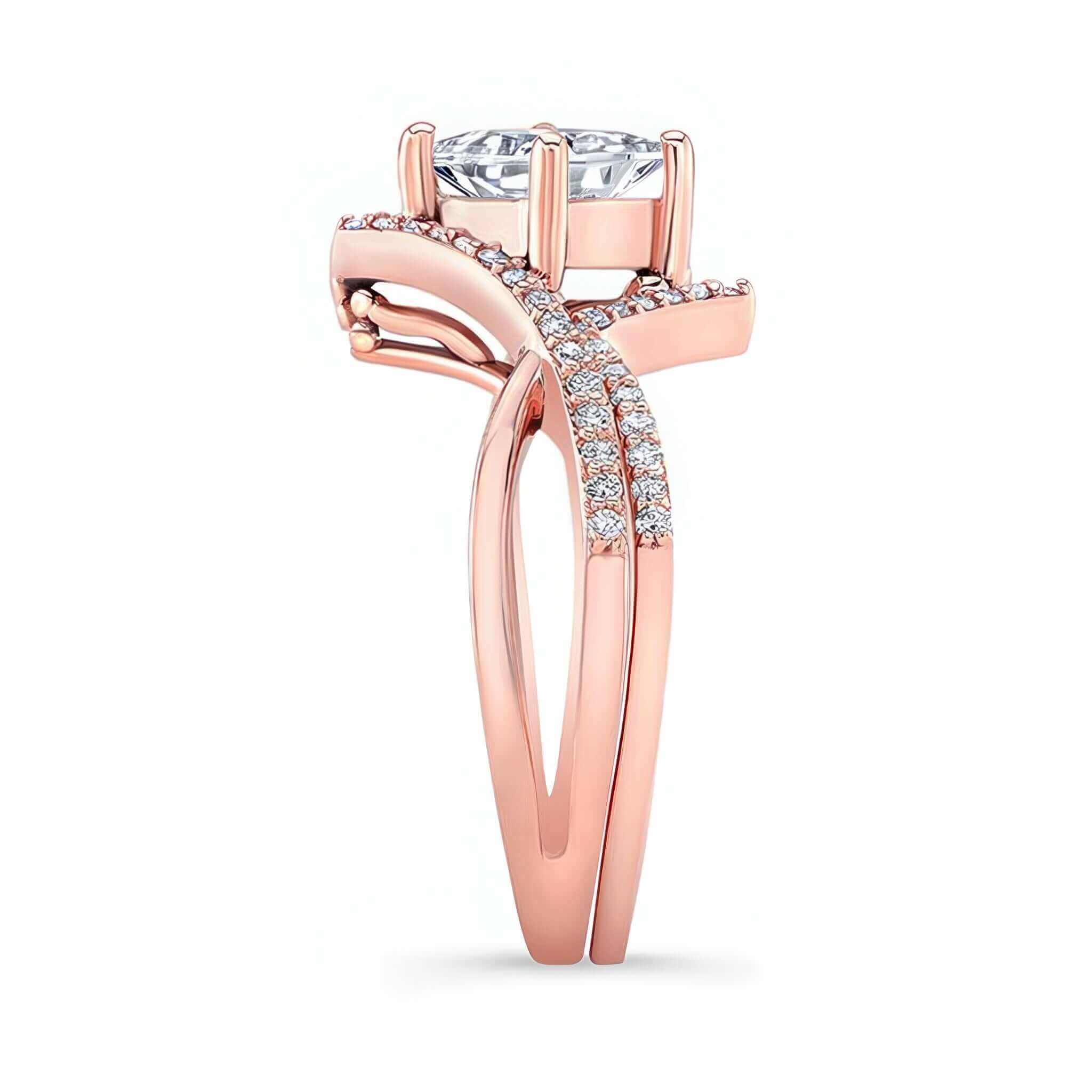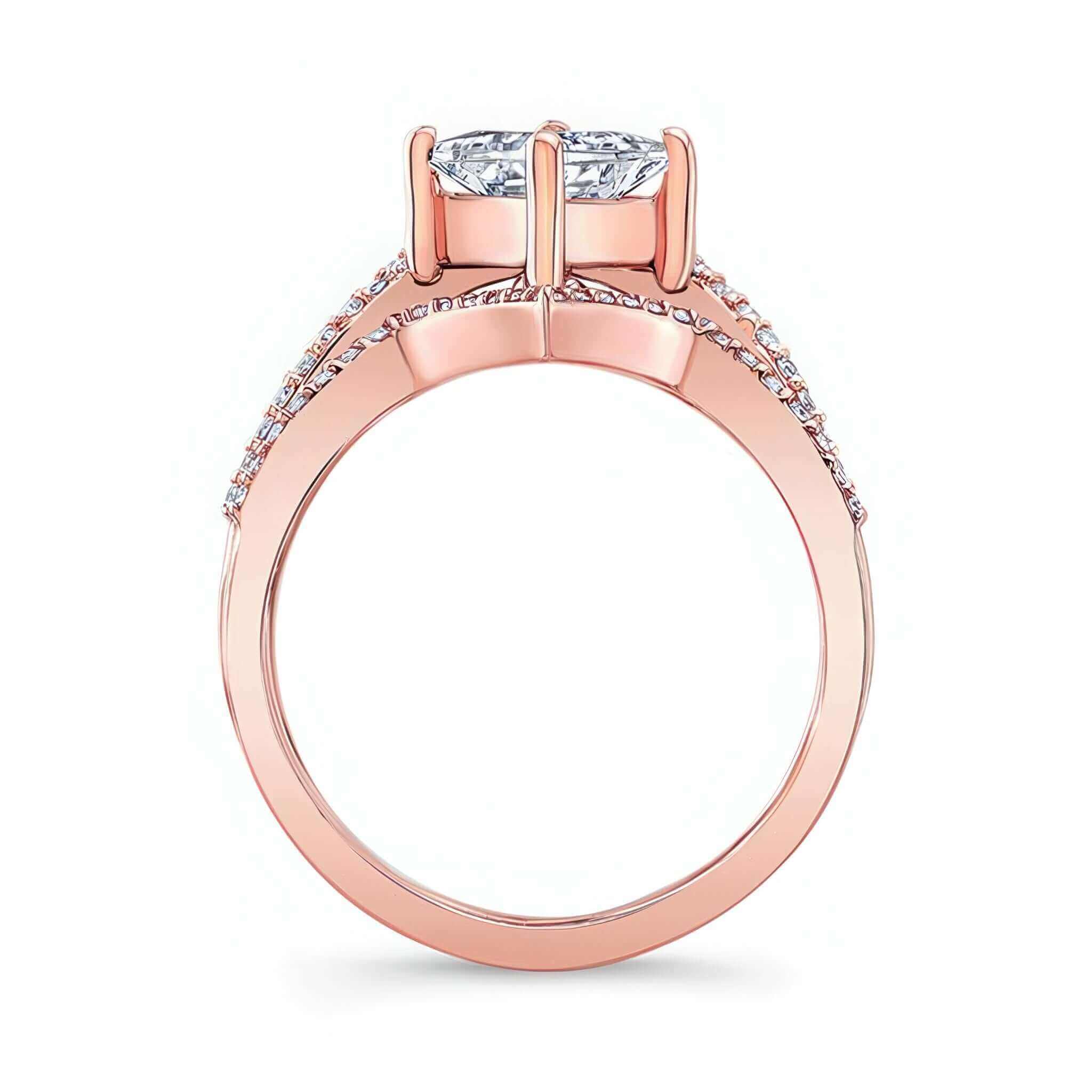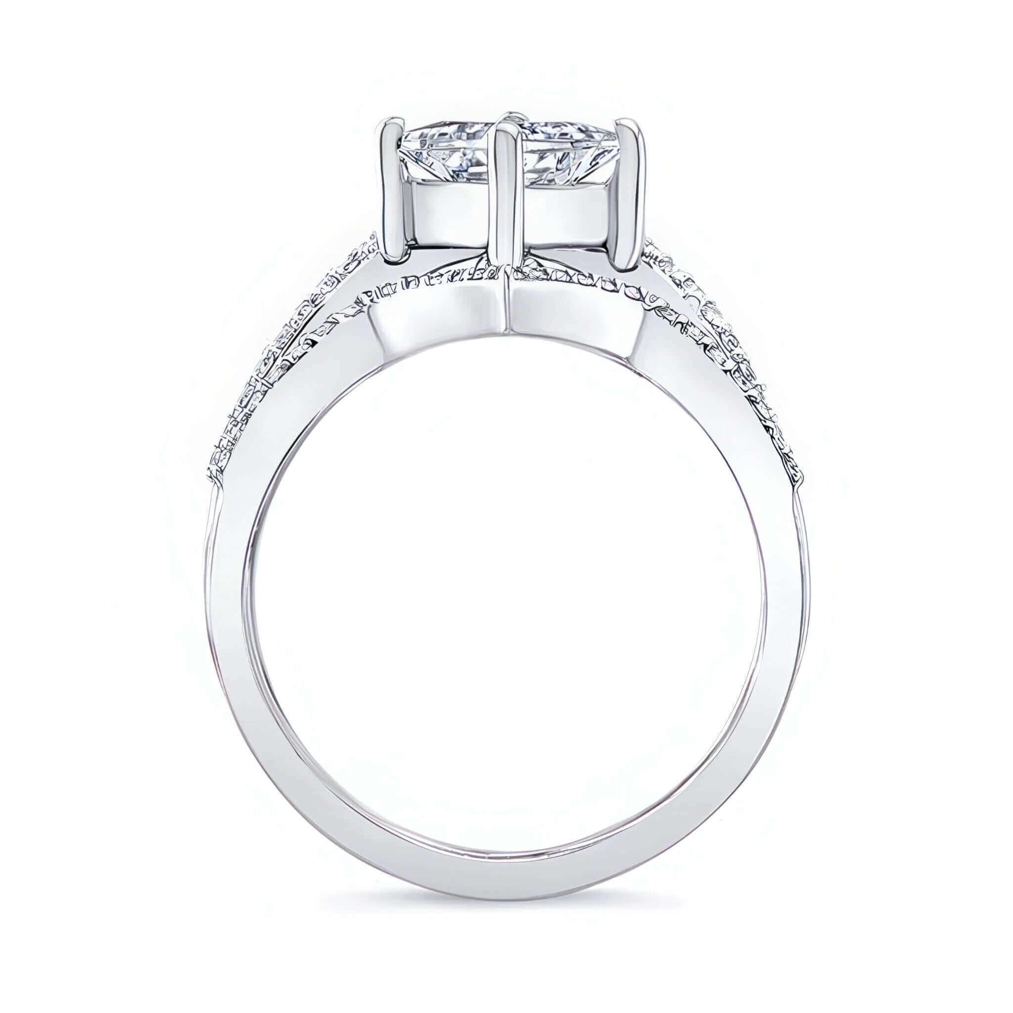 A unique princess cut lab diamond wedding set featuring an engagement ring with a square shaped center, sitting on a curving shank with a row of diamonds and a matching wedding band for added sparkle.