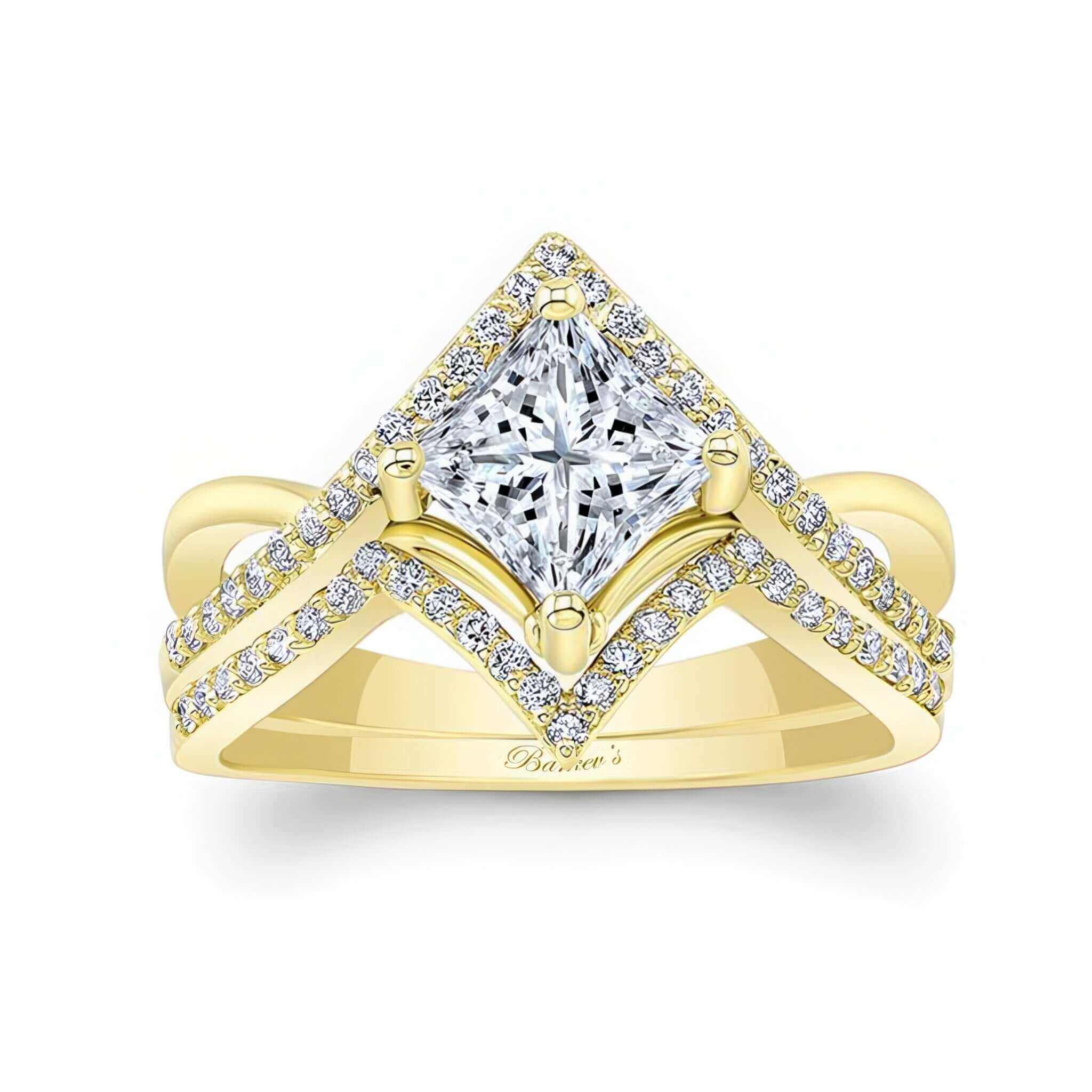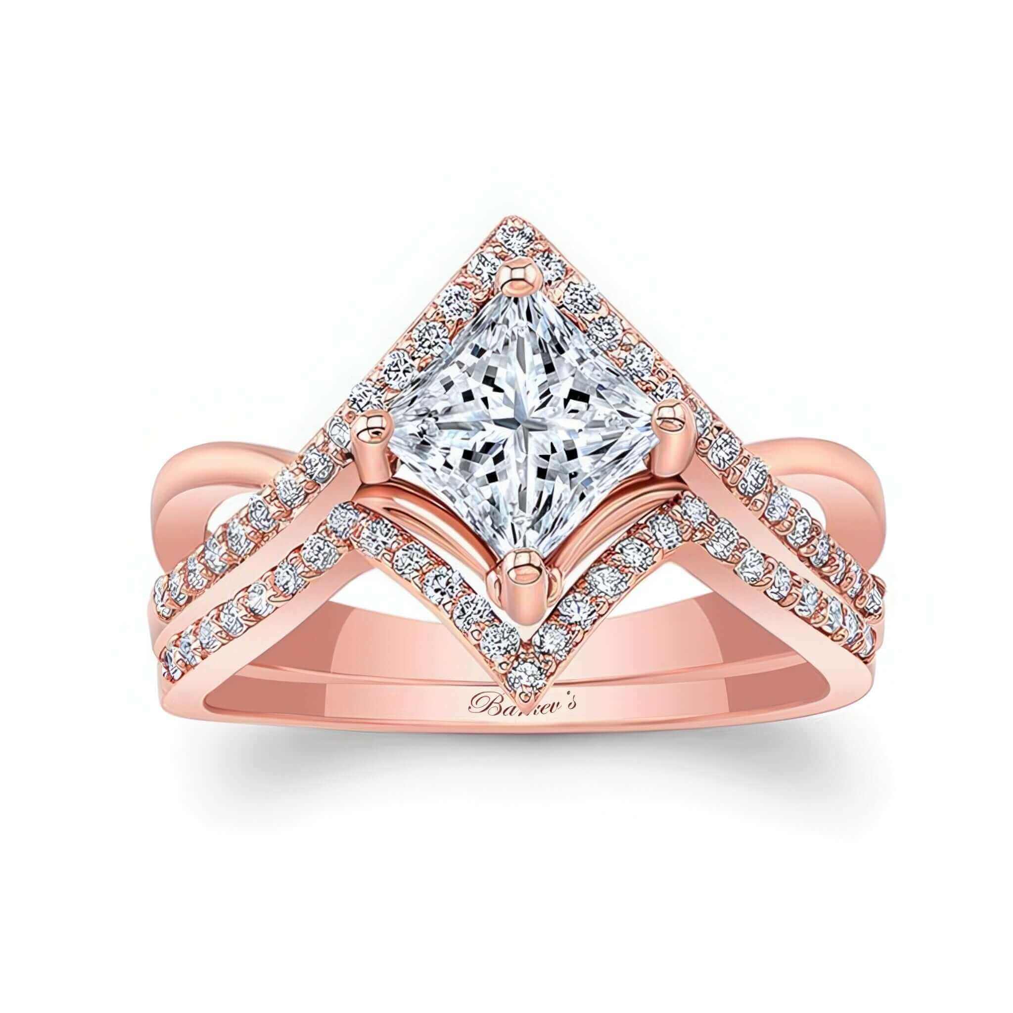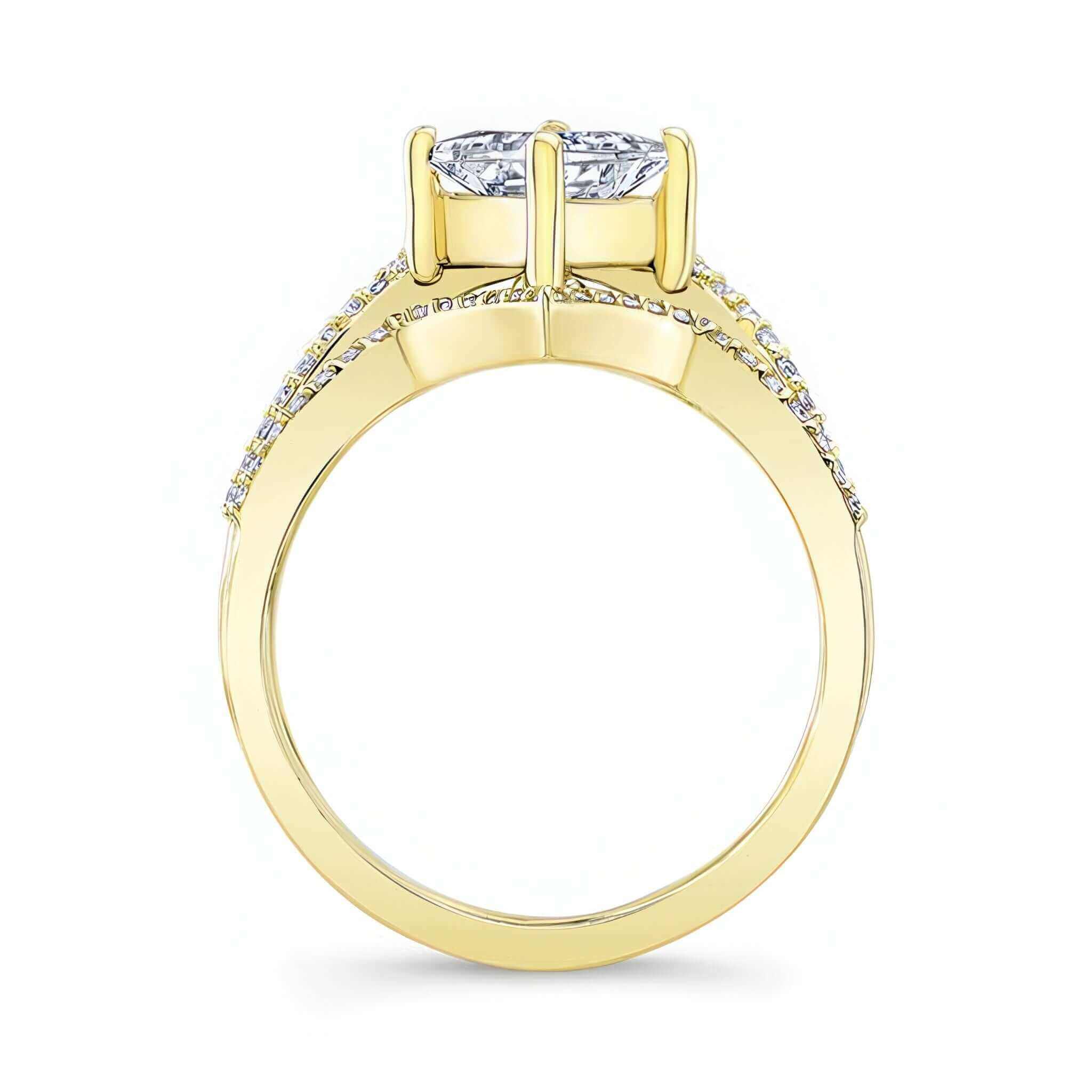 A unique princess cut lab diamond wedding set featuring an engagement ring with a square shaped center, sitting on a curving shank with a row of diamonds and a matching wedding band for added sparkle.