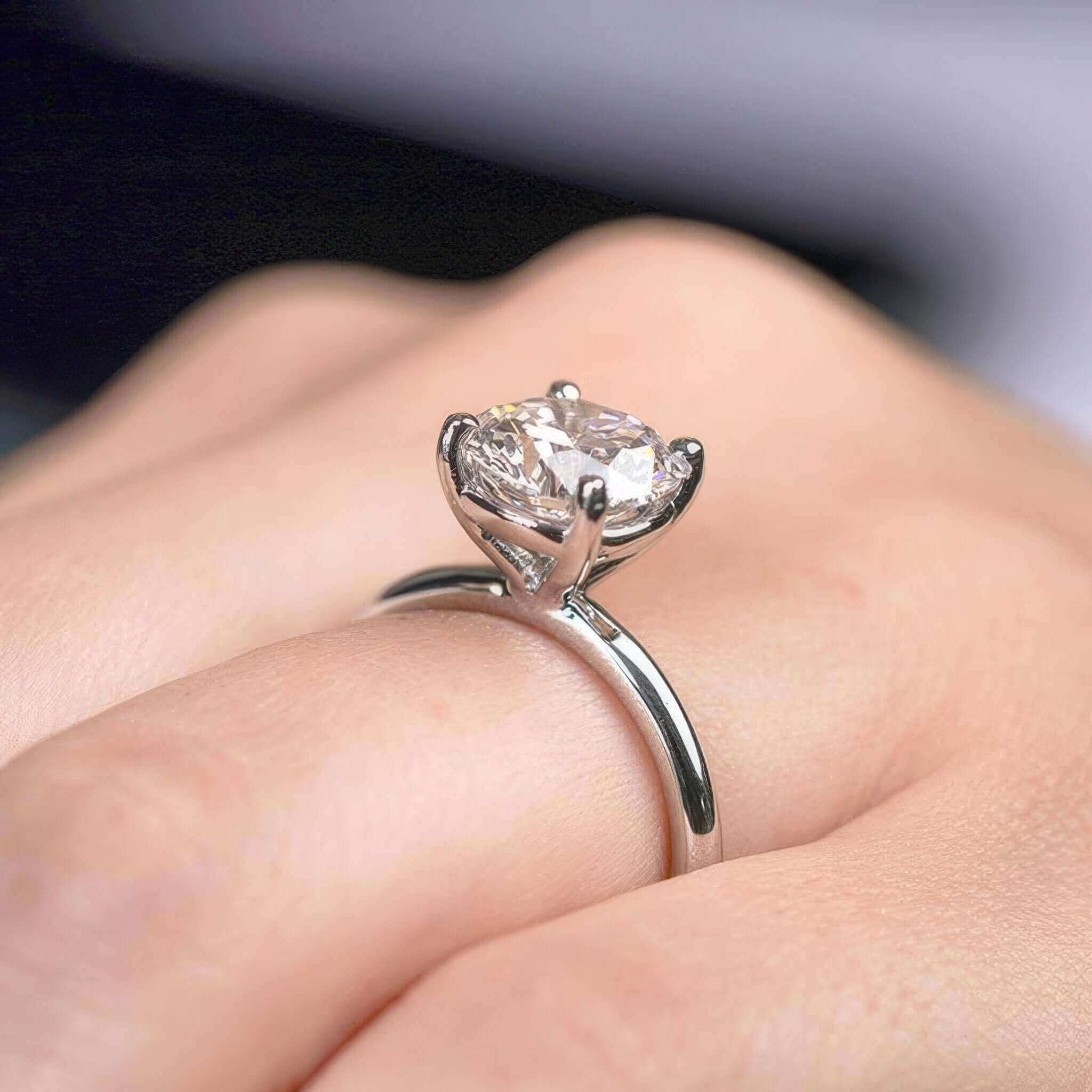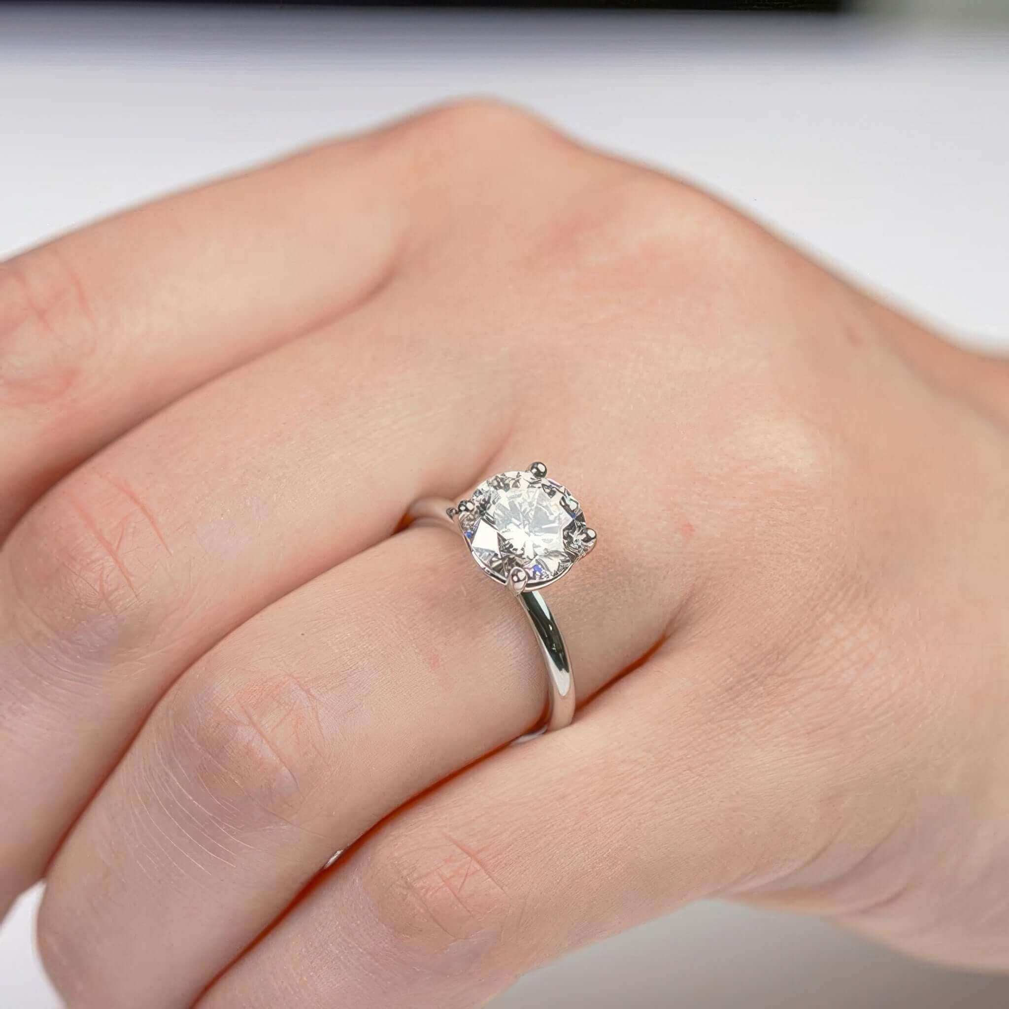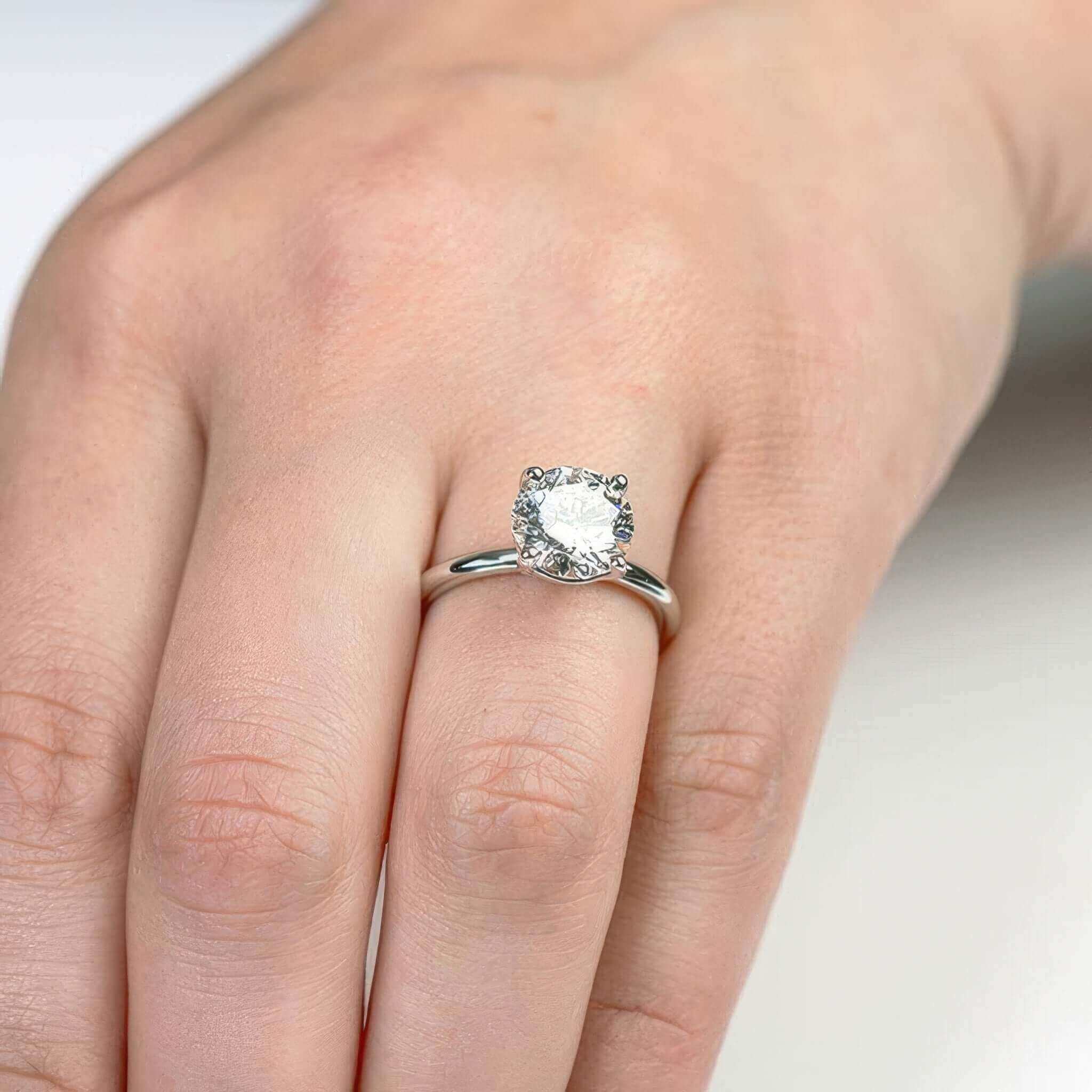 A classic and minimal solitaire lab diamond ring featuring a prong set round center sitting on an elegant polished band.