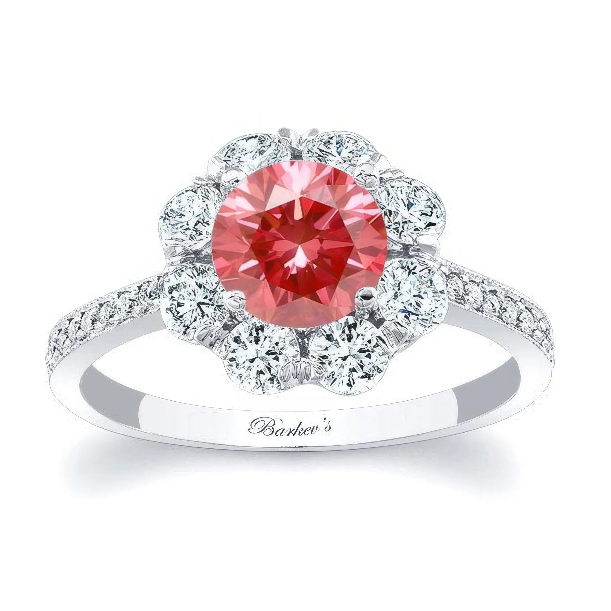 This flower halo lab grown pink diamond engagement ring is stunning and in vogue featuring shared prong set diamonds encircling the low profile round center and pave set diamonds cascading down the dainty shank for a look of sheer elegance.