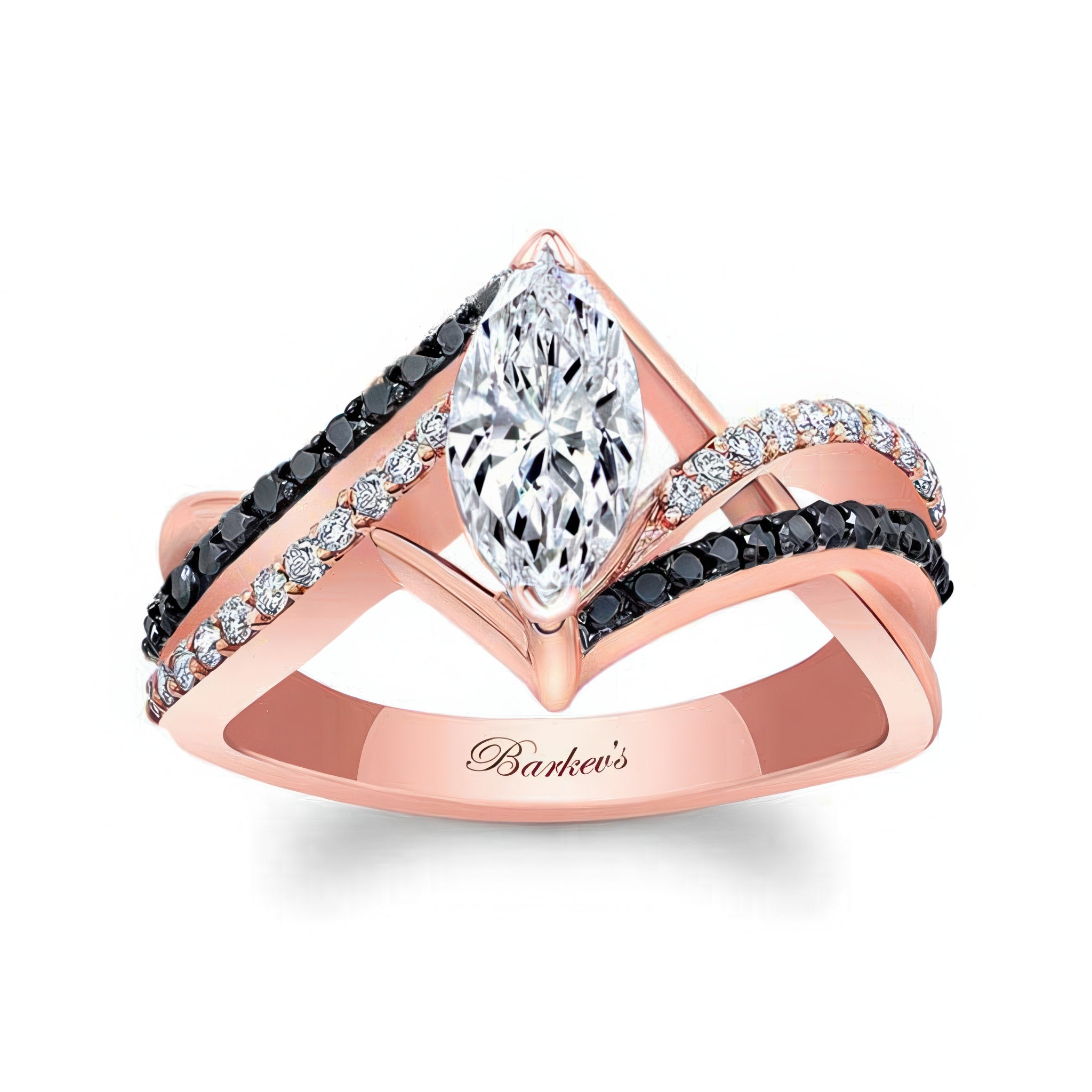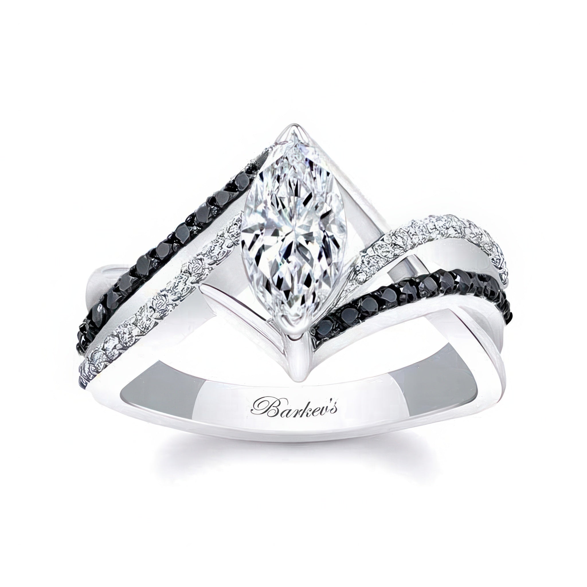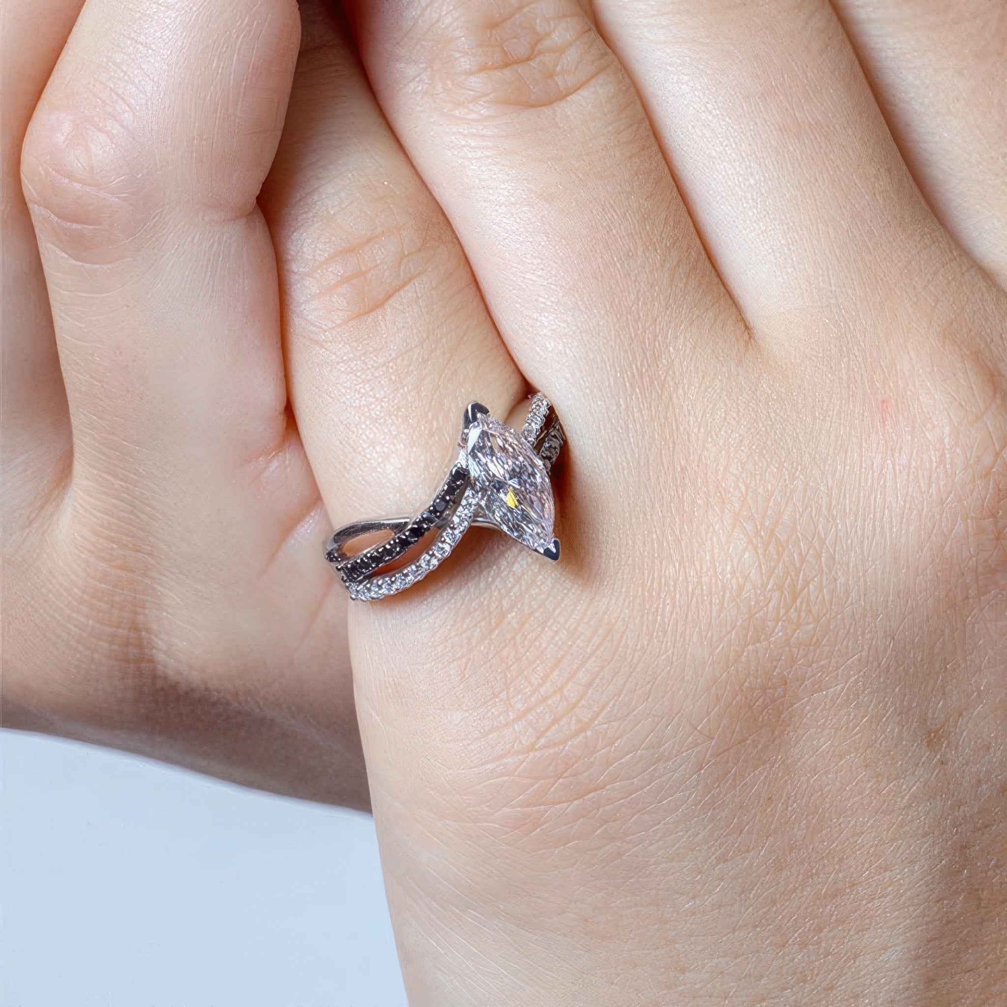 A black diamond accent marquise moissanite ring featuring a prong set marquise shape center that sits beautifully between interwoven rows of melees which descend gracefully down the curves. This uniquely designed ring will surely catch the eyes of many admirers.