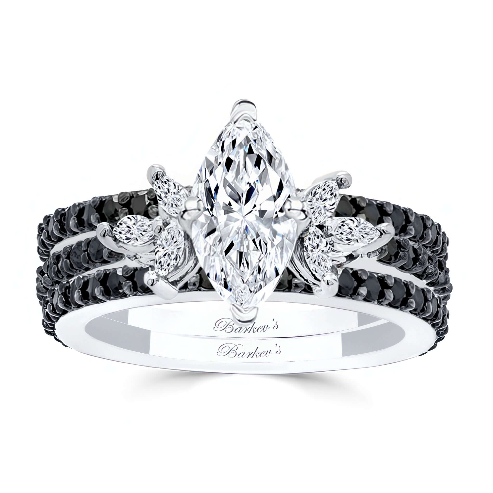Discover timeless elegance with this stunning marquise cut moissanite bridal set with 2 bands and black diamonds. The centerpiece is a dazzling marquise moissanite, accentuated by six additional marquise diamonds arranged in a floral-inspired design. Completing the look, 18 round black diamonds shimmer along the delicate shank, adding brilliance to every angle. Comes with a pair of matching wedding bands with 25 black diamonds on each. A perfect blend of sophistication and romance, this set is crafted for those who appreciate unique and graceful details.