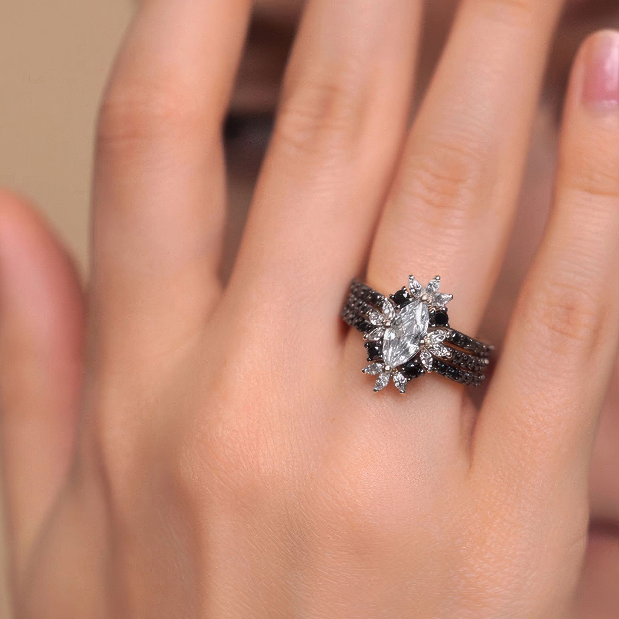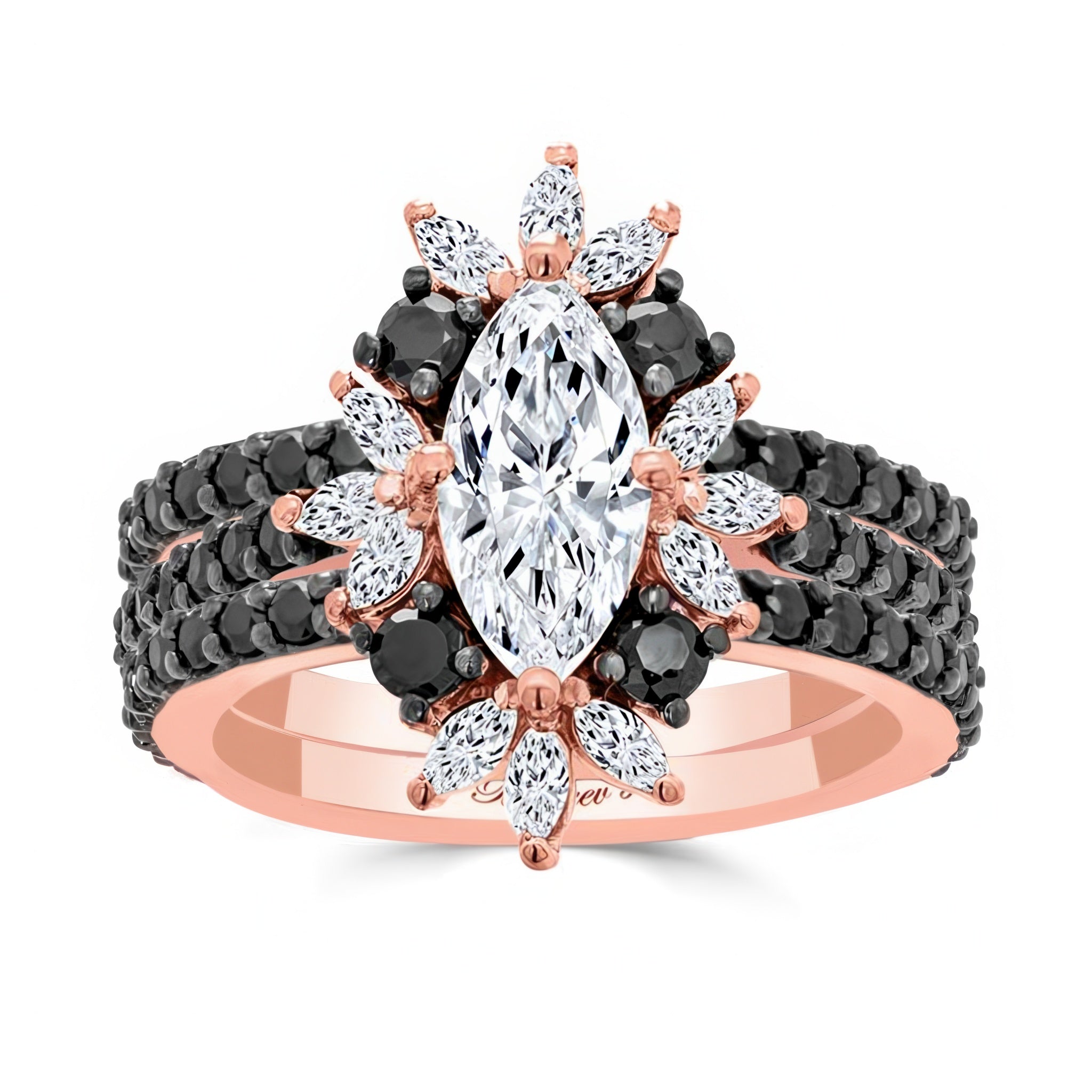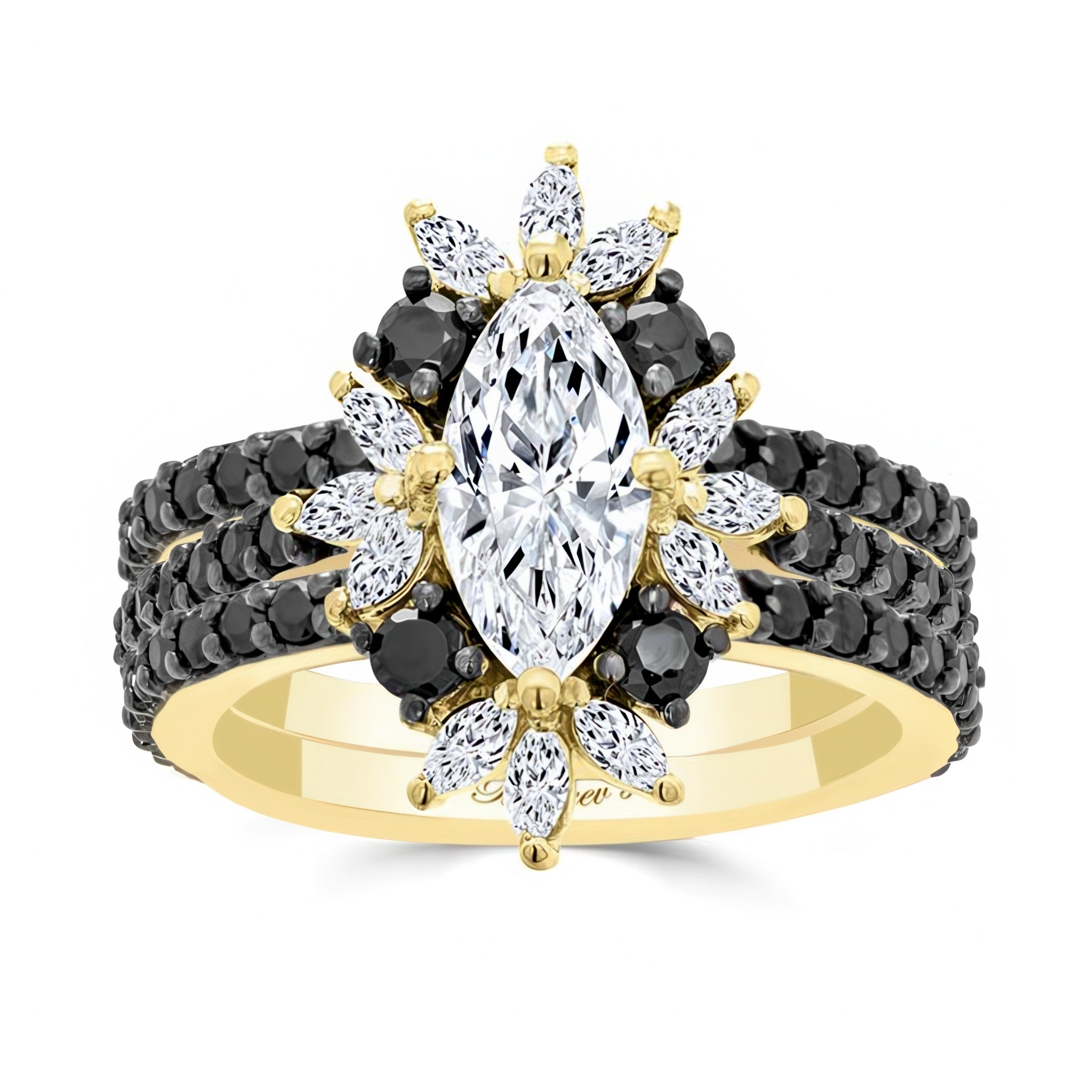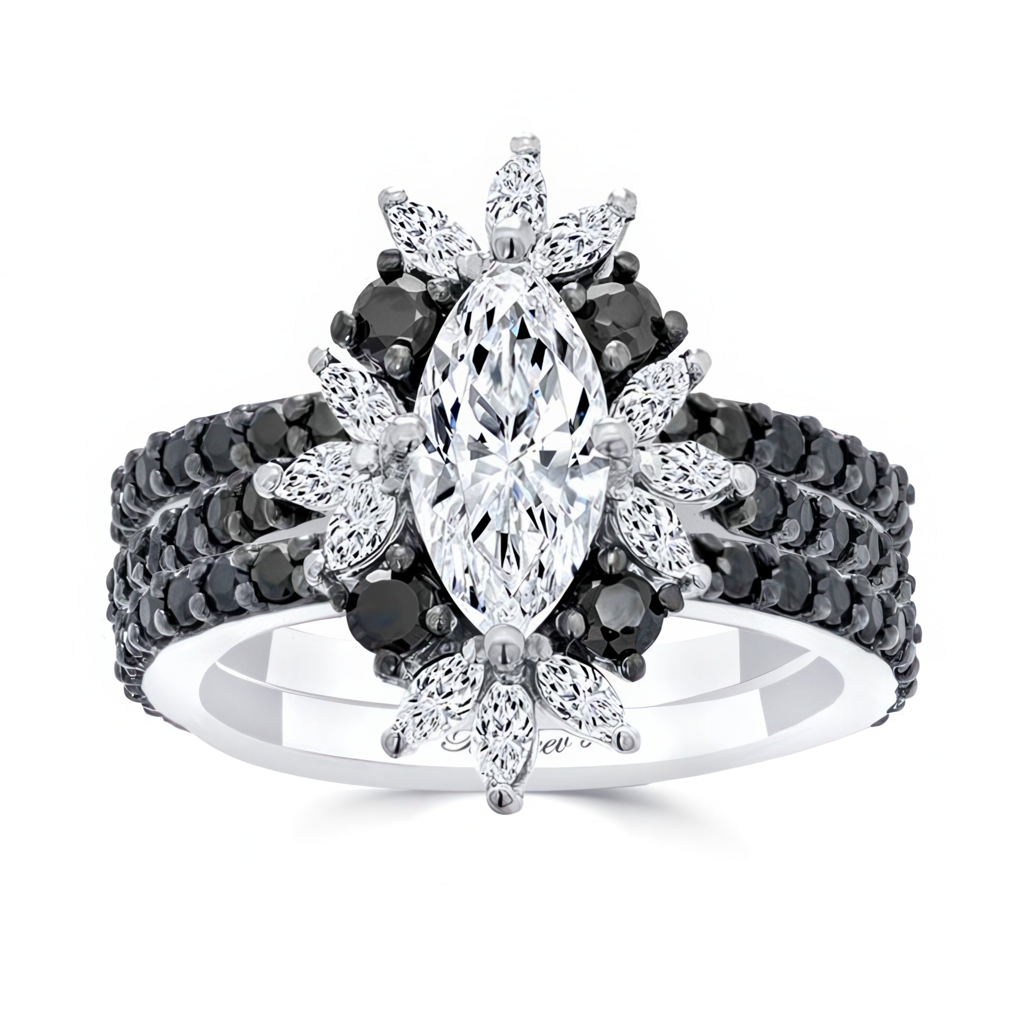 Presenting a stunning marquise moissanite wedding set with black diamonds and 2 bands, designed to captivate. This elegant piece features a central marquise moissanite encircled by a halo of 12 shimmering marquise diamonds and 4 round black diamonds, creating a breathtaking floral effect around the center stone. The band is further adorned with 20 brilliant round black diamonds, adding extra sparkle along the shank. This brilliant set comes with a pair of matching wedding bands adorned with 25 round black diamonds each and is a perfect choice for those seeking a timeless, sophisticated design with a unique twist on classic elegance.