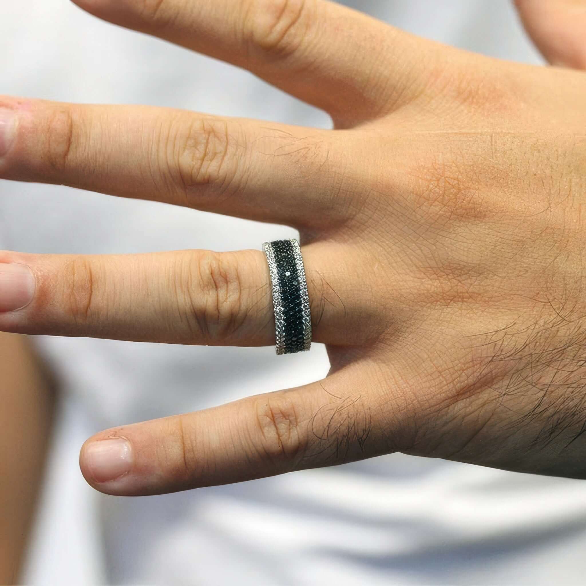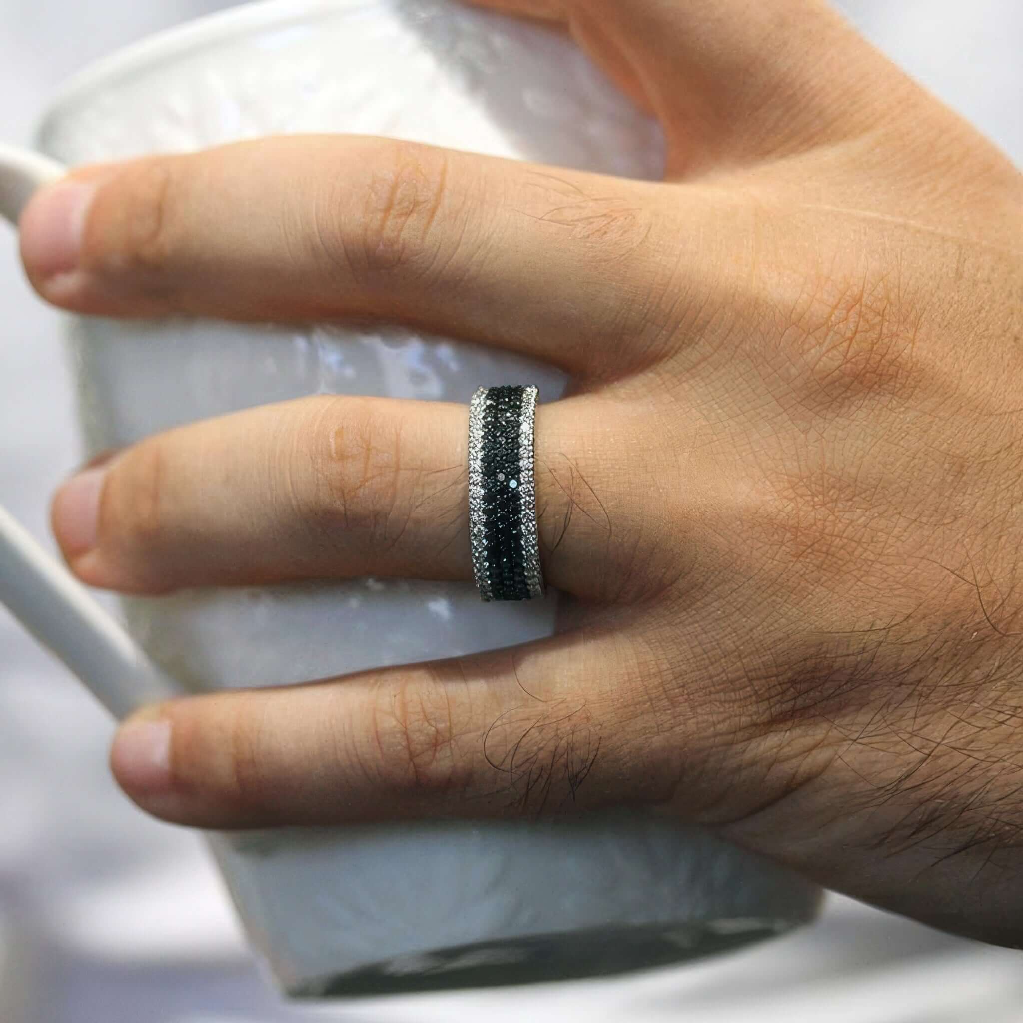 This mens 5 row black and white diamond band is embellished with pave set black and white diamonds, sure to catch the eye of many admirers.
