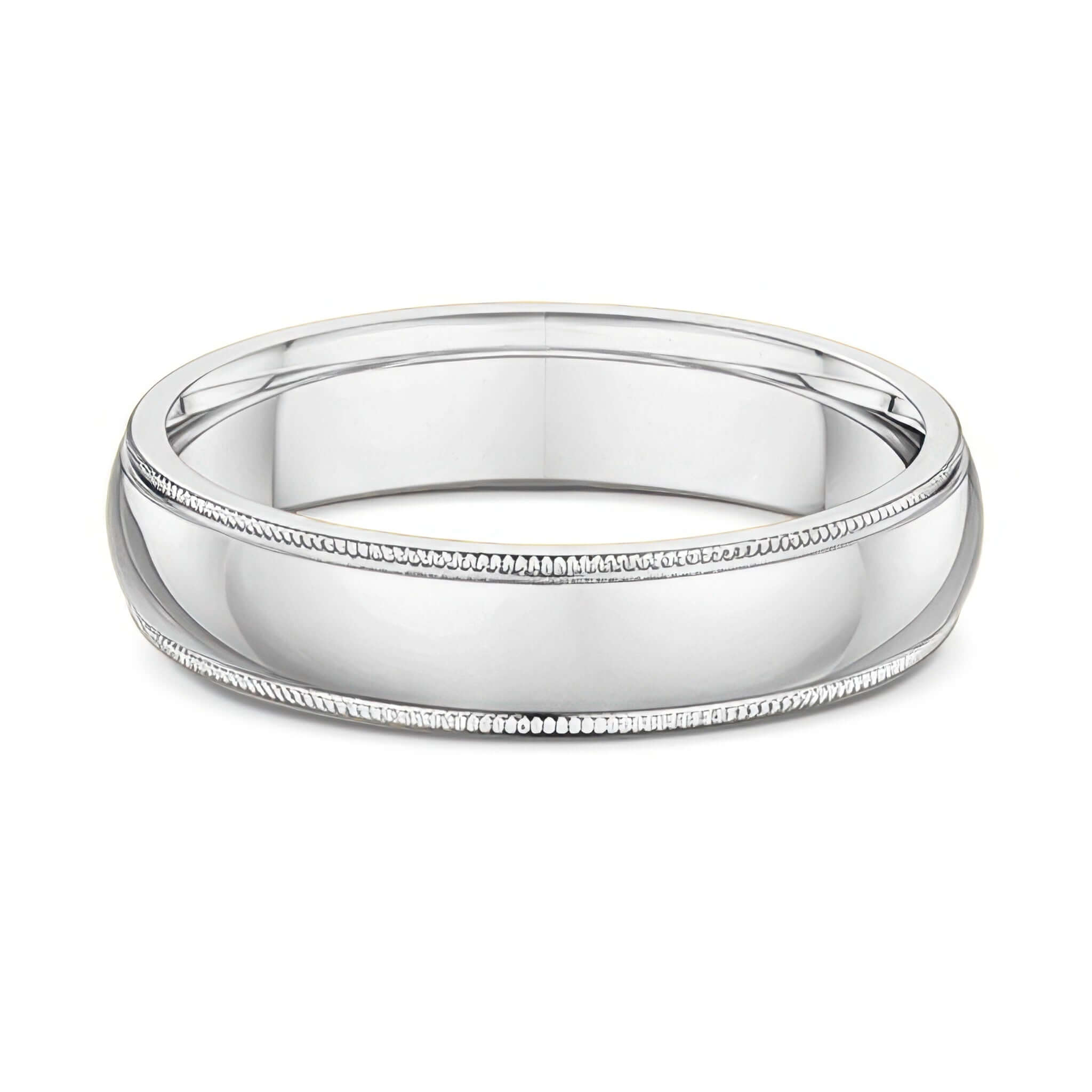 This men’s 5mm milgrain edge platinum wedding band has a sleek, polished finish with refined detailing. The band features subtle milgrain edges along both sides, adding texture and a touch of vintage charm while keeping the overall design elegant and timeless. Its comfort-fit interior ensures easy everyday wear, and the natural brilliance of platinum gives it a distinguished, enduring presence. A perfect choice for someone who appreciates a mix of classic style with fine craftsmanship.