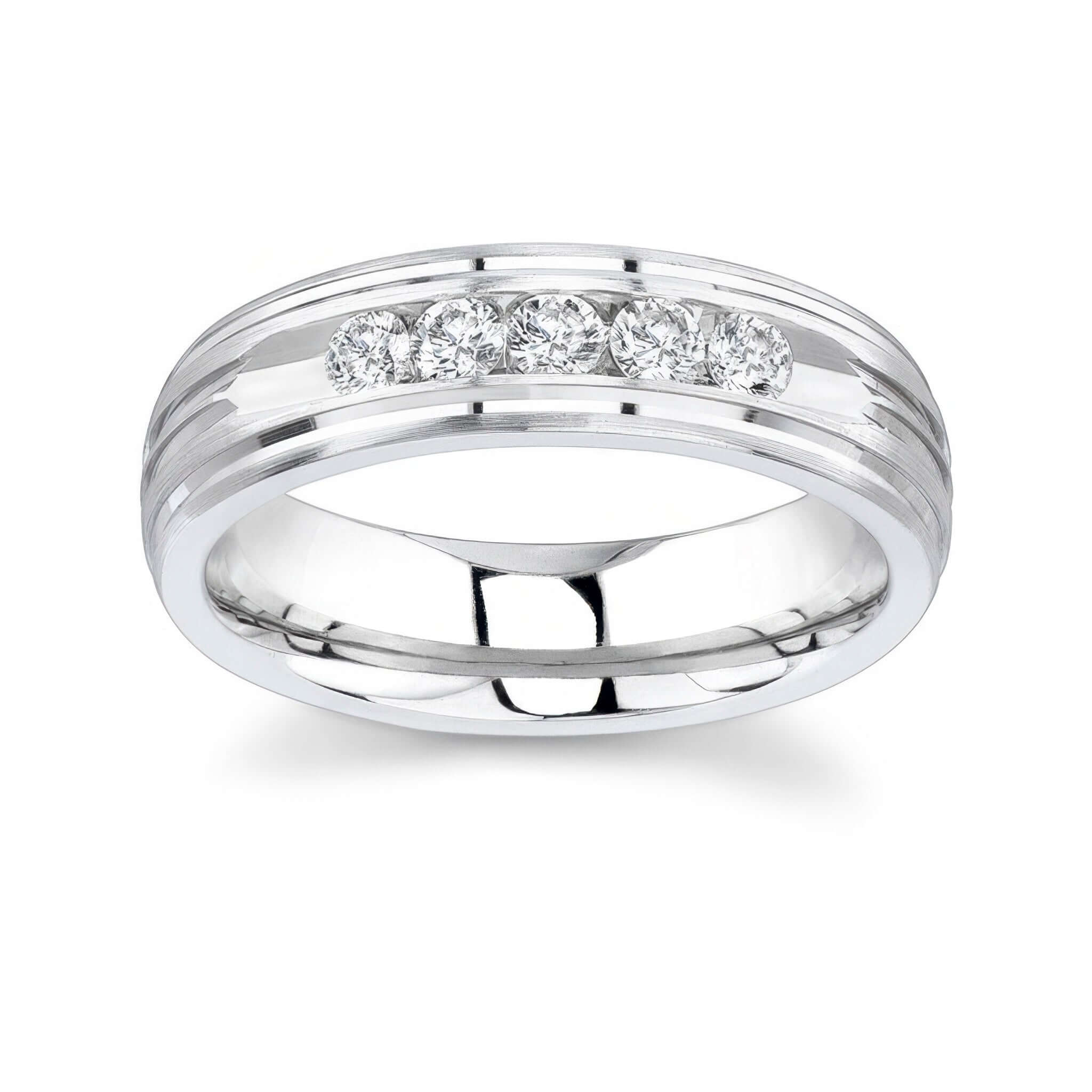 This classic men's diamond wedding band sports channel set diamonds adorning the bright polished shank.