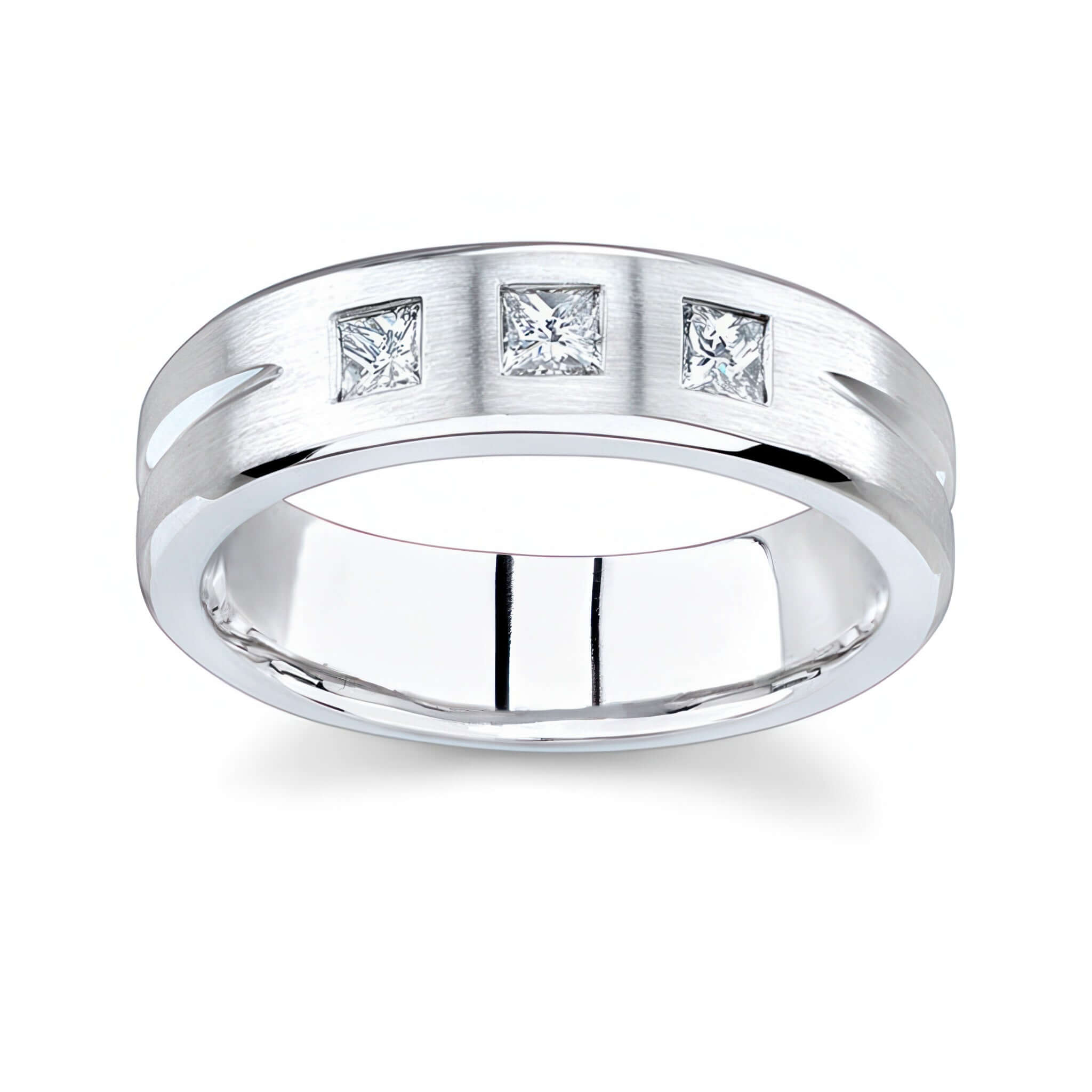 This mens unique diamond wedding ring sports three burnish set princess cut diamonds and a polished band.