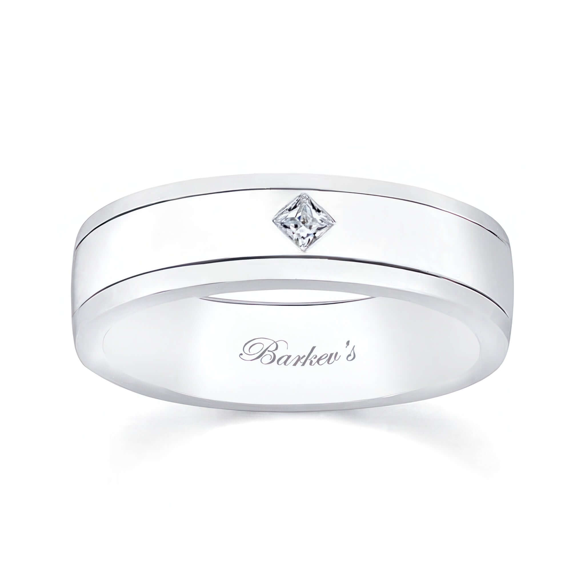 This mens princess cut diamond wedding band sports a comfort fit shank with a burnish set diamond. Also available in two tone rose or yellow gold.