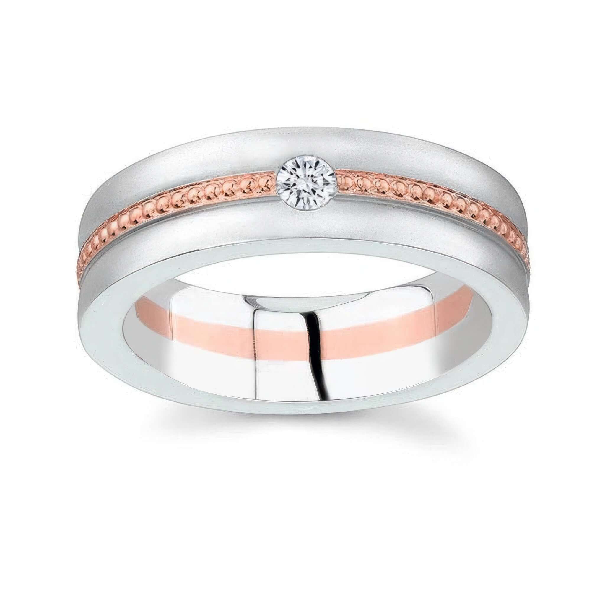 This mens milgrain wedding band features an inner accent with a milgrain finish and a single burnish set round diamond.
