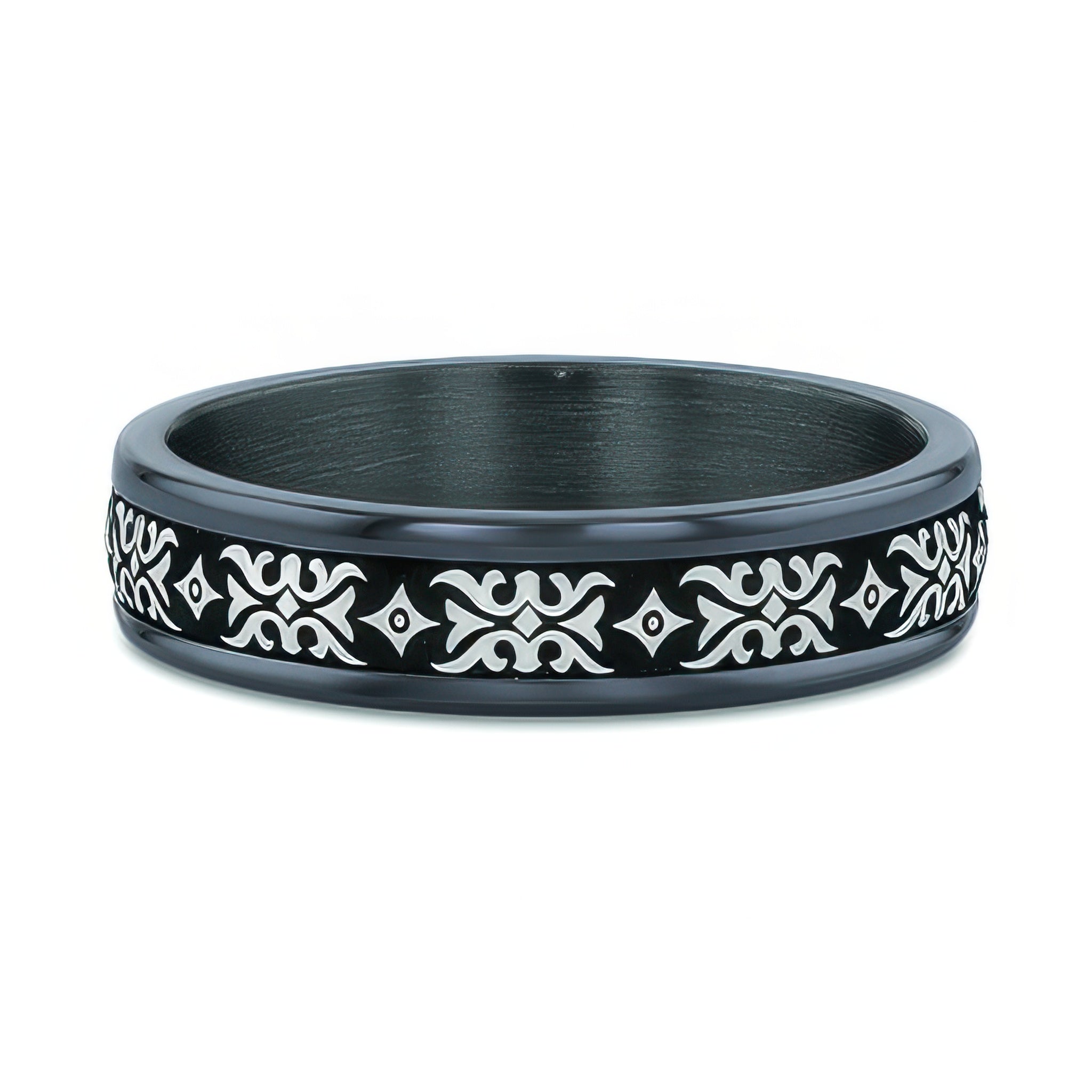 This 5mm wide wedding band crafted from durable tantalum offers lasting strength with a refined aesthetic. Its intricate ornate patterns, highlighted in contrasting white gold, create a distinguished look that balances masculinity with elegance, making it an excellent choice for the modern groom seeking both resilience and style in a ring.