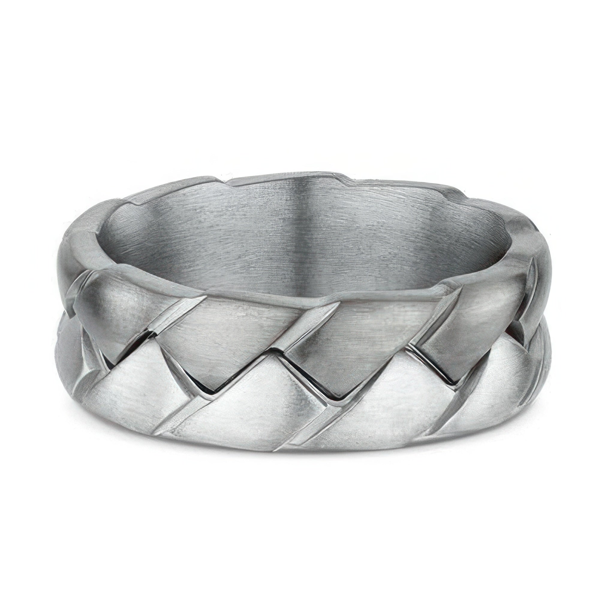 Strength and style meet in this men's 7mm woven titanium and white gold band. The bold woven design highlights a mix of brushed and polished finishes, giving the ring depth and texture. Durable titanium pairs with the brightness of white gold for a modern band built to last.