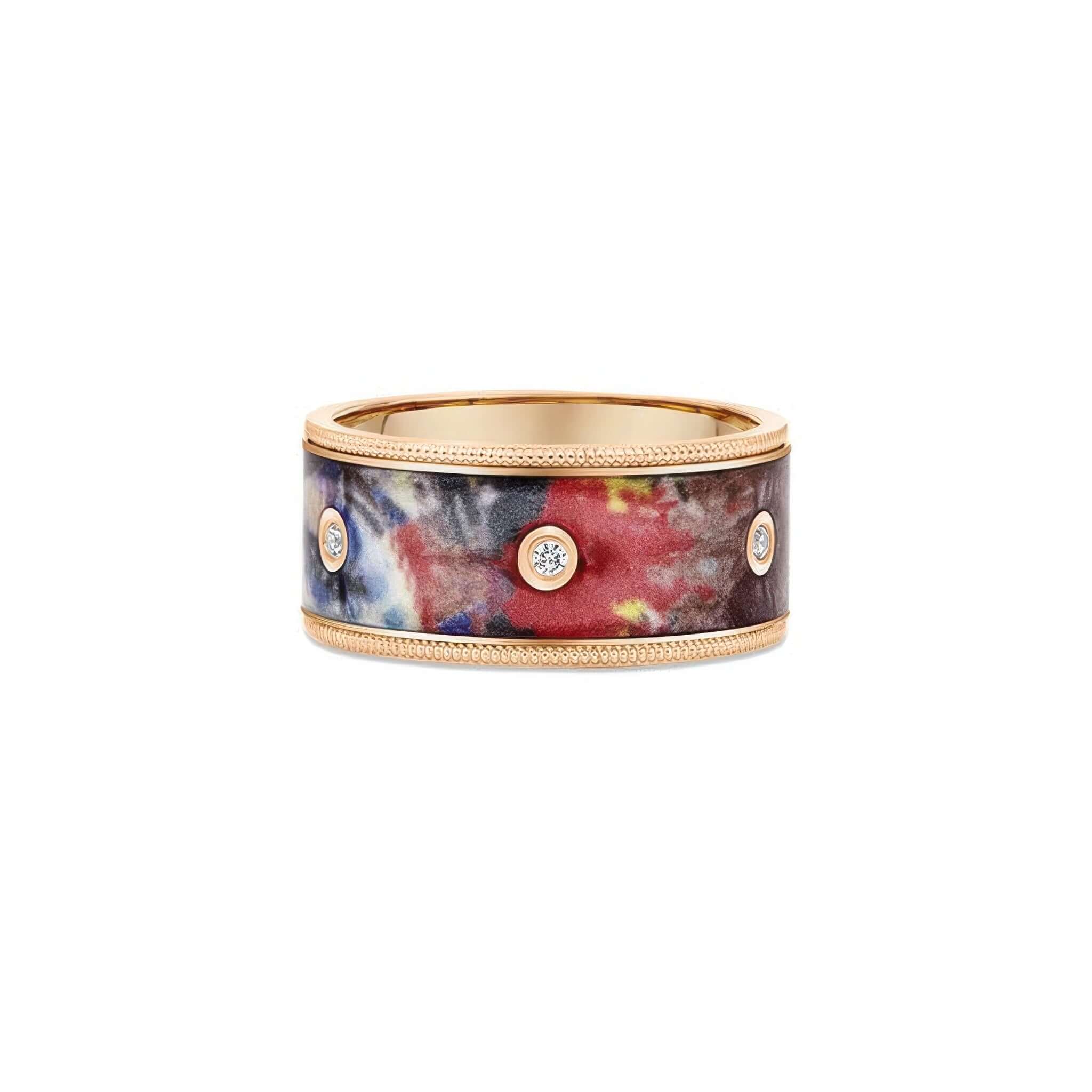 This unisex Dora 9mm eye pattern ceramic round shape bezel diamond milgrain band features a bold eye pattern design ceramic center section with prong set diamonds sitting inside a round shape bezel and a milgrain finish on the edges.