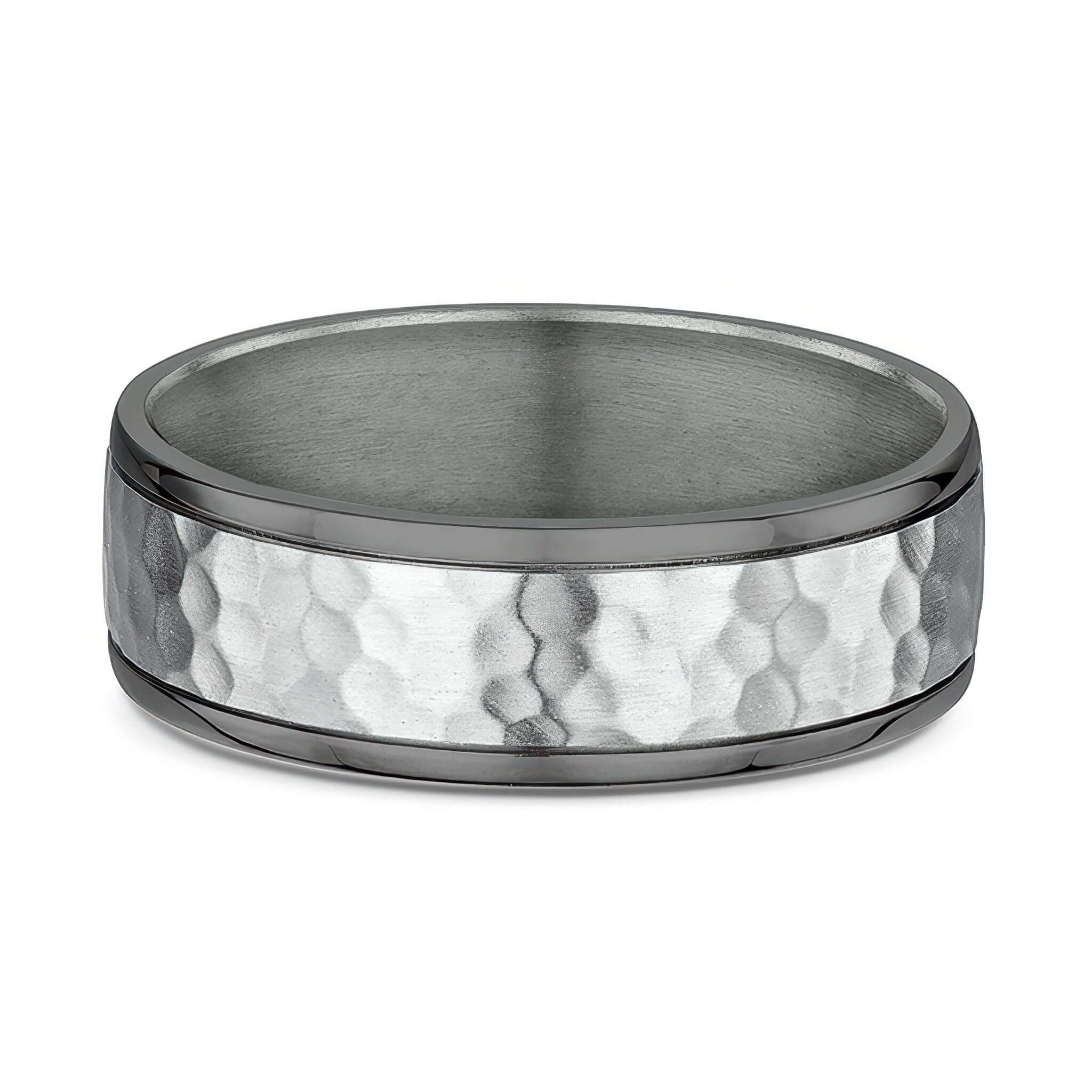 A unique looking Dora men's hammered white gold wedding band made from tantalum and a white gold hammered trim adorning the center.