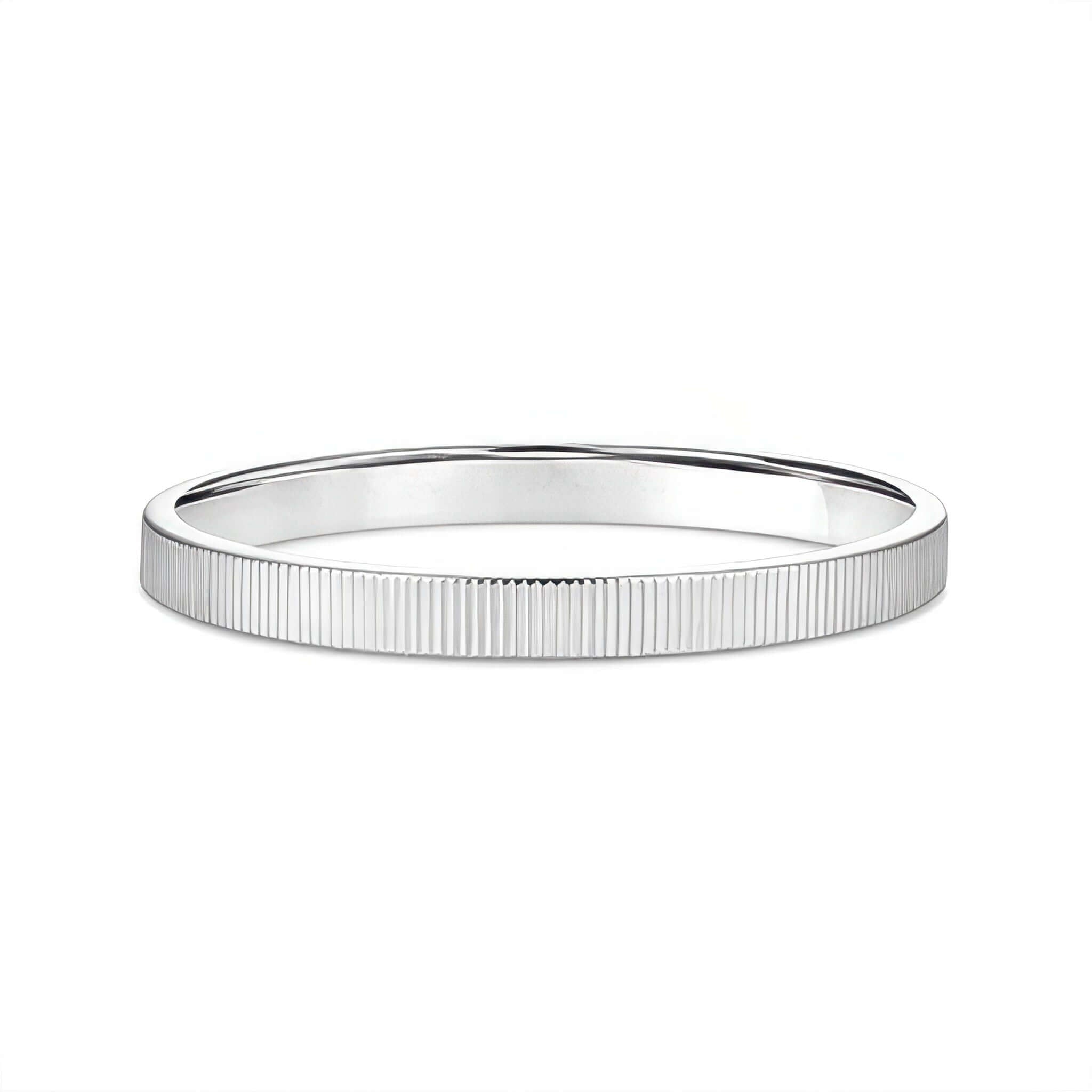 This men’s 2mm linear texture white gold wedding band features a refined linear texture that gives it a sleek and modern edge. The vertical ridges create a subtle pattern that catches light beautifully, adding depth without being flashy. Its slim profile and smooth inner surface make it comfortable for everyday wear, perfect for men who appreciate understated sophistication with a touch of detail.