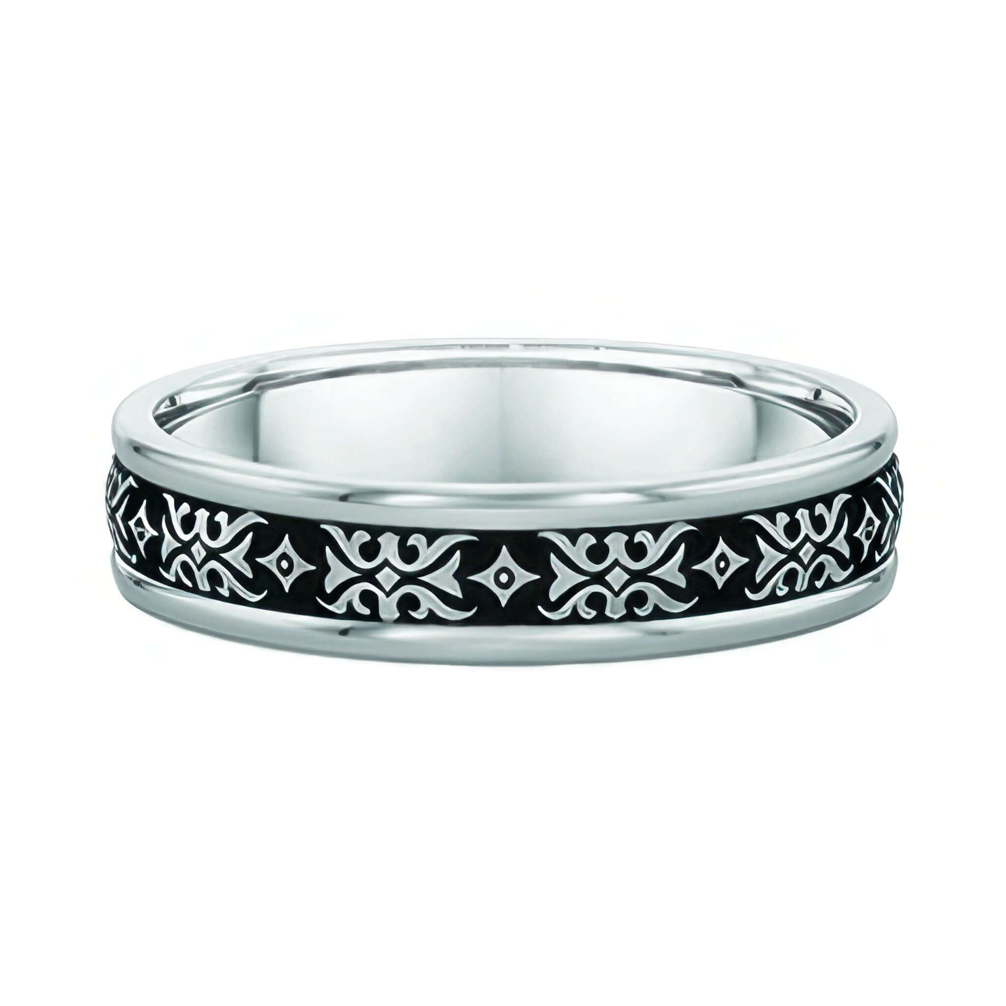 This 5mm white gold wedding band features an intricate ornate pattern, combining classic elegance with refined craftsmanship. Its durable design ensures lasting wear, while the detailed engraving adds a sophisticated touch suitable for men seeking a timeless yet distinctive symbol of commitment. Crafted from high-quality white gold, this band offers both resilience and a polished, luxurious finish.