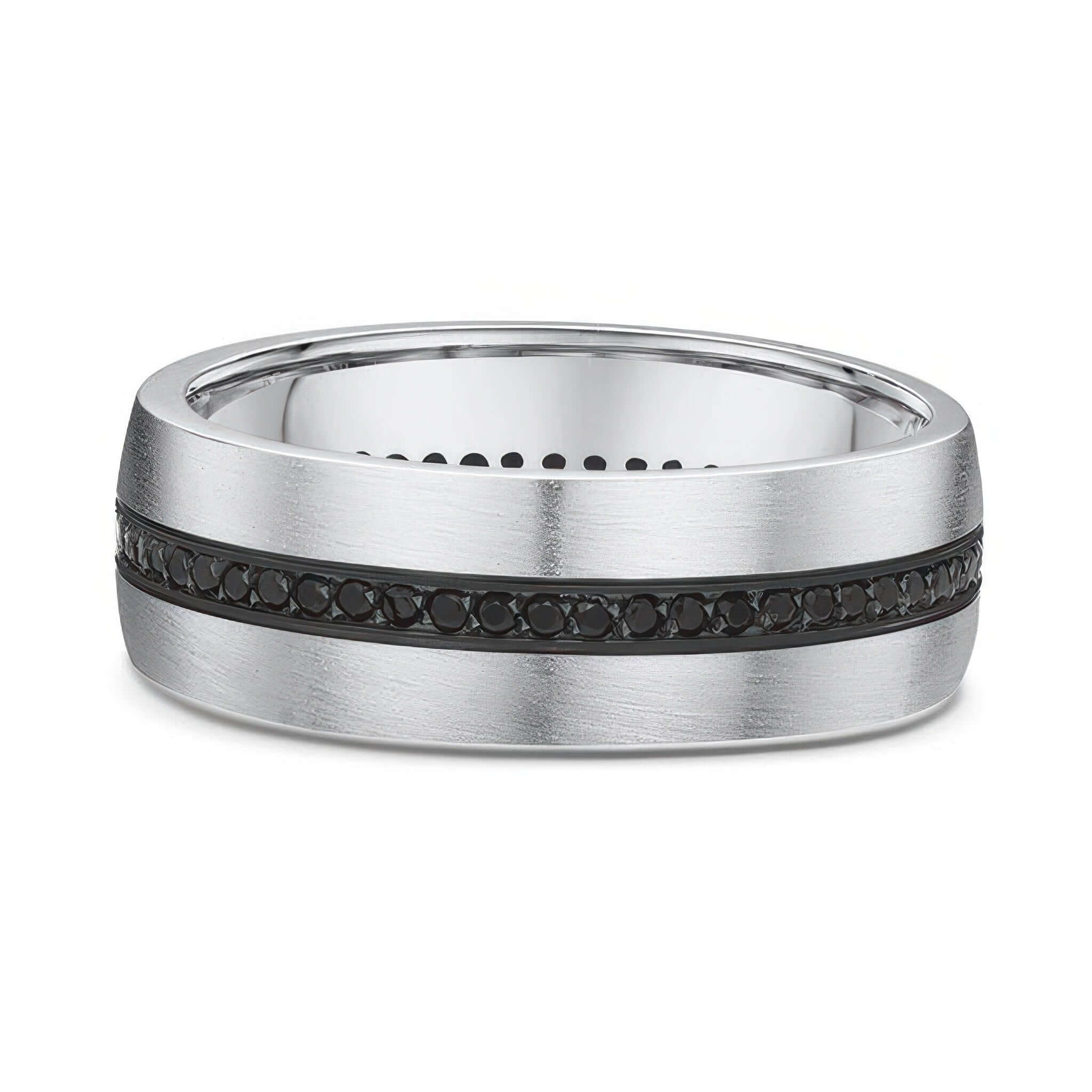 A Dora men's black diamond trim wedding band with a brushed white gold finish and a black diamond trim in the center.
