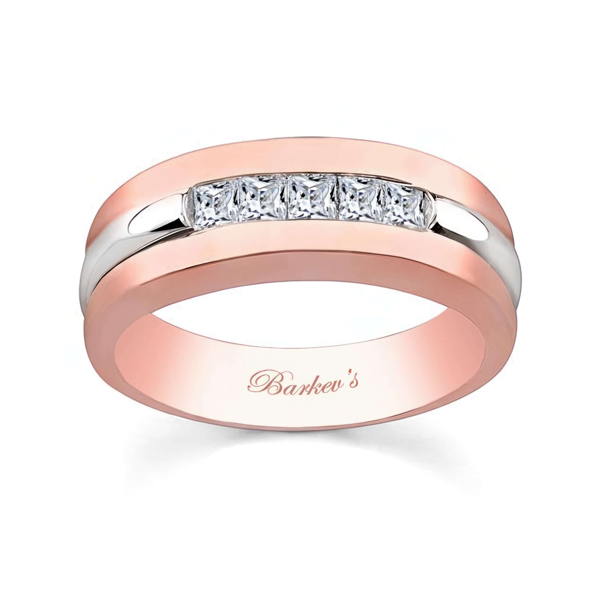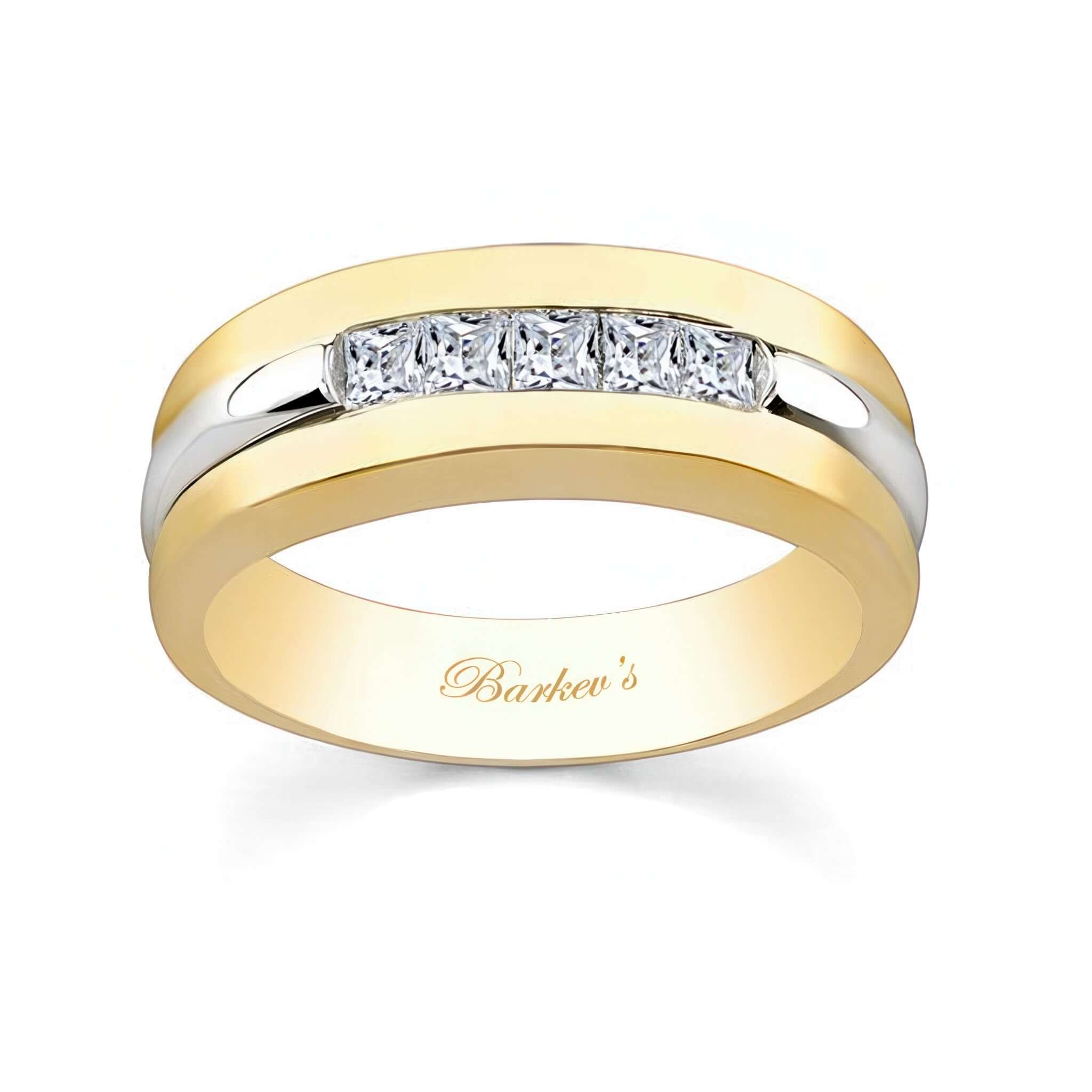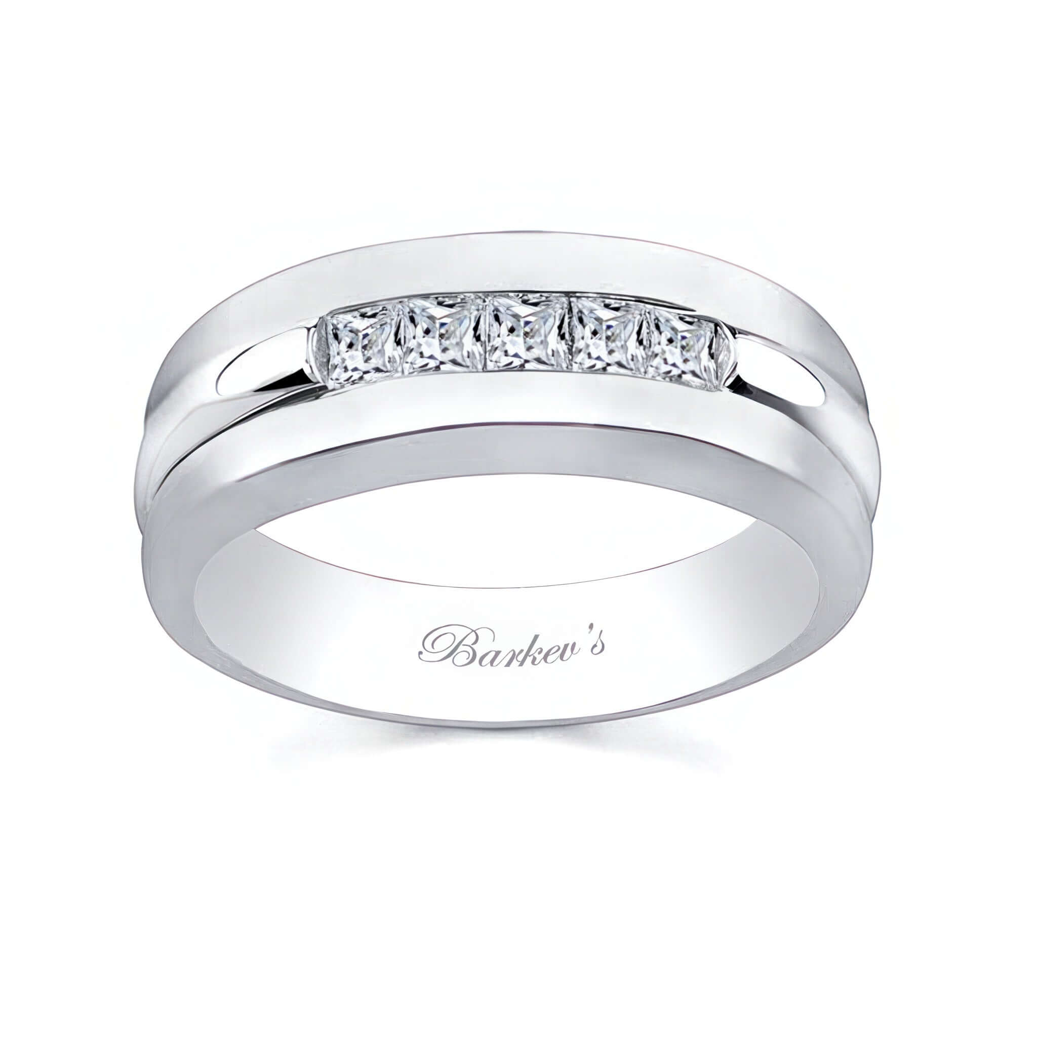 This mens princess cut wedding band features a row of channel set diamonds and an accent trim cascading down the shoulders.