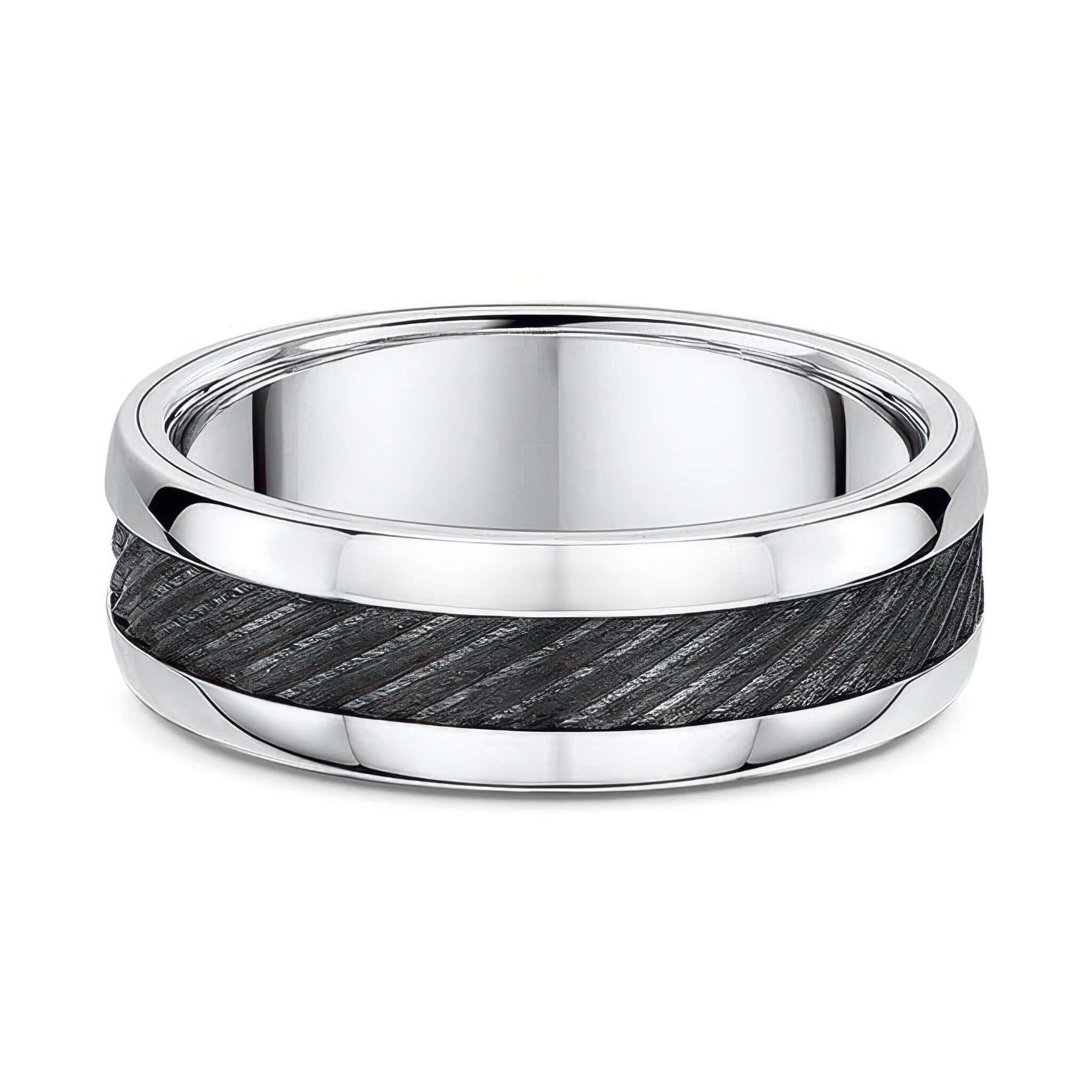 This Dora men's textured wedding band features a beautiful polished white gold band with a textured carbon fiber center.