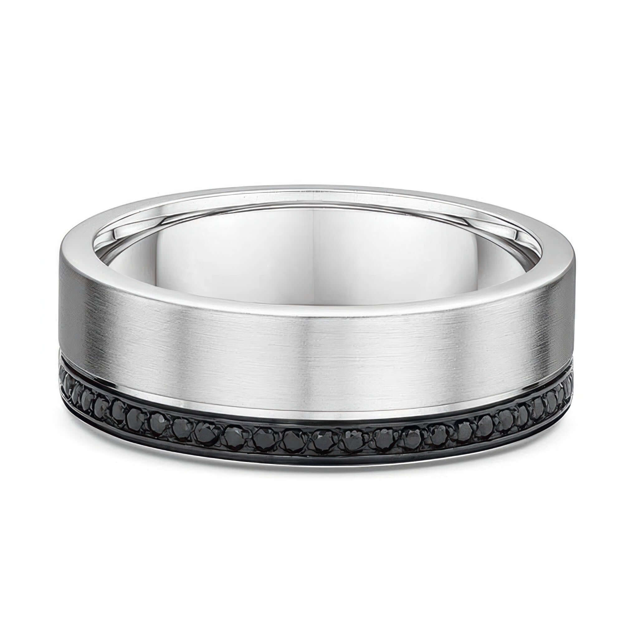 A classic Dora men's offset black diamond wedding band with a brushed white gold finish and a thin offset trim of black diamonds.