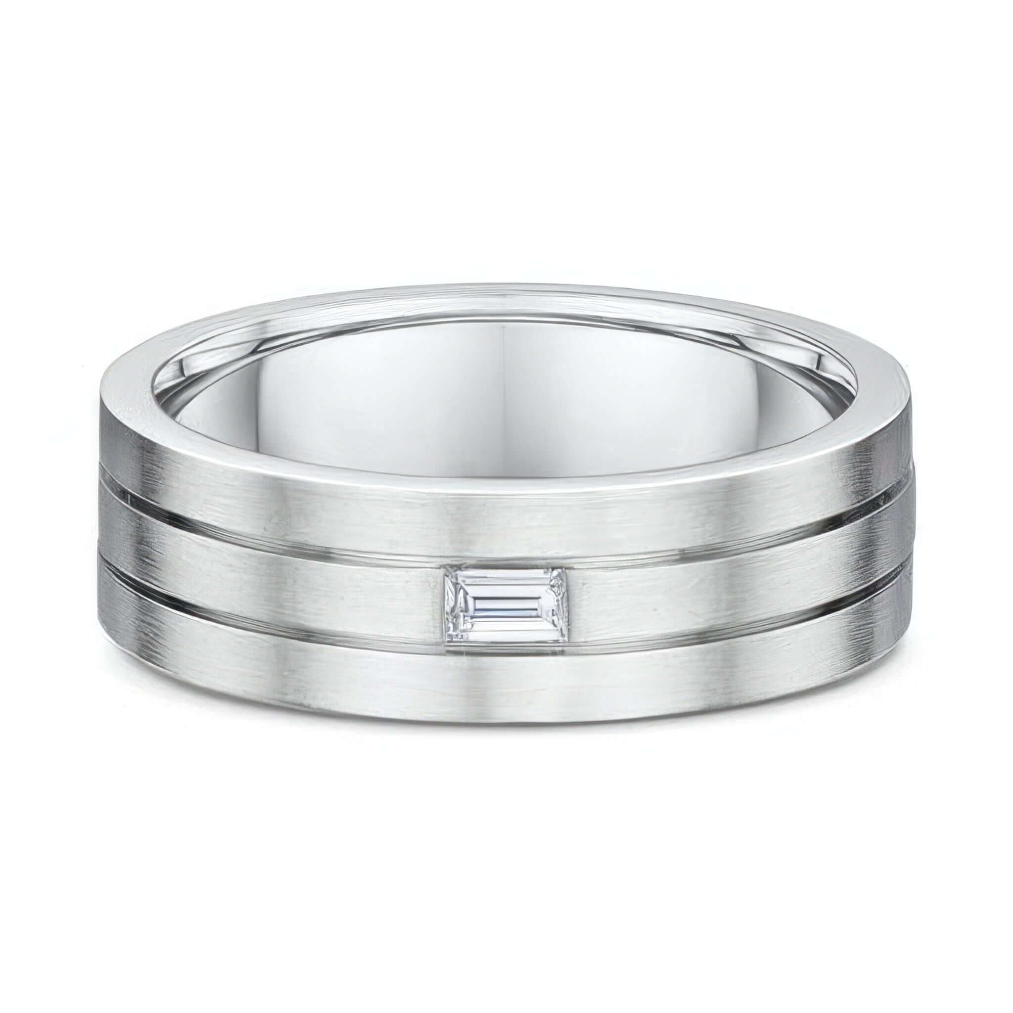 This Dora men's slotted straight baguette diamond wedding band features a beautiful slotted design and a straight baguette for extra sparkle.