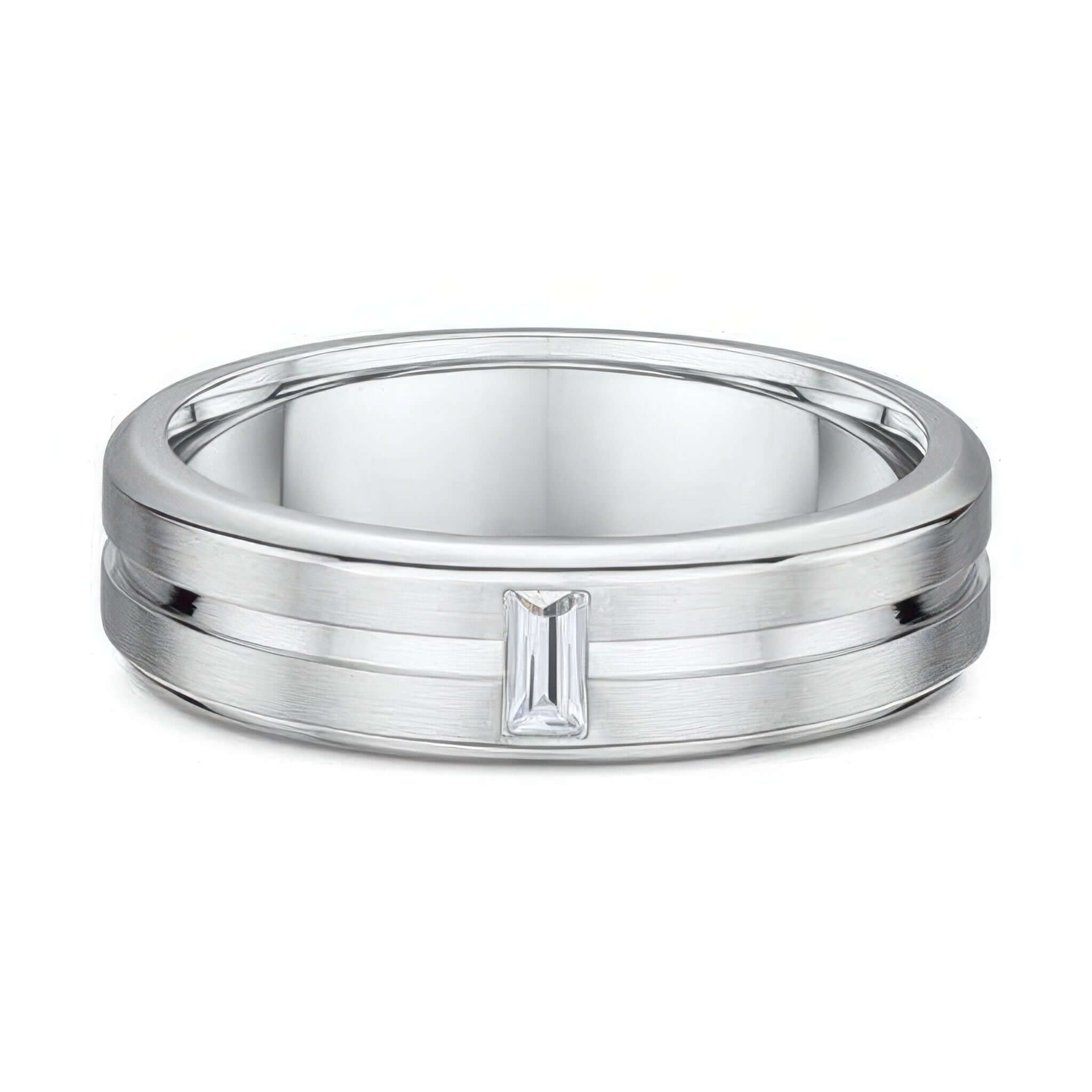 This Dora men's straight baguette wedding band features smooth beveled edges, a slot in the center and a beautiful straight baguette diamond for extra sparkle.