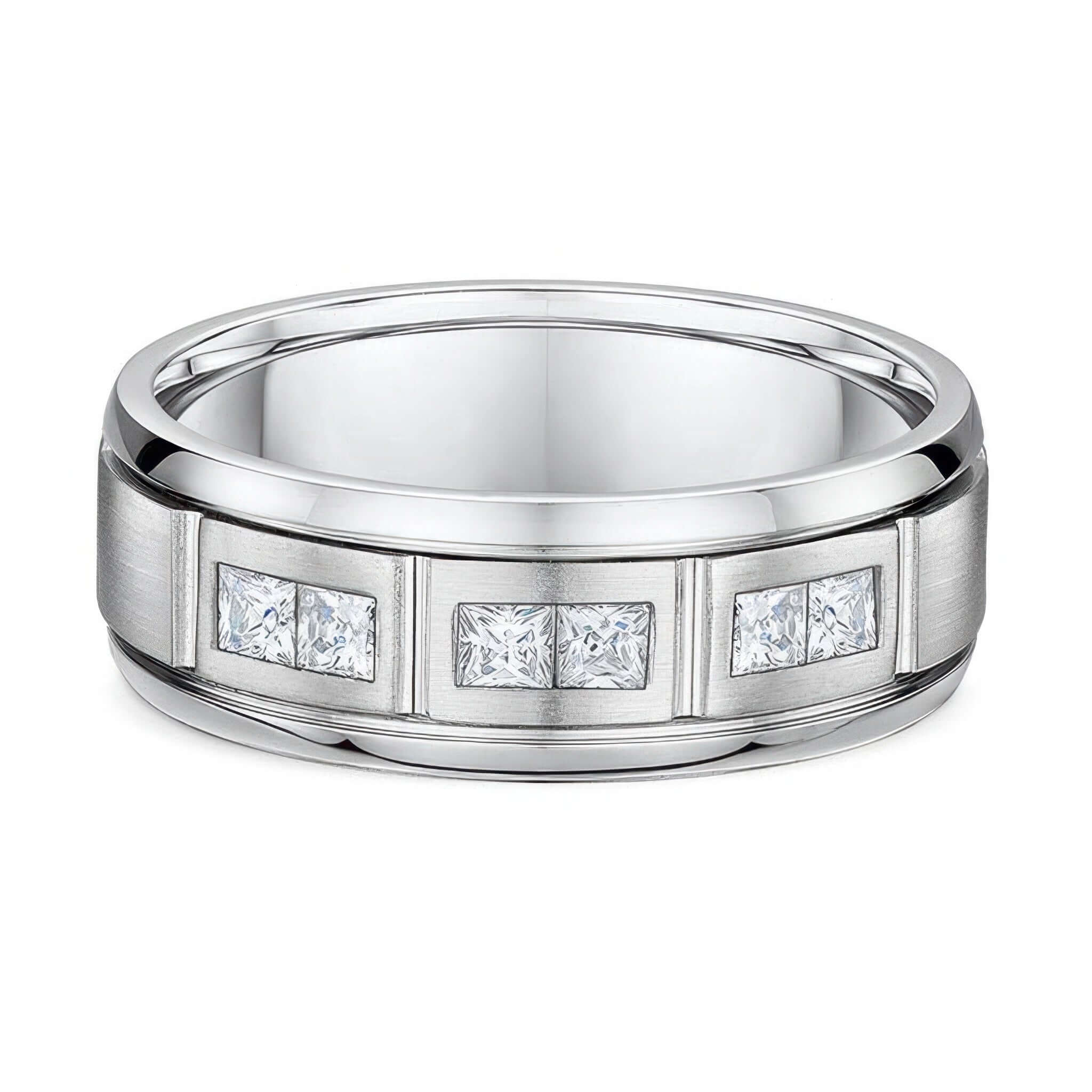 This Dora unique men's princess cut diamond wedding band features a raised center pattern and princess diamonds for a special elegant look.