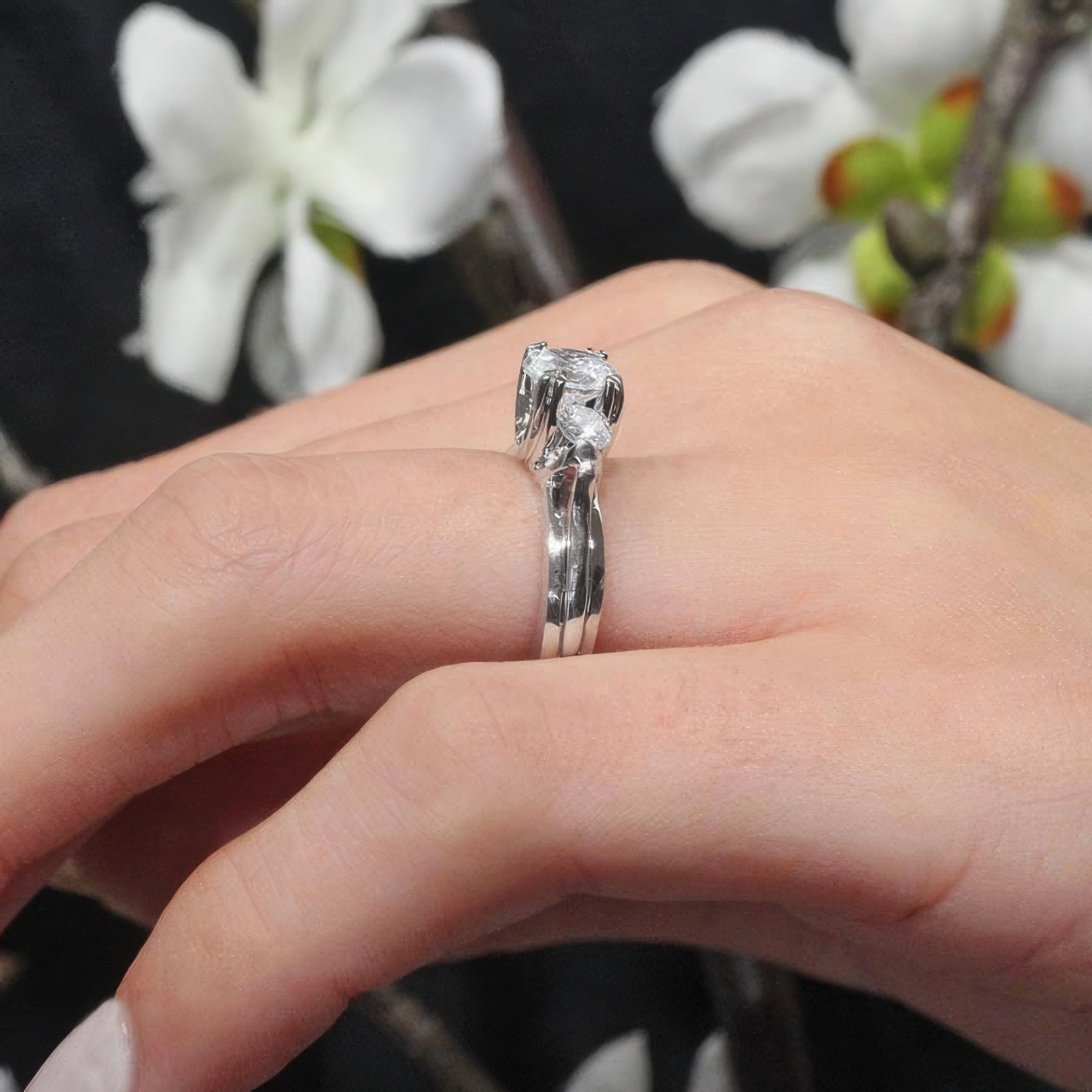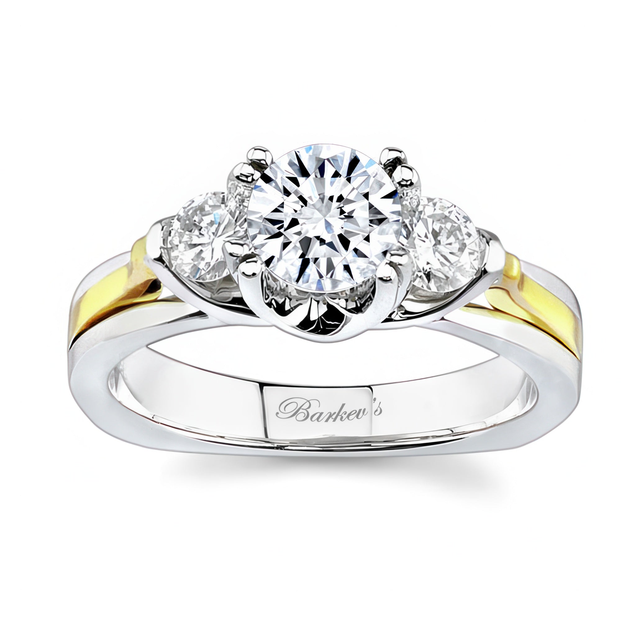 This sophisticated 1 carat 3 stone moissanite ring features an unusual criss cross prong setting holding the round center with smaller flanking diamonds against it's sides.