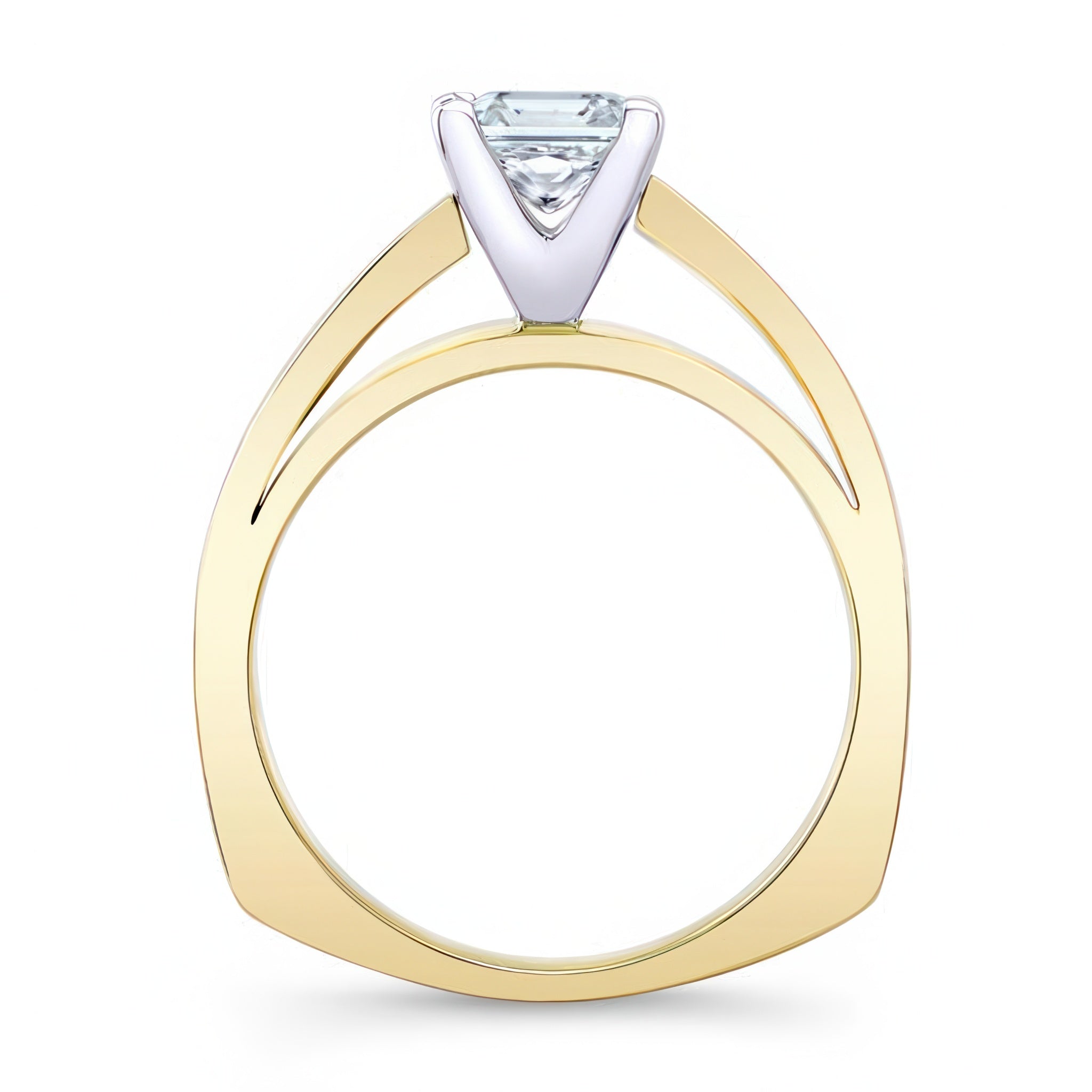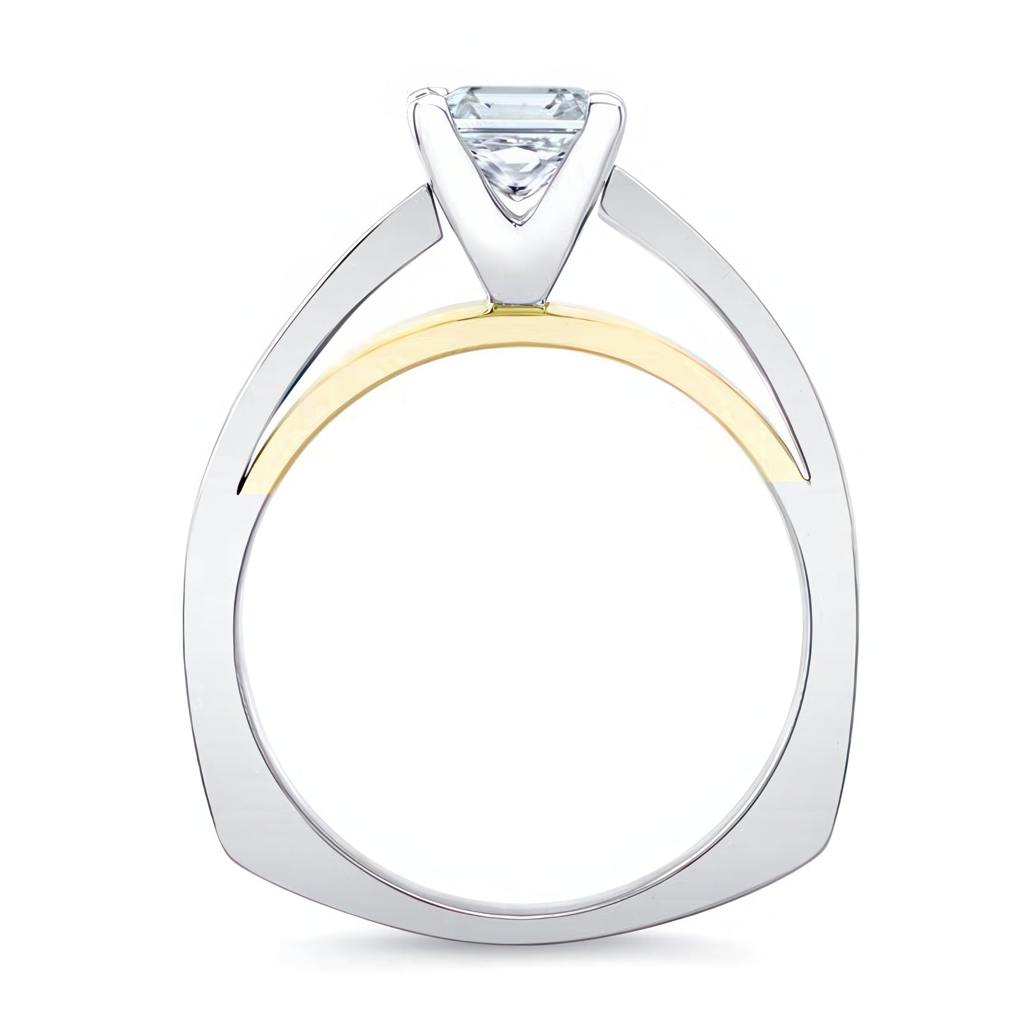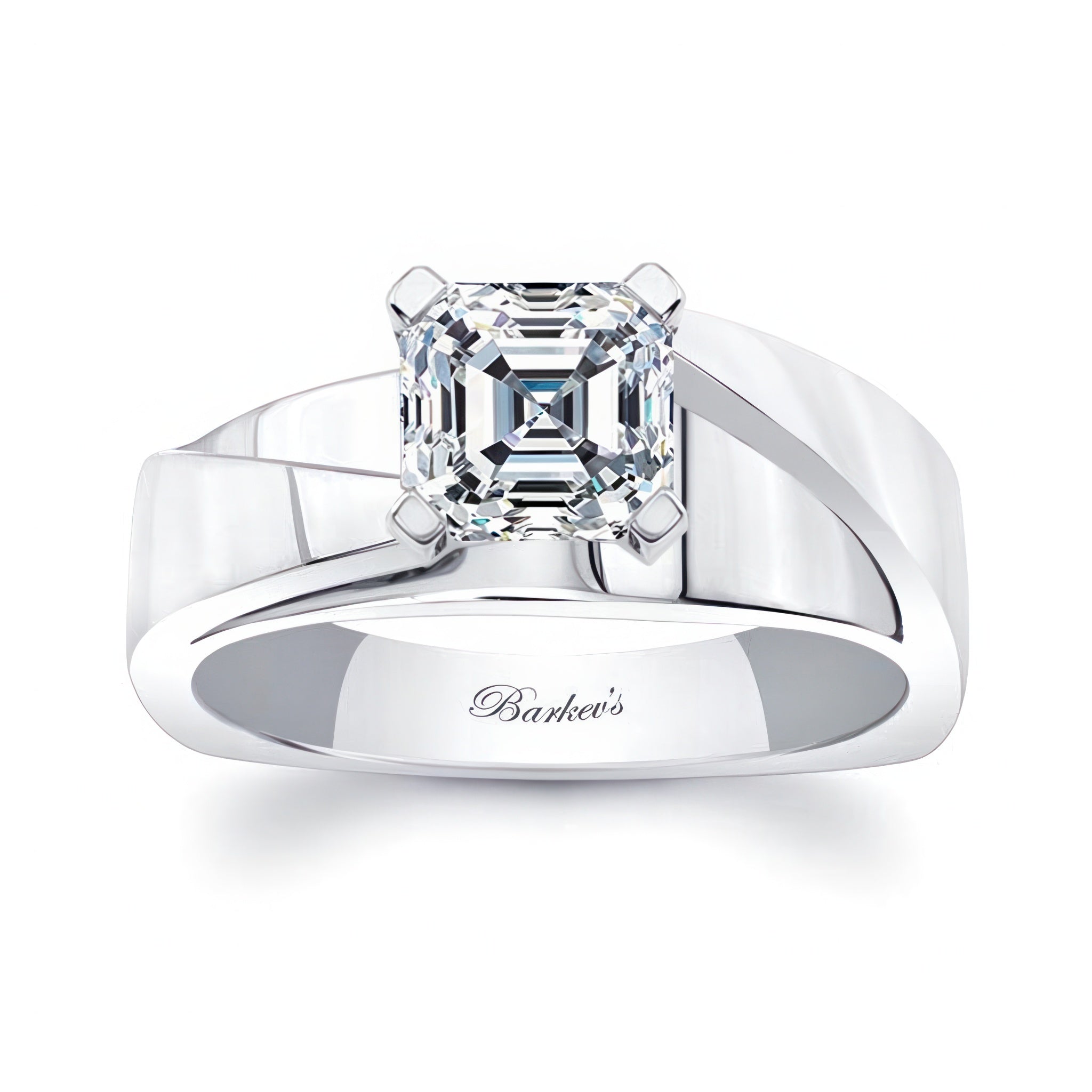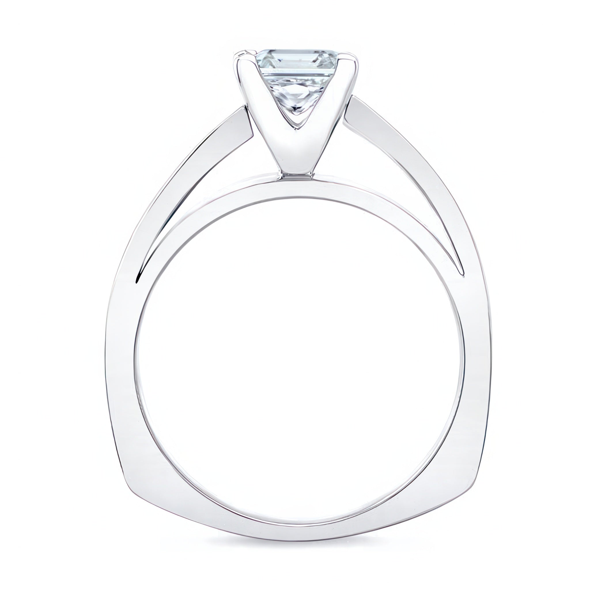 This 1 carat asscher moissanite solitaire ring features a prong set asscher cut center with a bridge running under it and a wide shank.