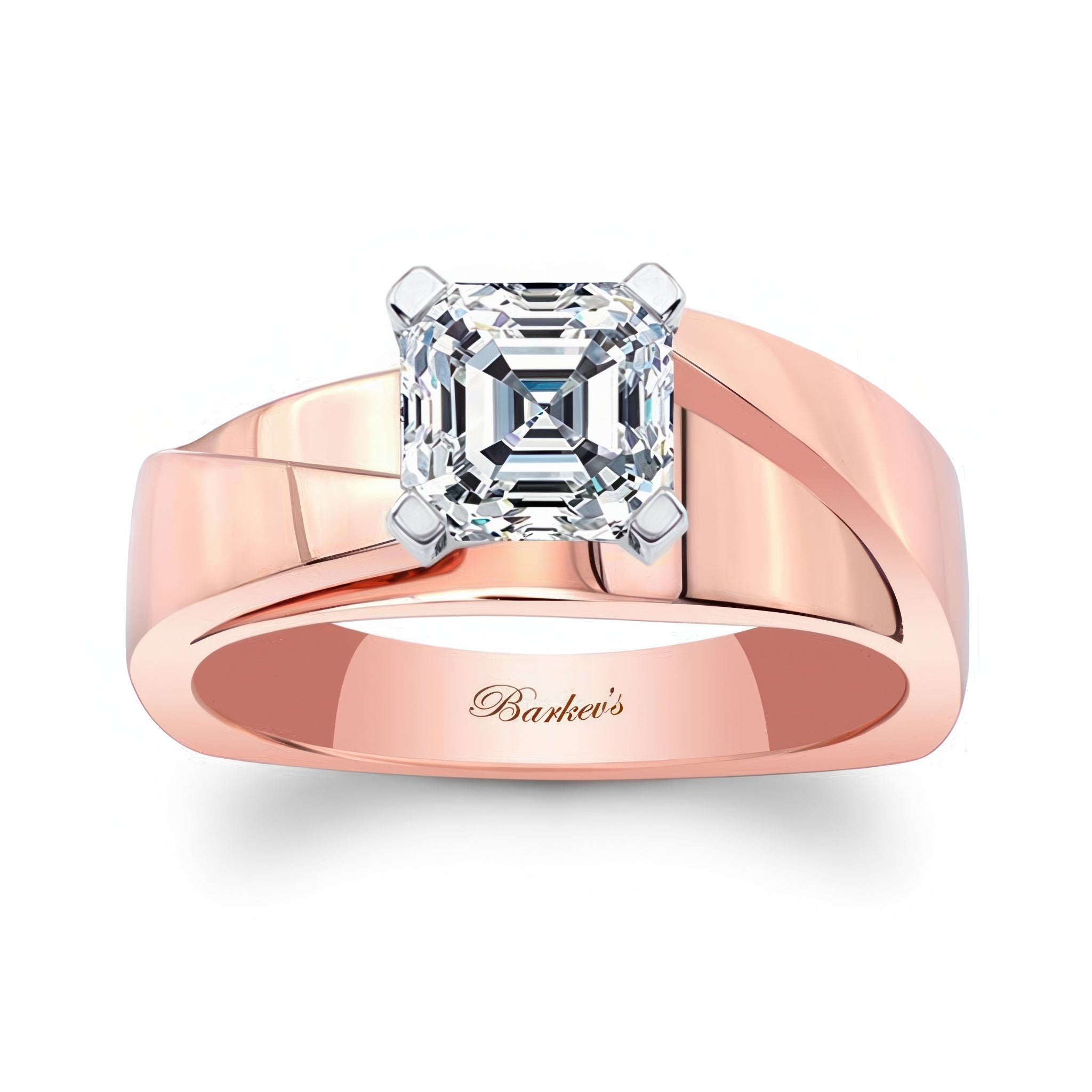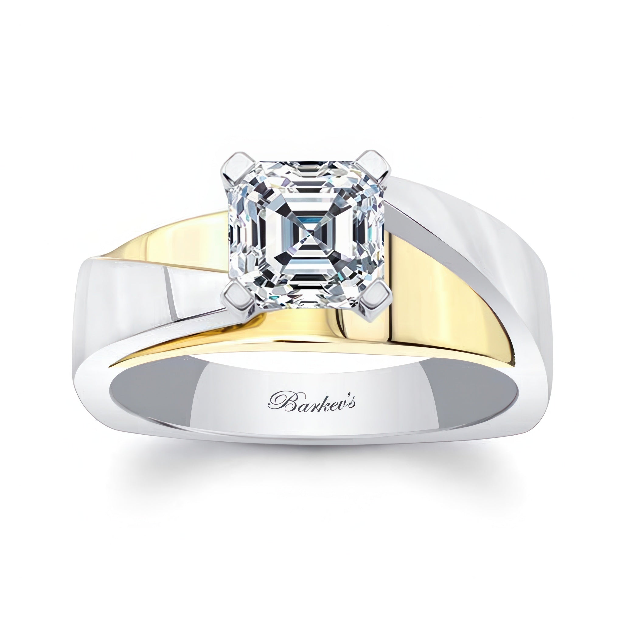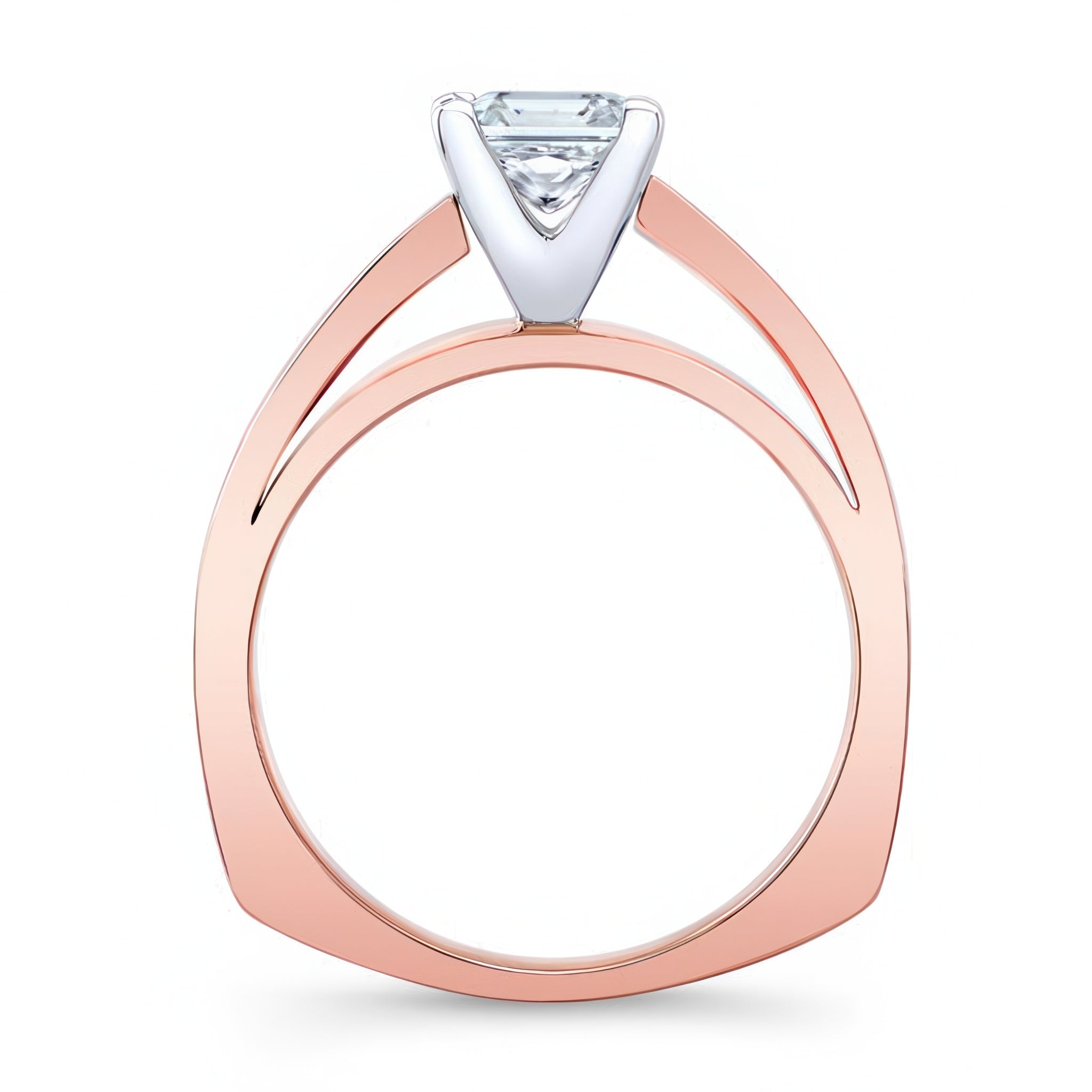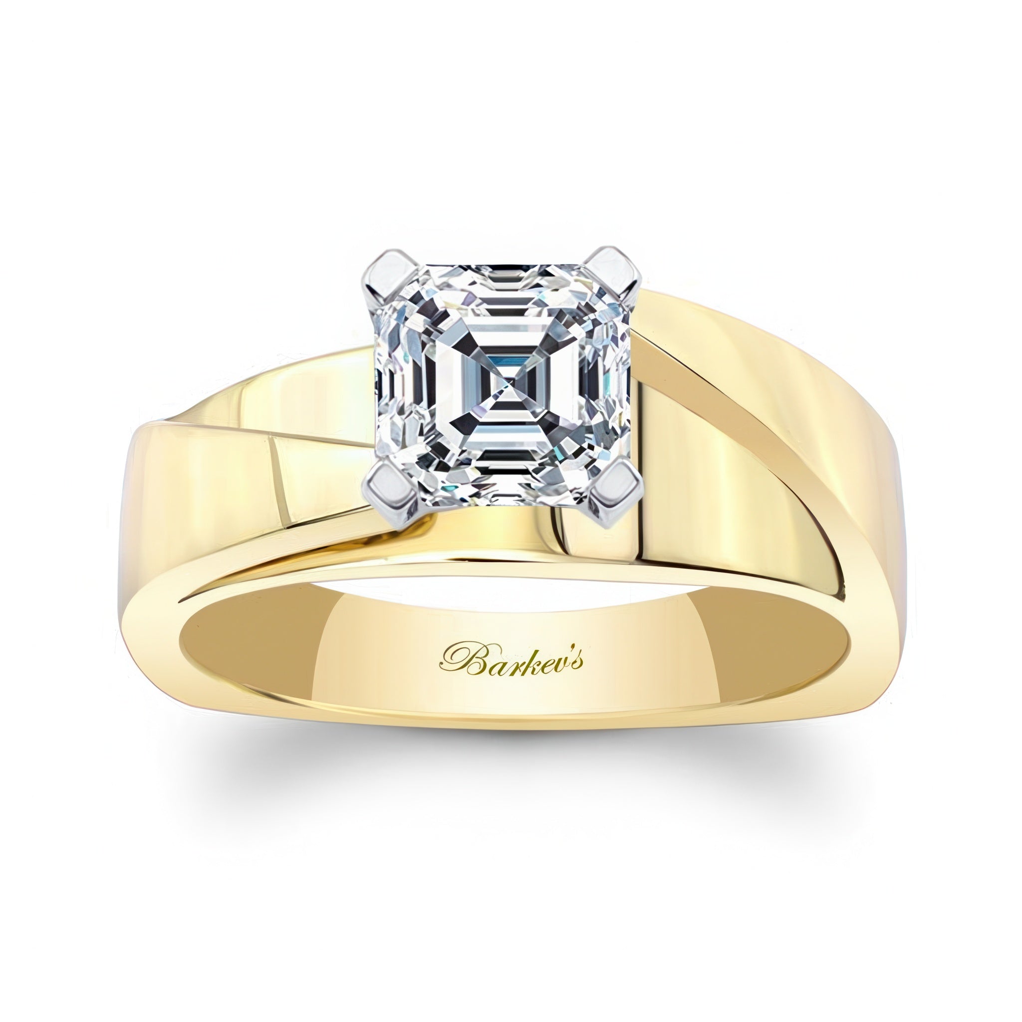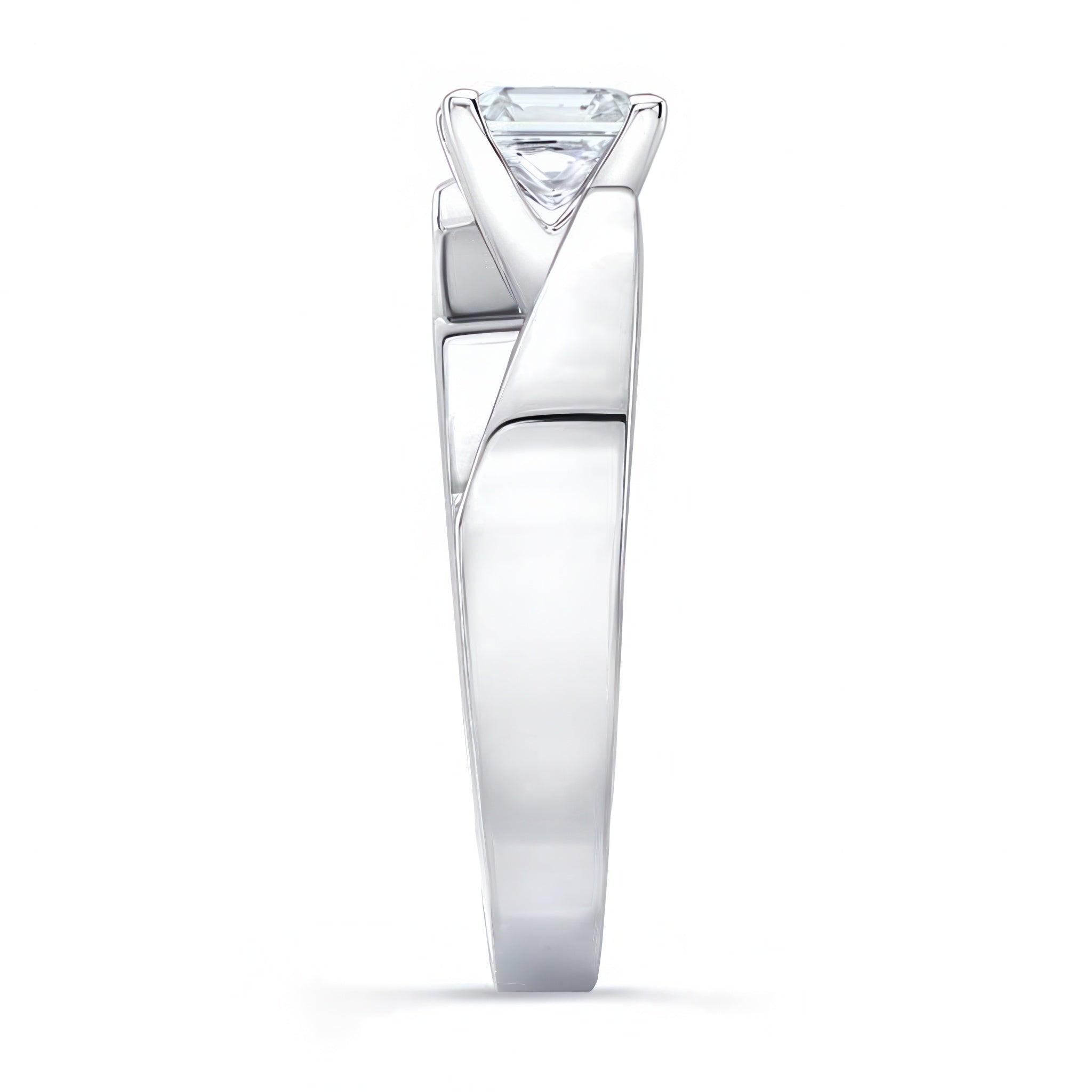 This 1 carat asscher moissanite solitaire ring features a prong set asscher cut center with a bridge running under it and a wide shank.