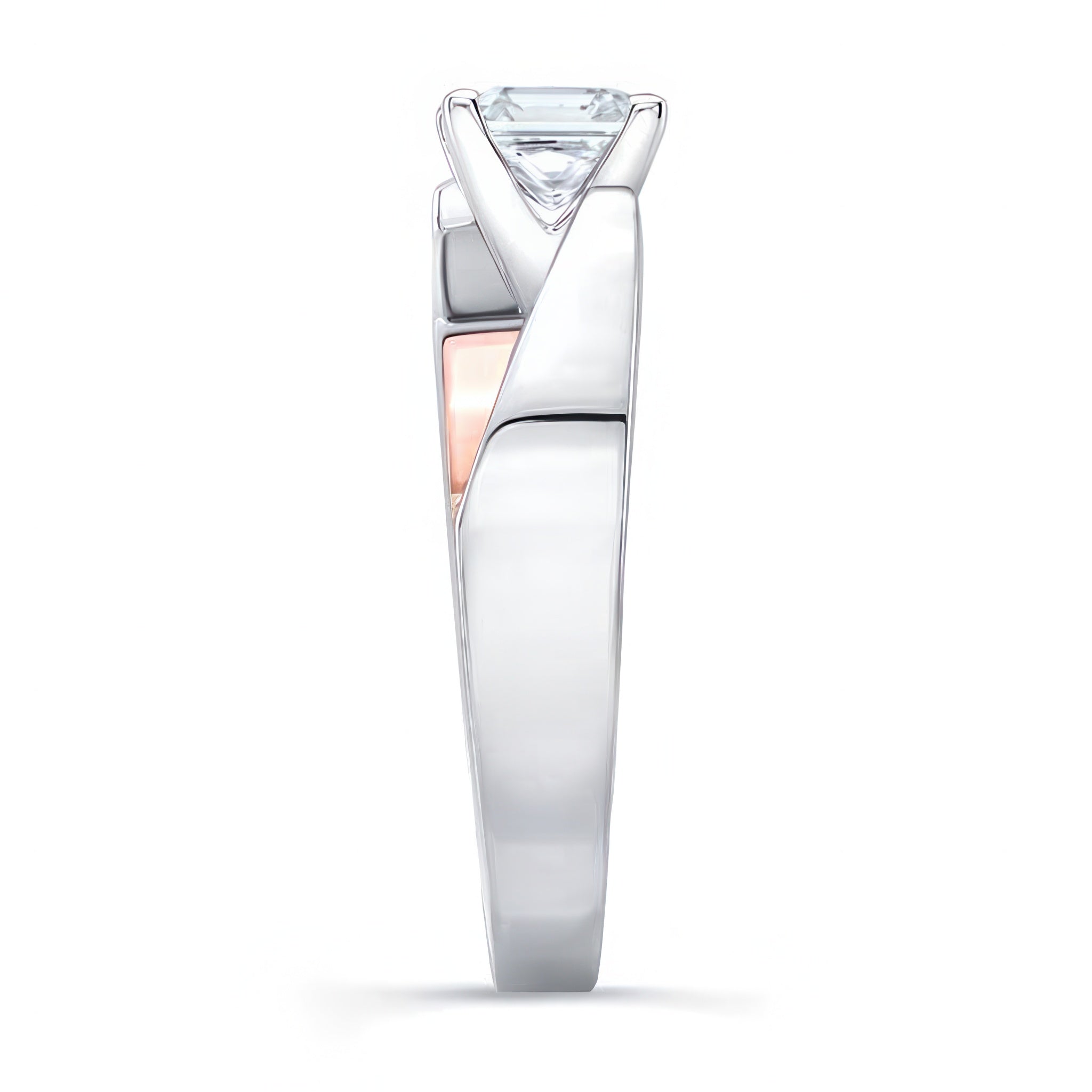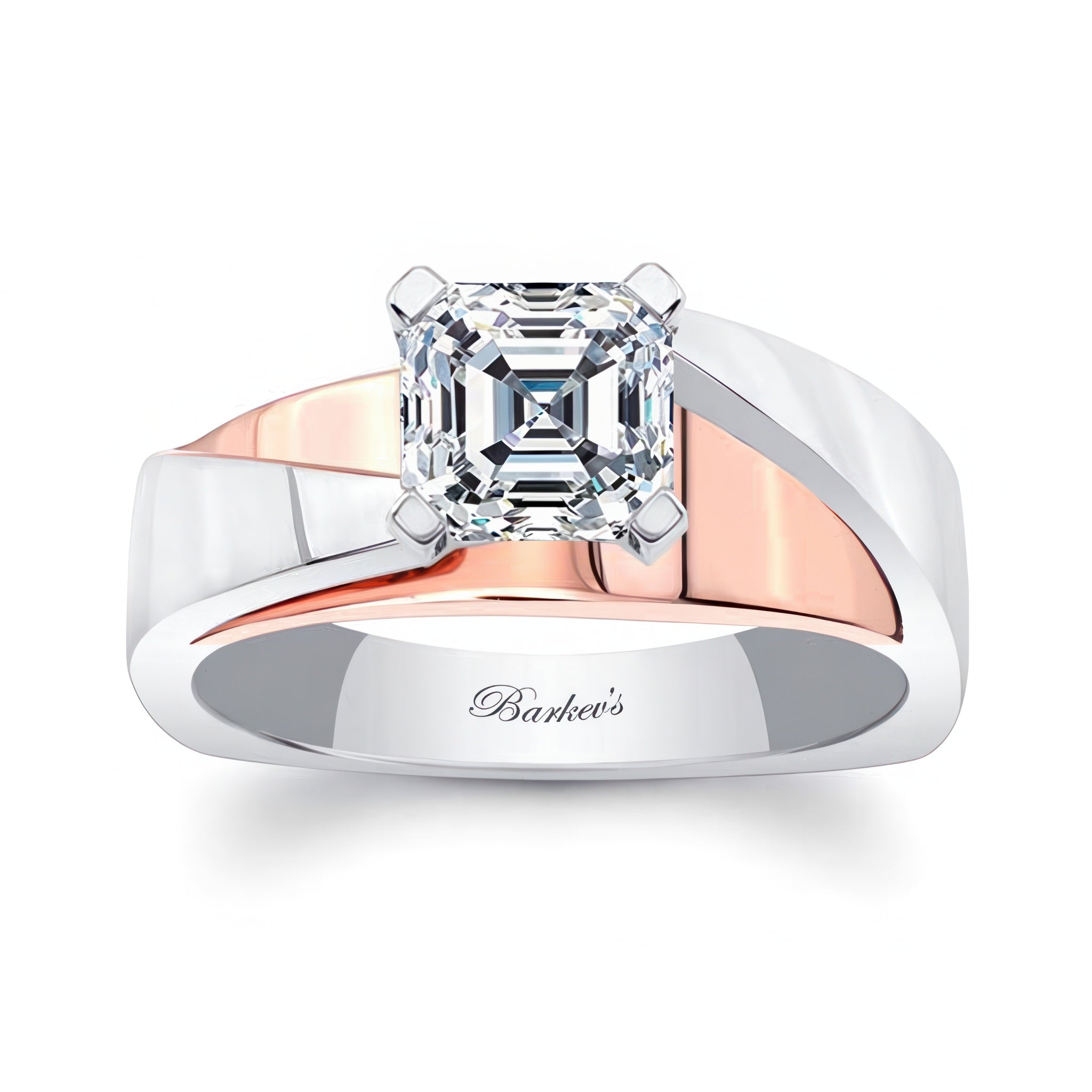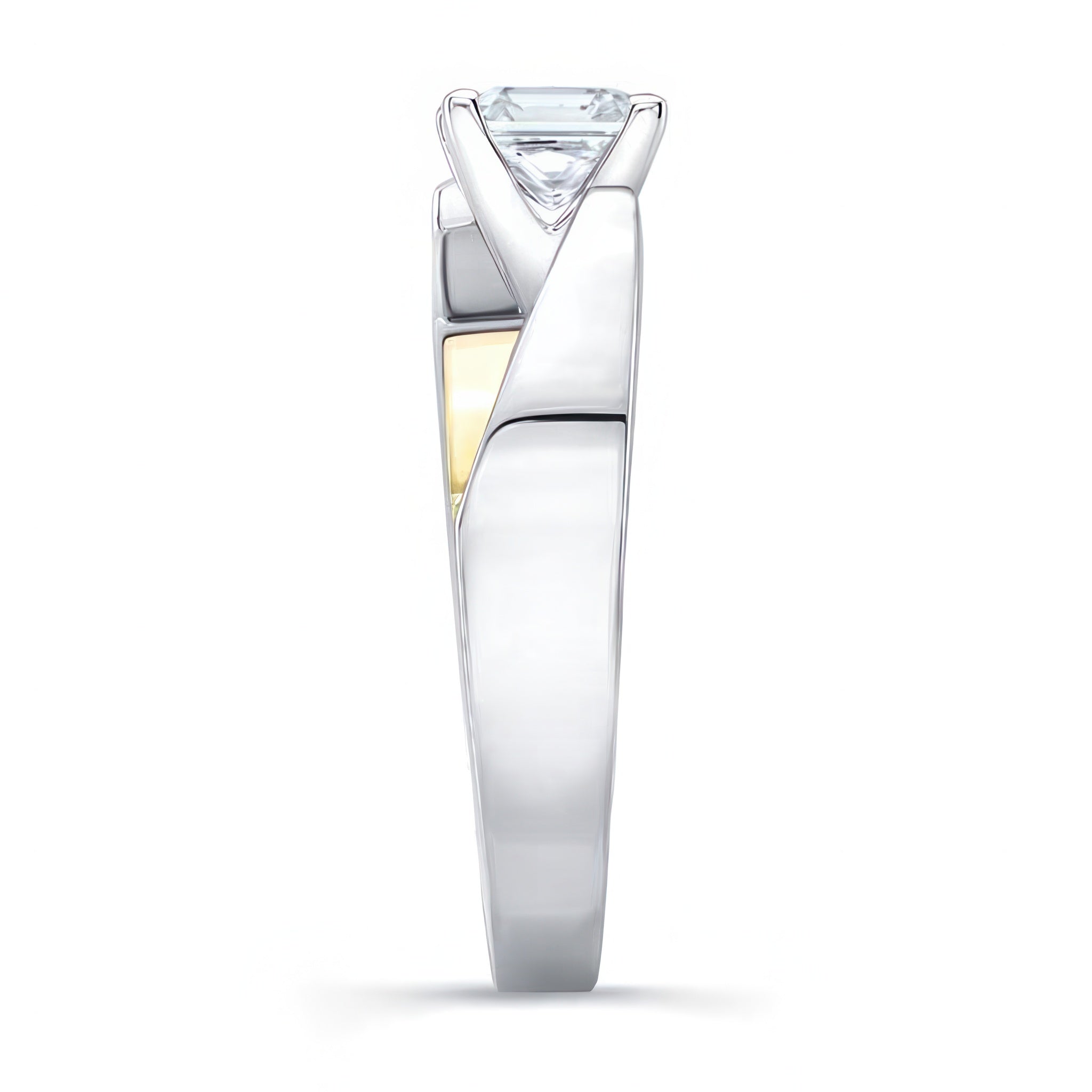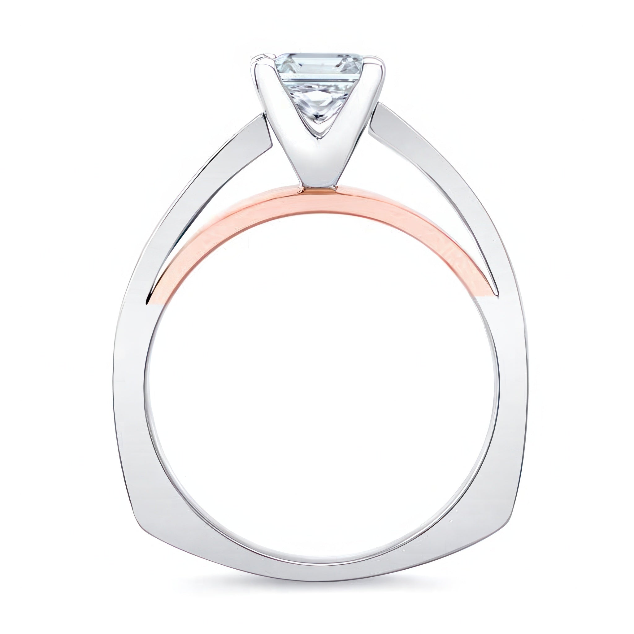 This 1 carat asscher moissanite solitaire ring features a prong set asscher cut center with a bridge running under it and a wide shank.