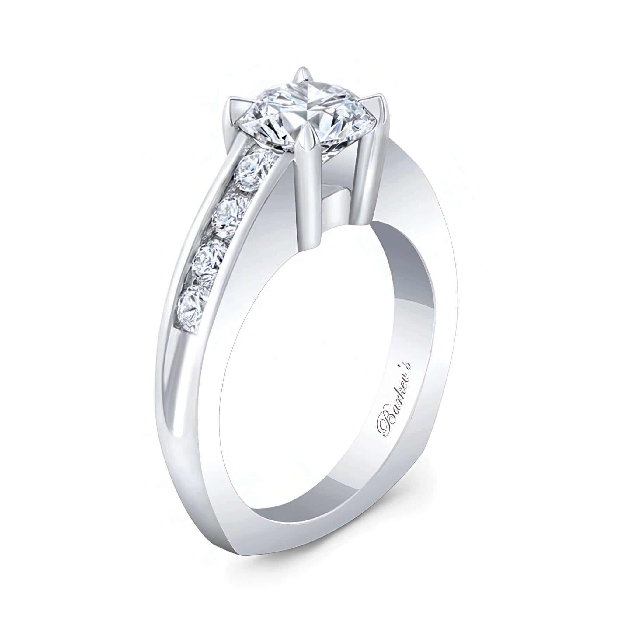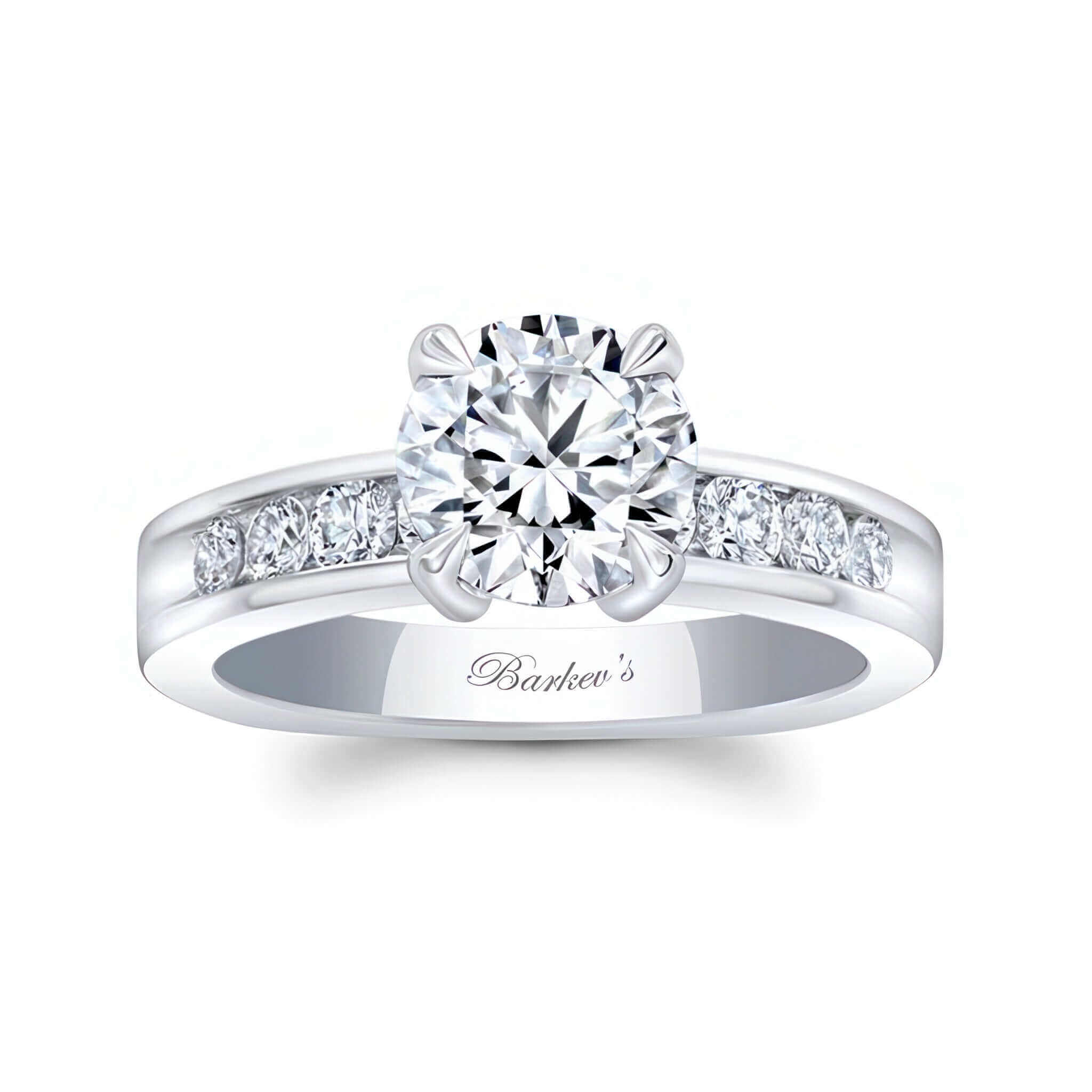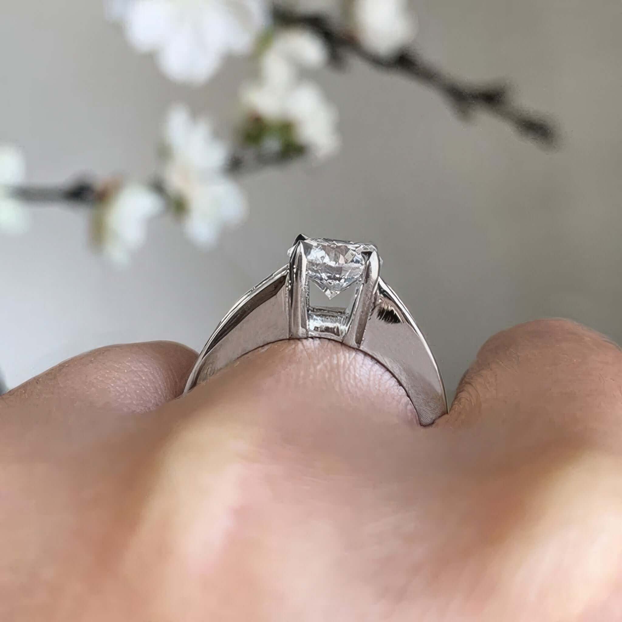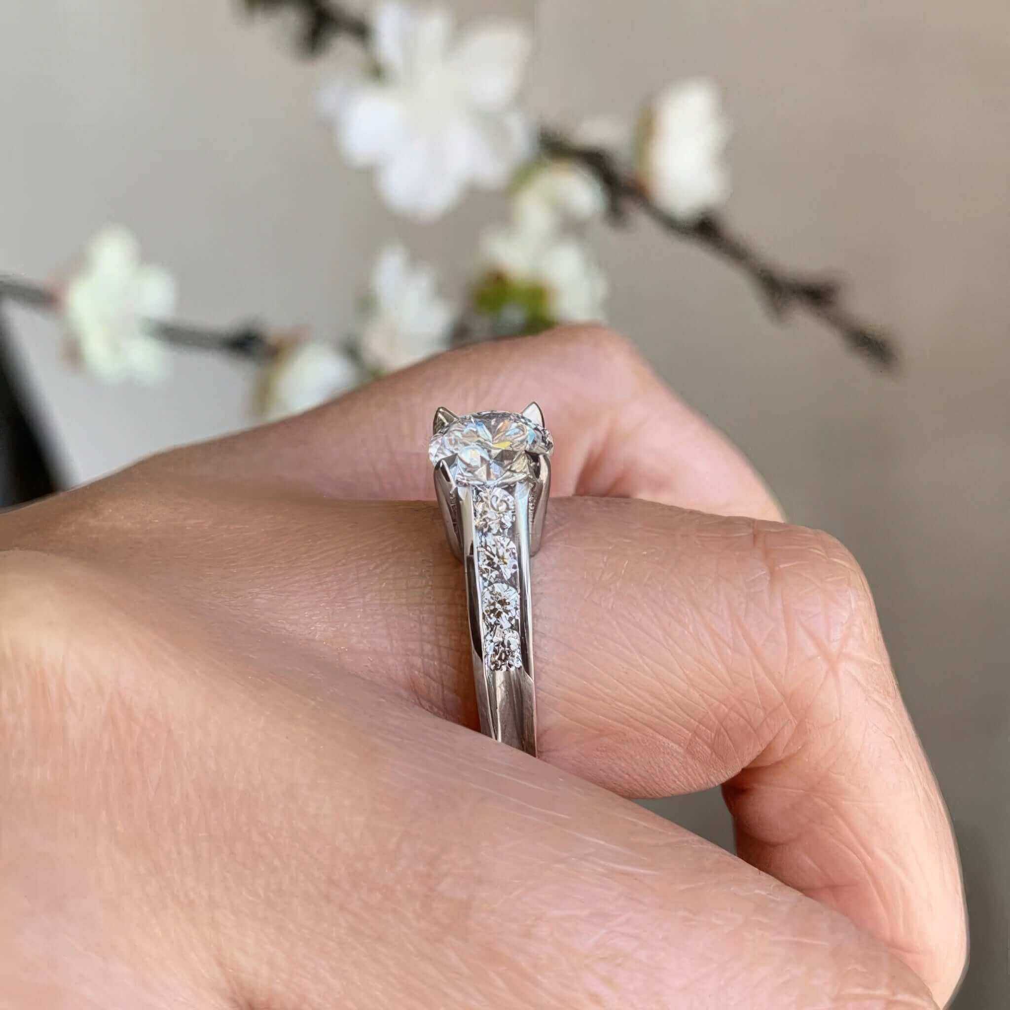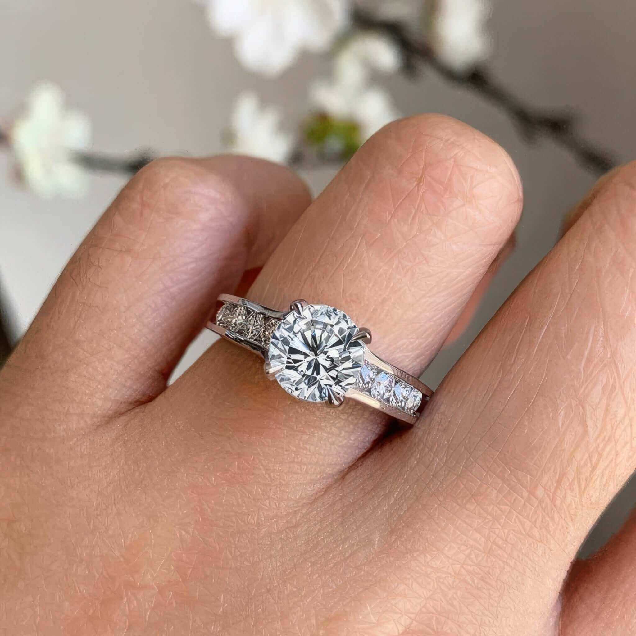 A beautiful 1 carat moissanite engagement ring featuring a prong set round center with channel set diamonds on the sides for a stunning look.