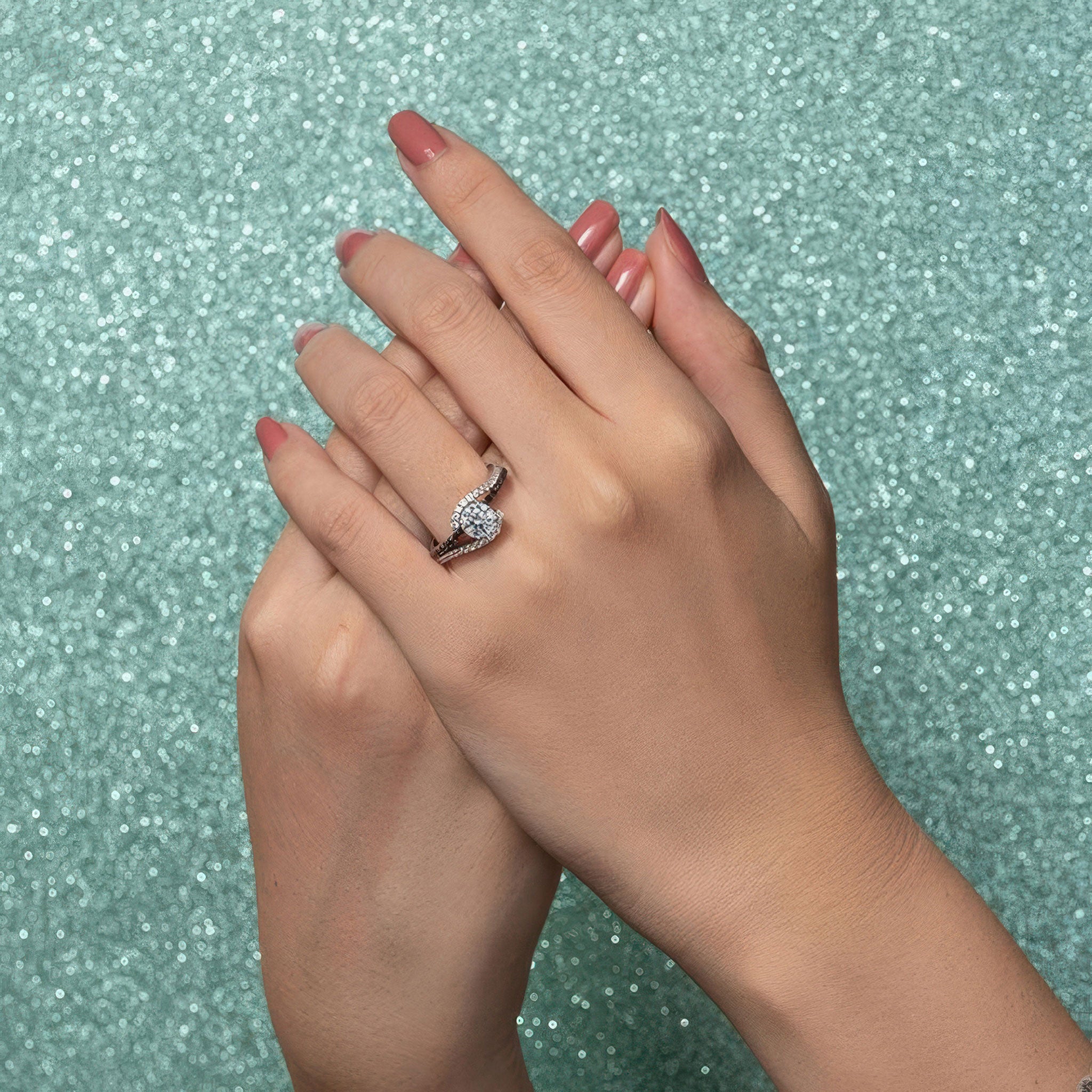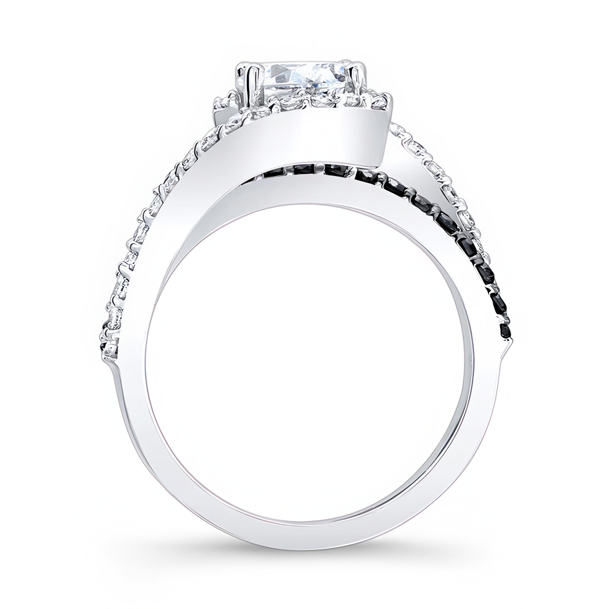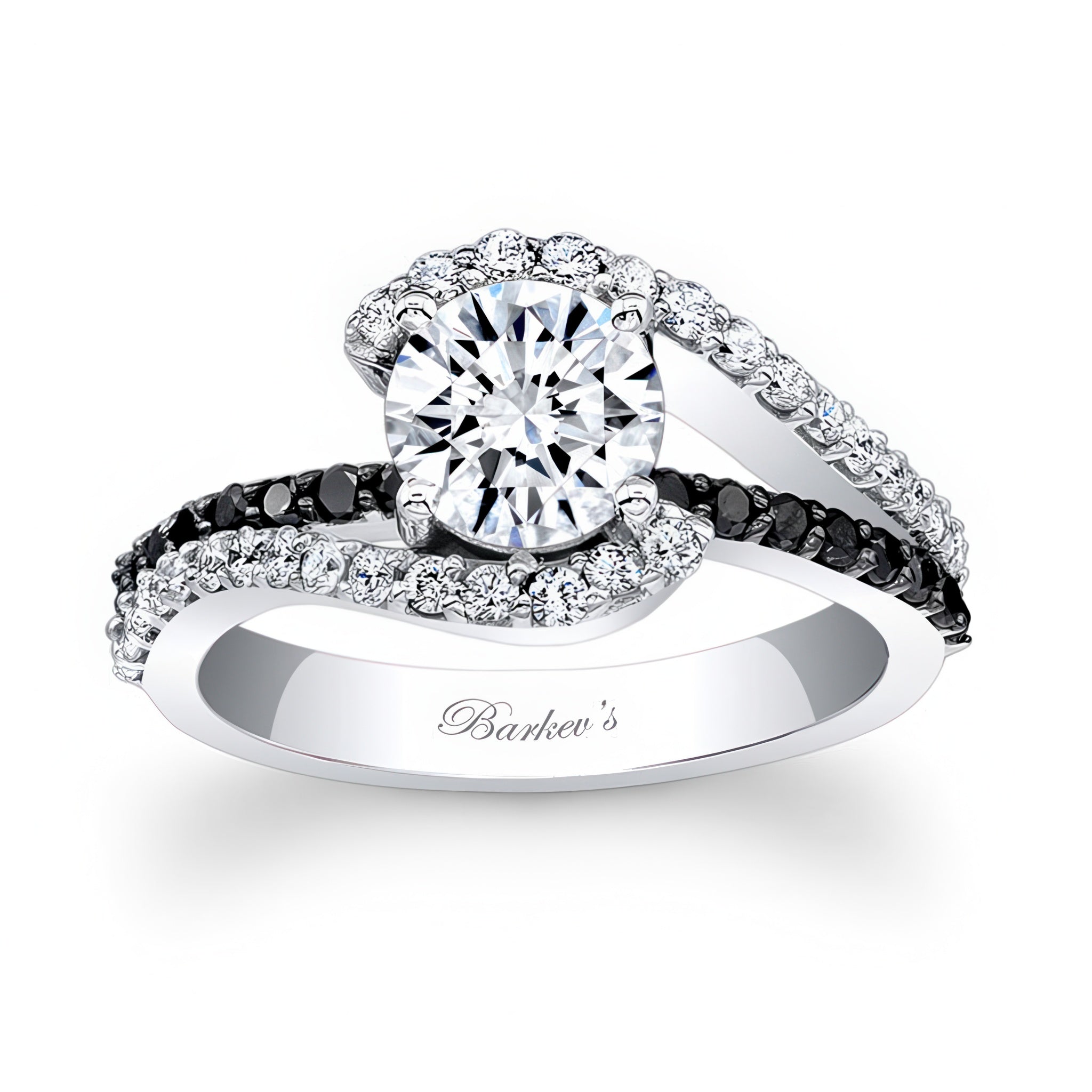 This 1 carat moissanite and black diamond ring features shared prong set diamonds on the split shank that curves around the prong set round center and a bridge running underneath adorned with shared prong set black diamonds for a classic yet brilliant look.