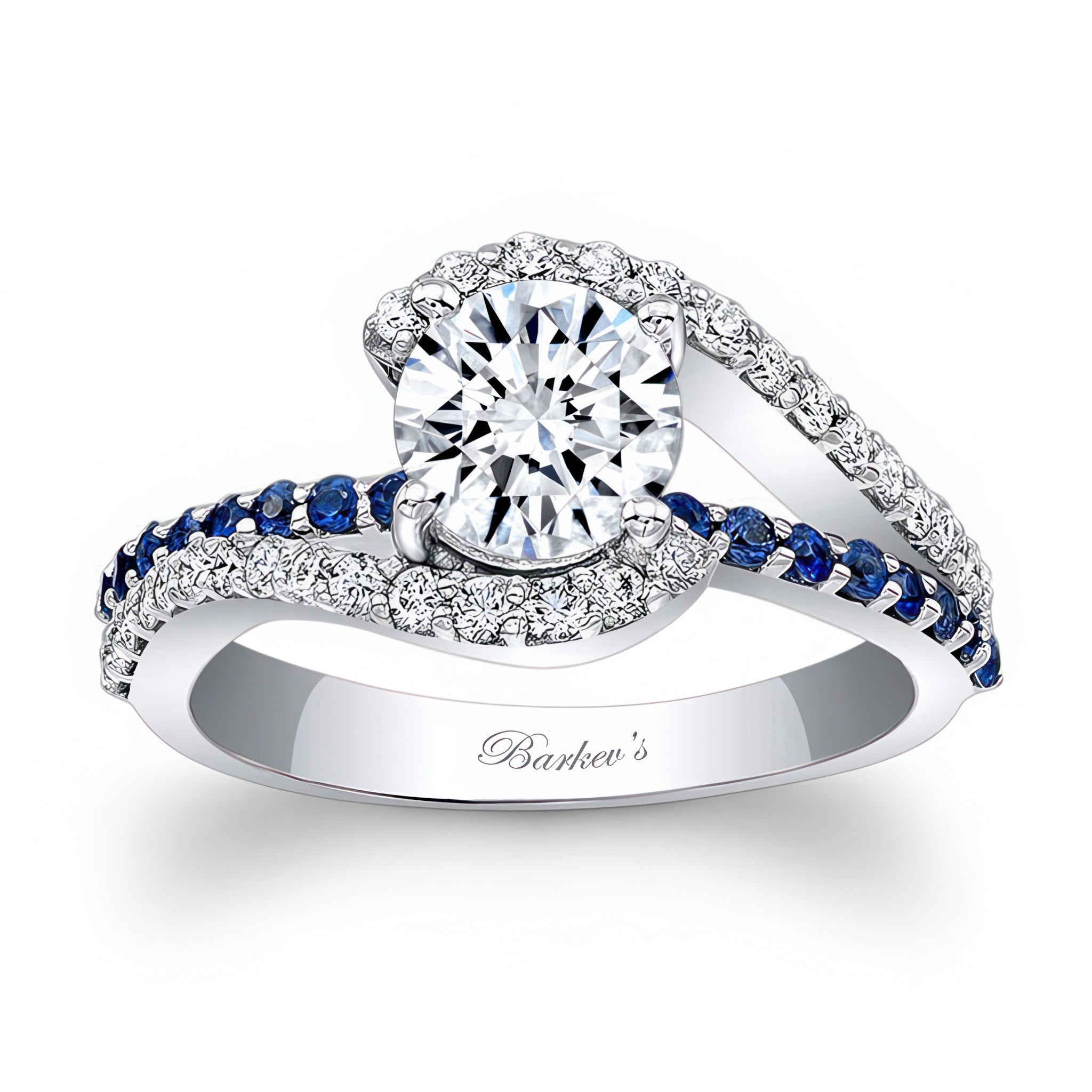 This 1 carat moissanite and blue sapphire ring features shared prong set diamonds on the split shank that curves around the prong set round center and a bridge running underneath adorned with shared prong set blue sapphires for a classic yet brilliant look.