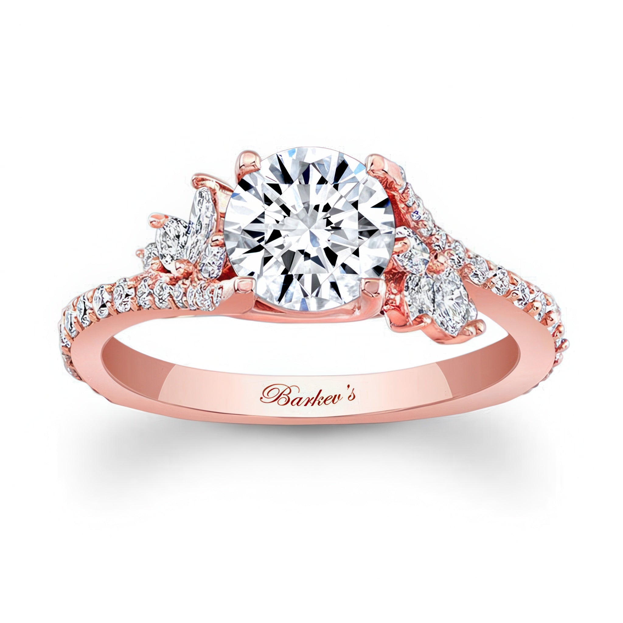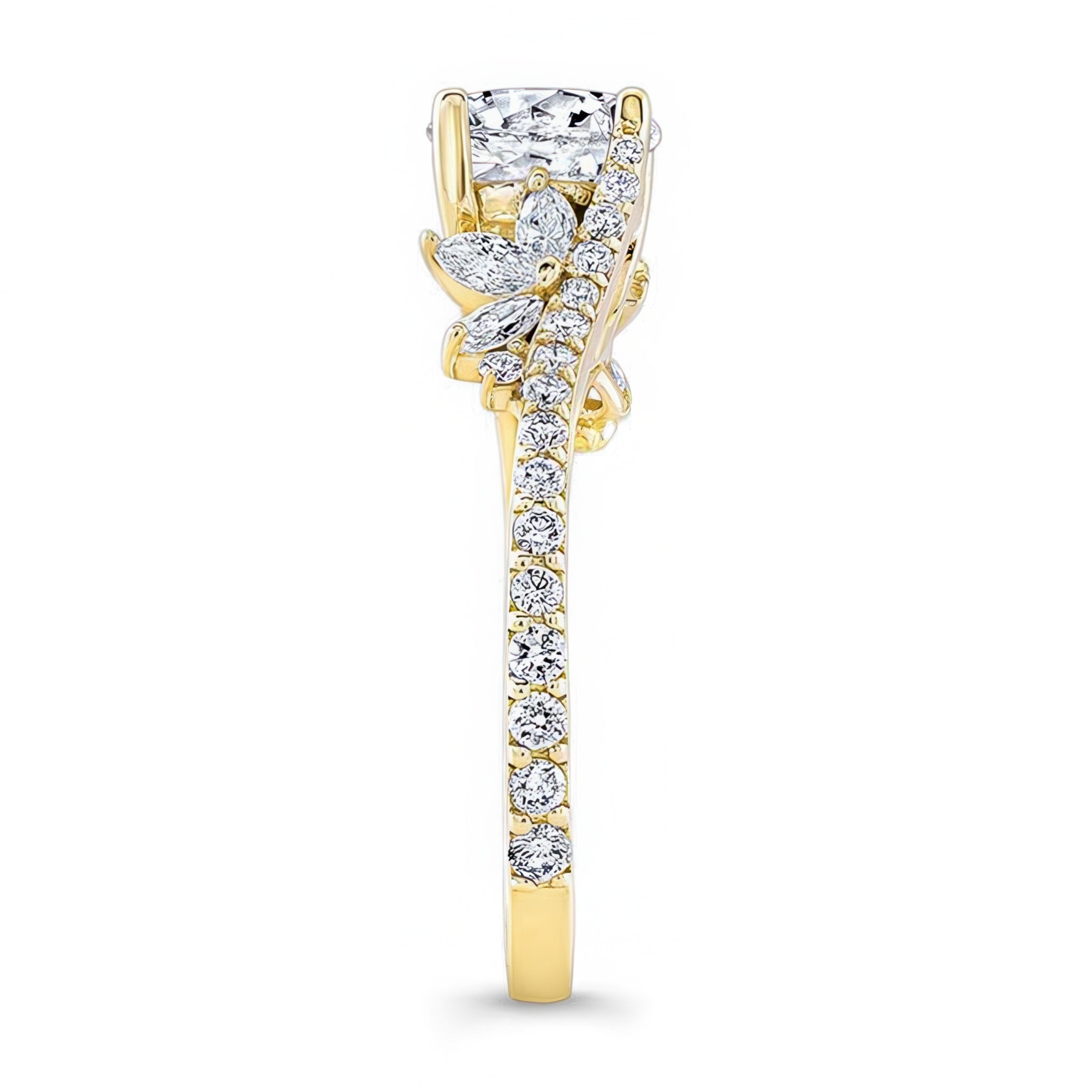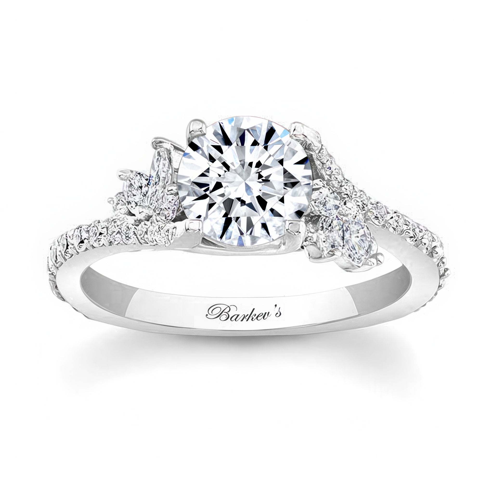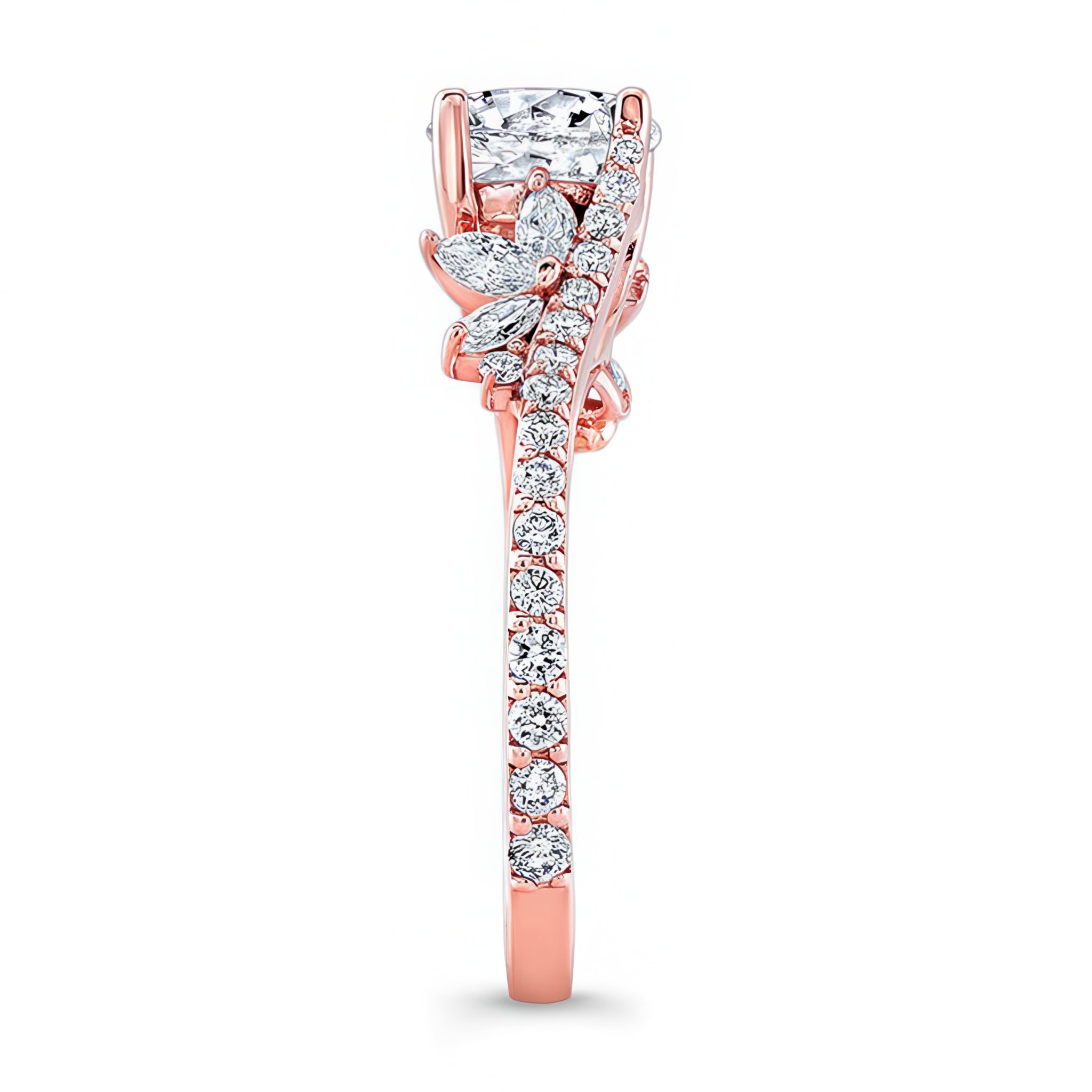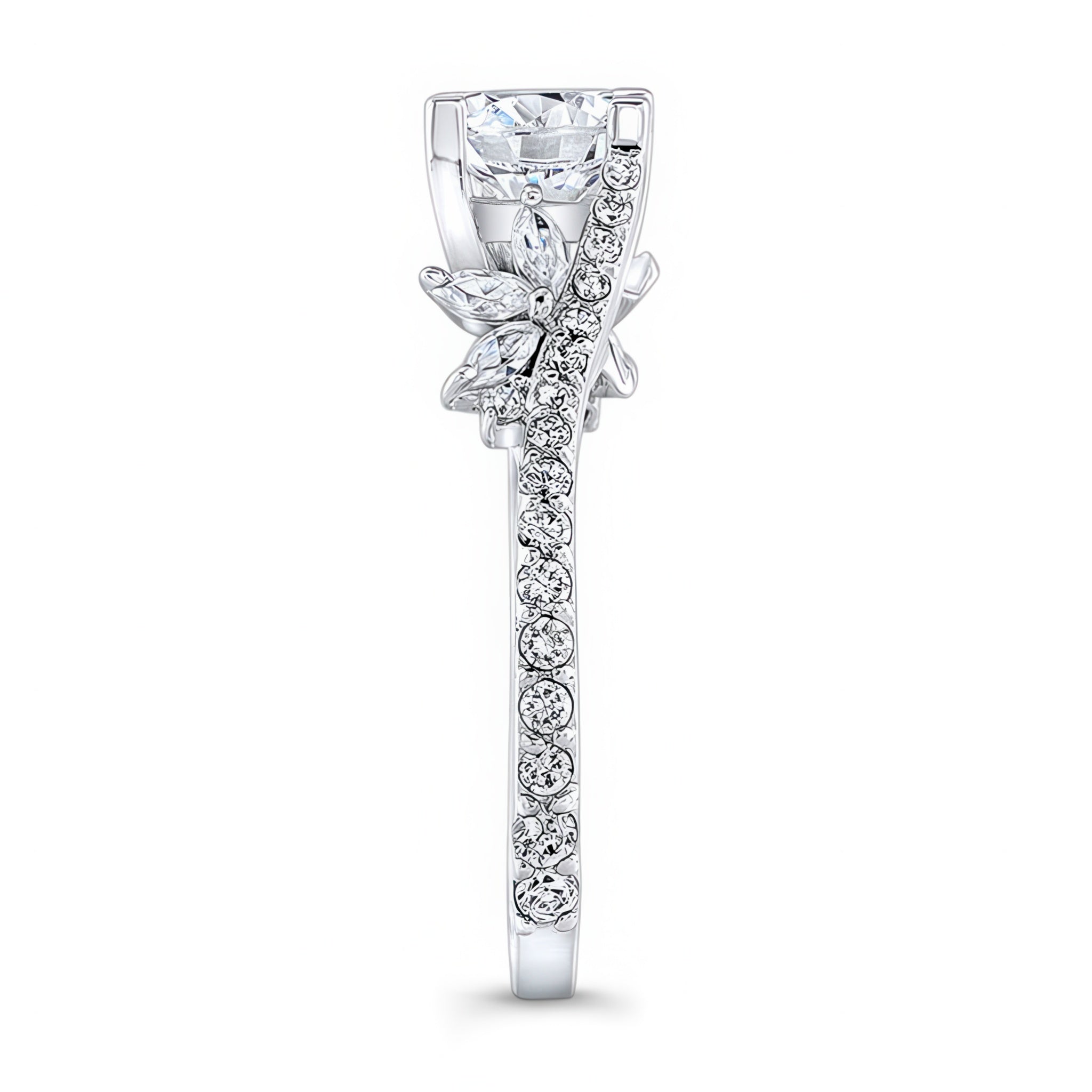 This elegant 1 carat round moissanite ring features a prong set center stone graced on each side with a flare of marquise and round diamonds cascading down the dainty shank.
