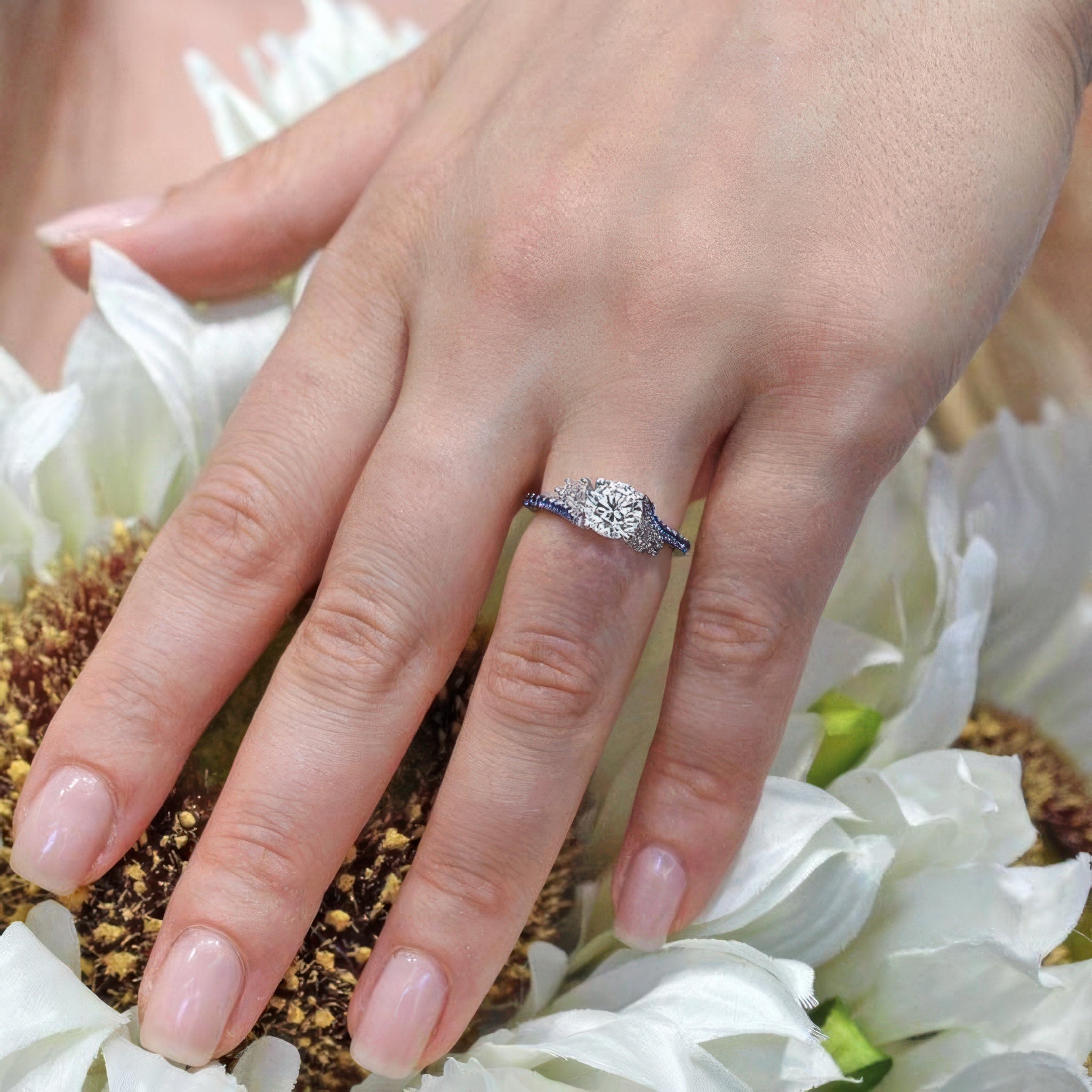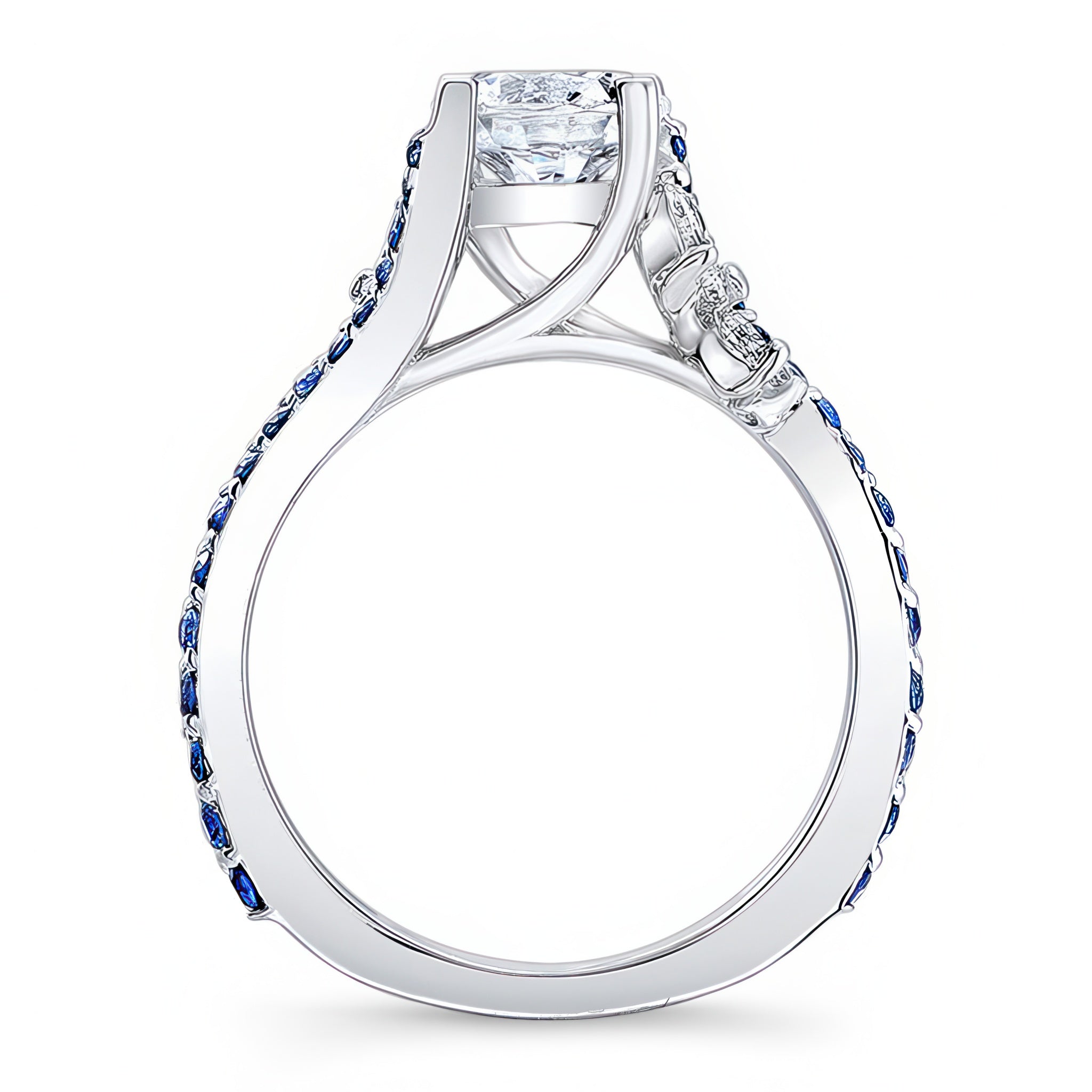 This elegant 1 carat round moissanite sapphire accent ring features a prong set center stone graced on each side with a flare of marquise and round diamonds and sapphires cascading down the dainty shank.