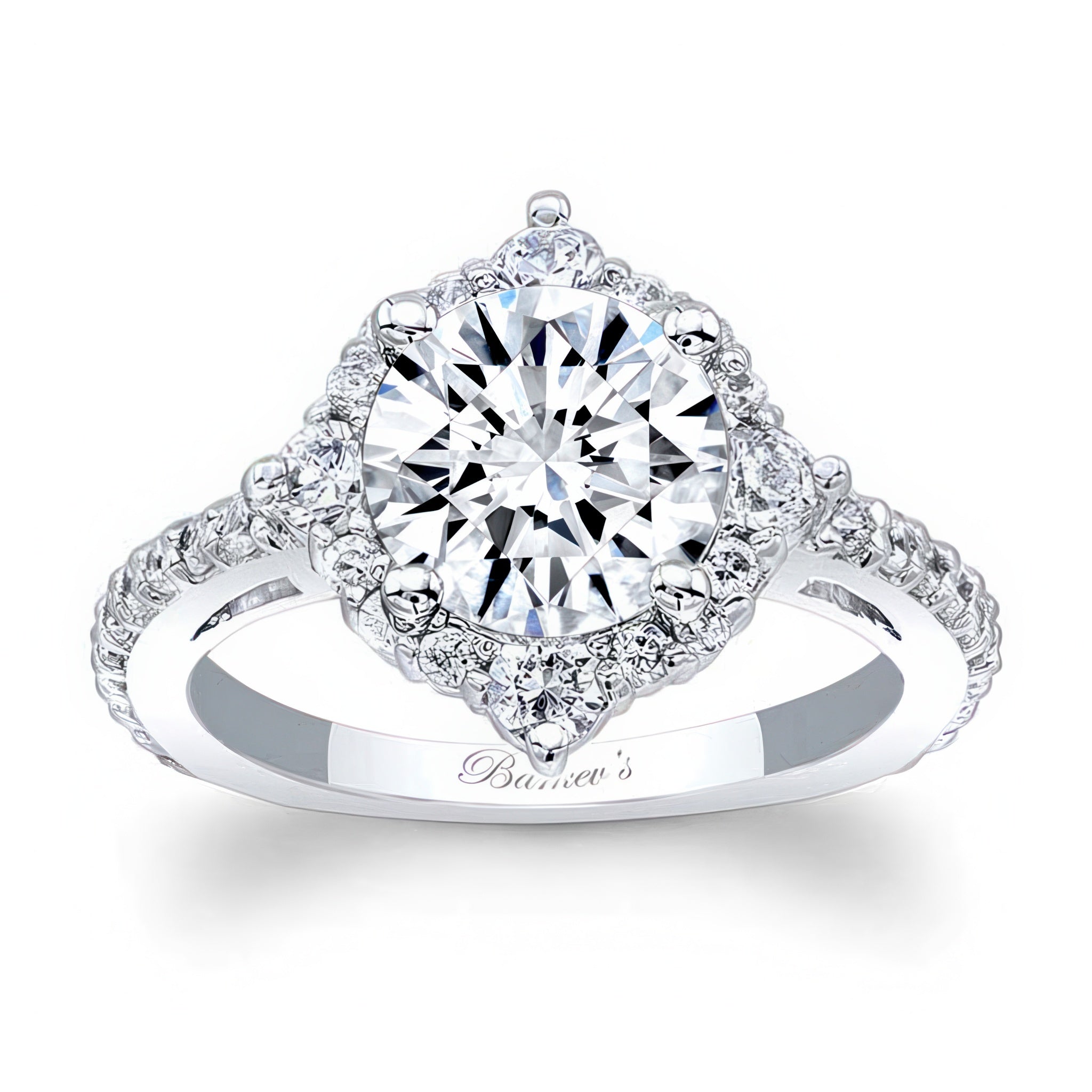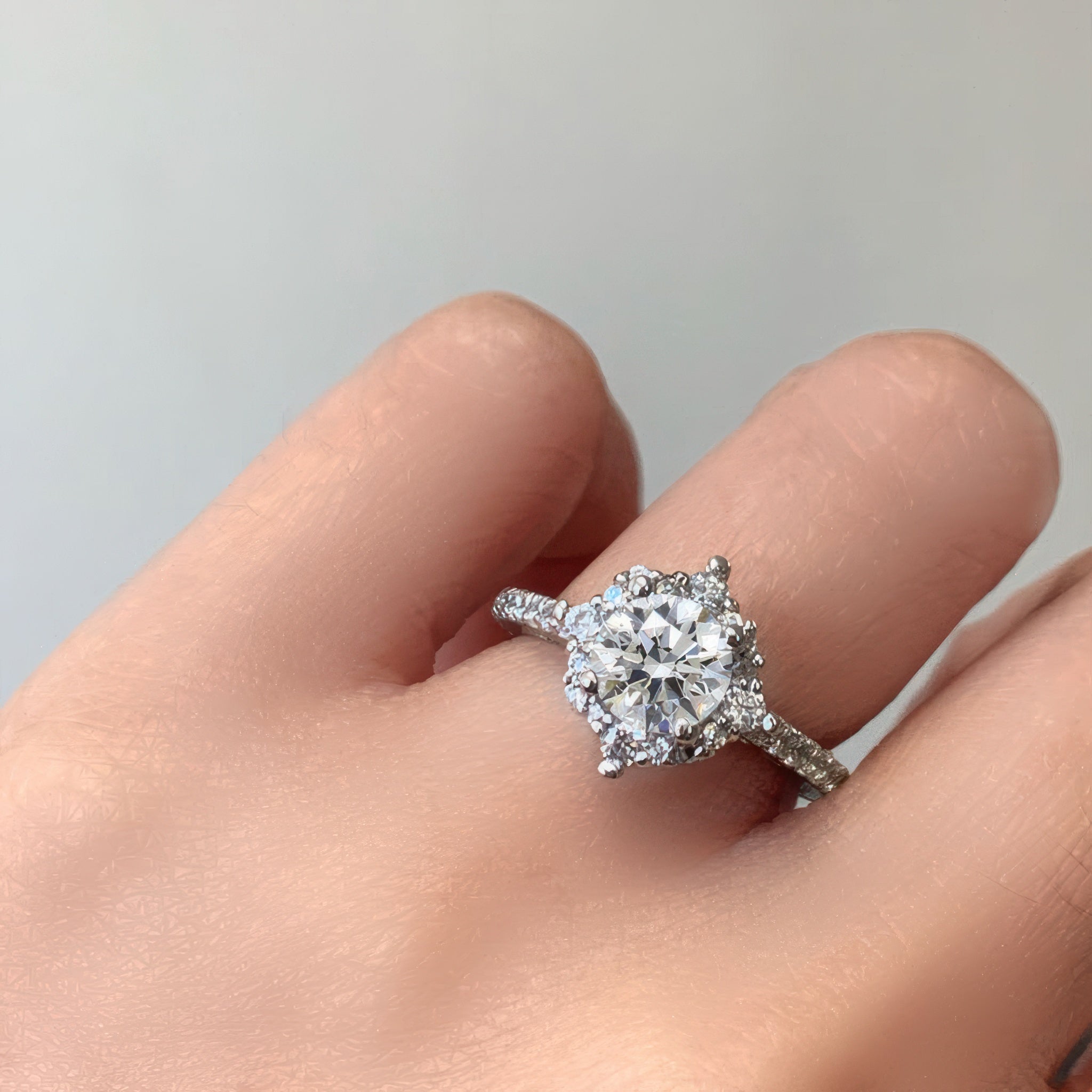 This 2 carat moissanite halo diamond ring features a prong set round center artfully embellished with diamond melees for a twist on the traditional halo ring. The narrow shank is set with shared prong set diamonds for an elegant finish.