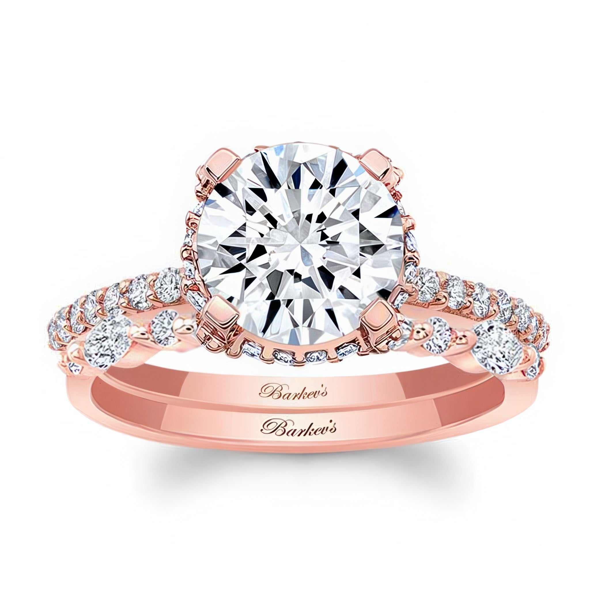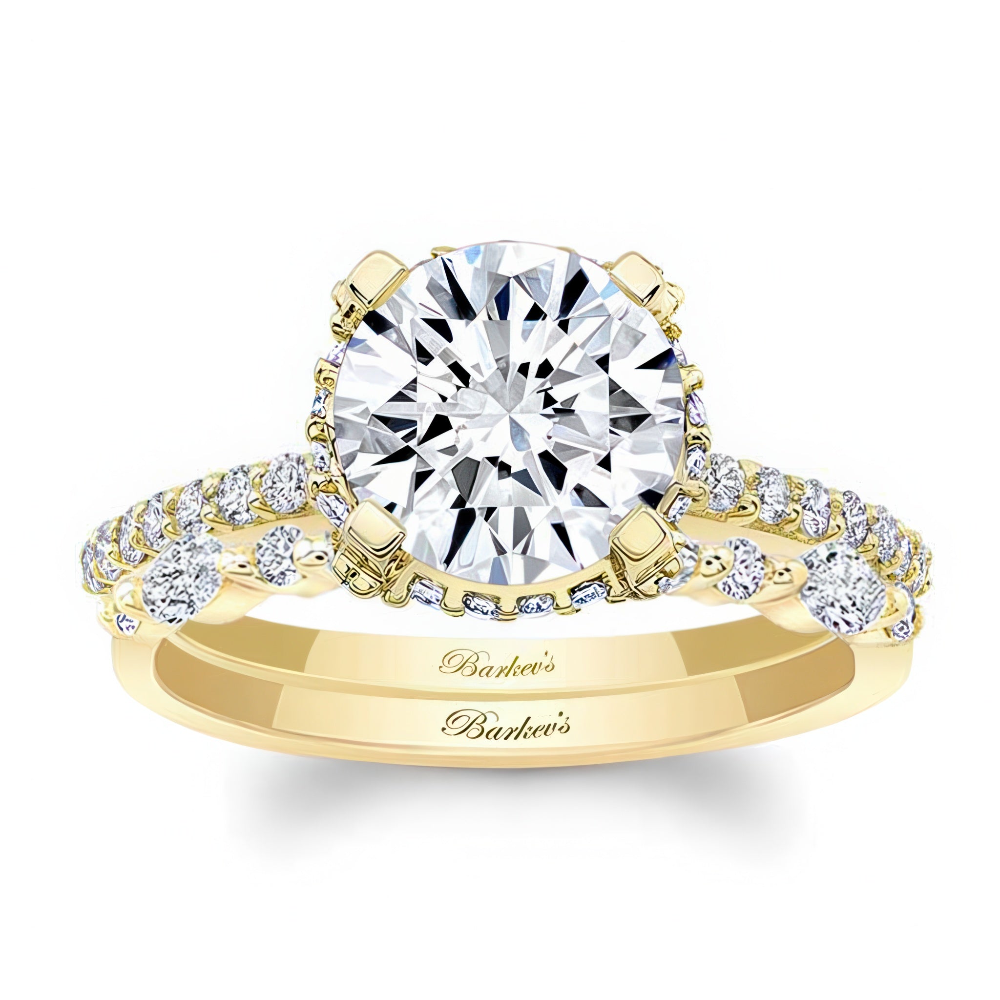 This 2 carat moissanite hidden halo bridal set features a prong set round center surrounded by shared prong set diamonds just underneath as they cascade and flow down the shank for a look that shimmers from every angle. Comes with a stunning diamond wedding band featuring round and marquise diamonds.