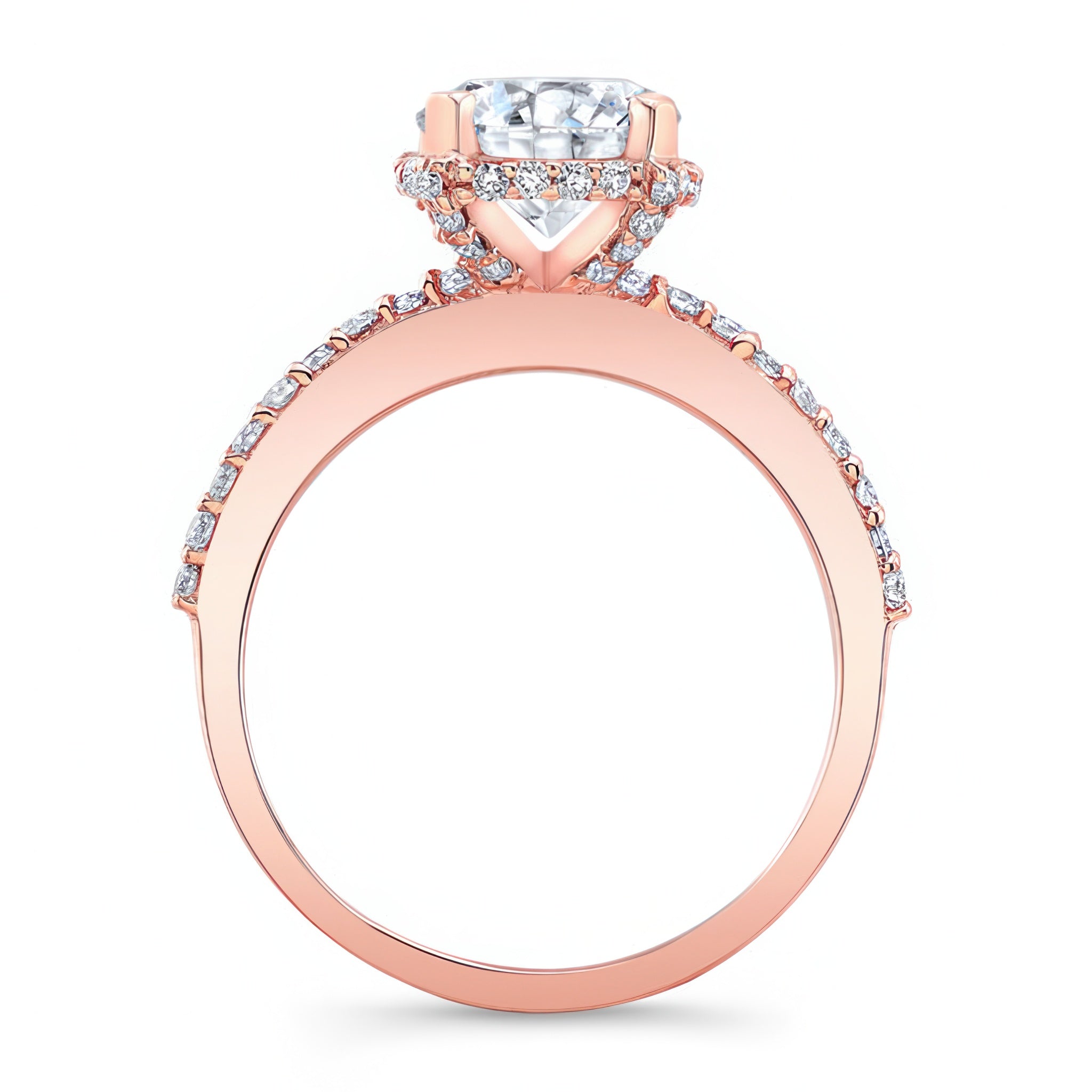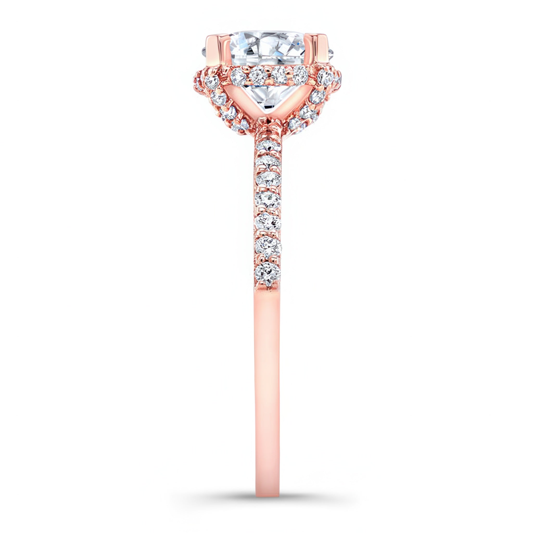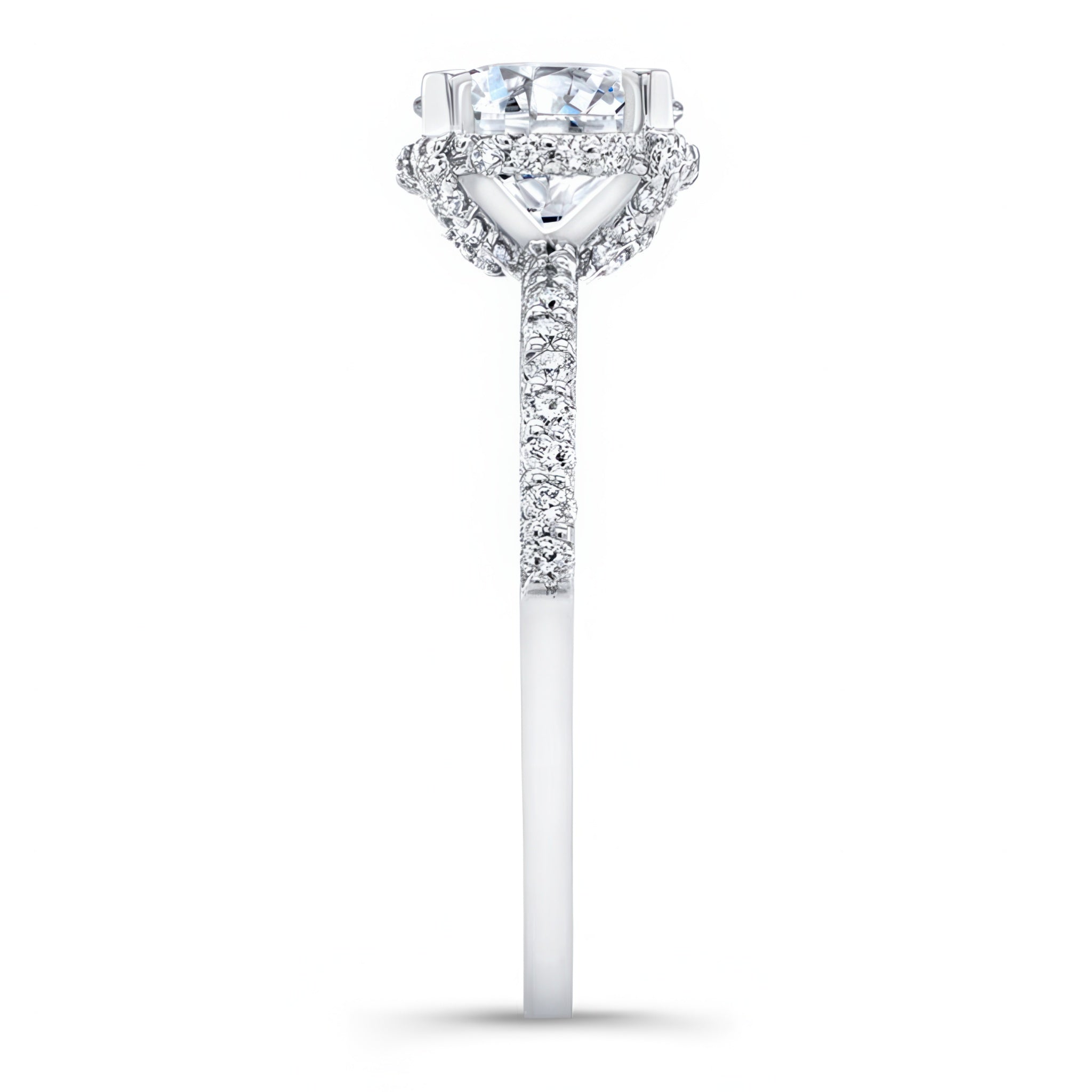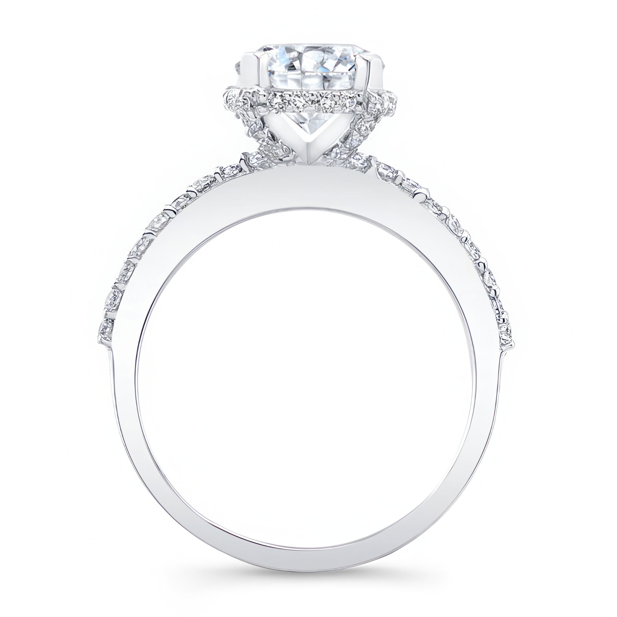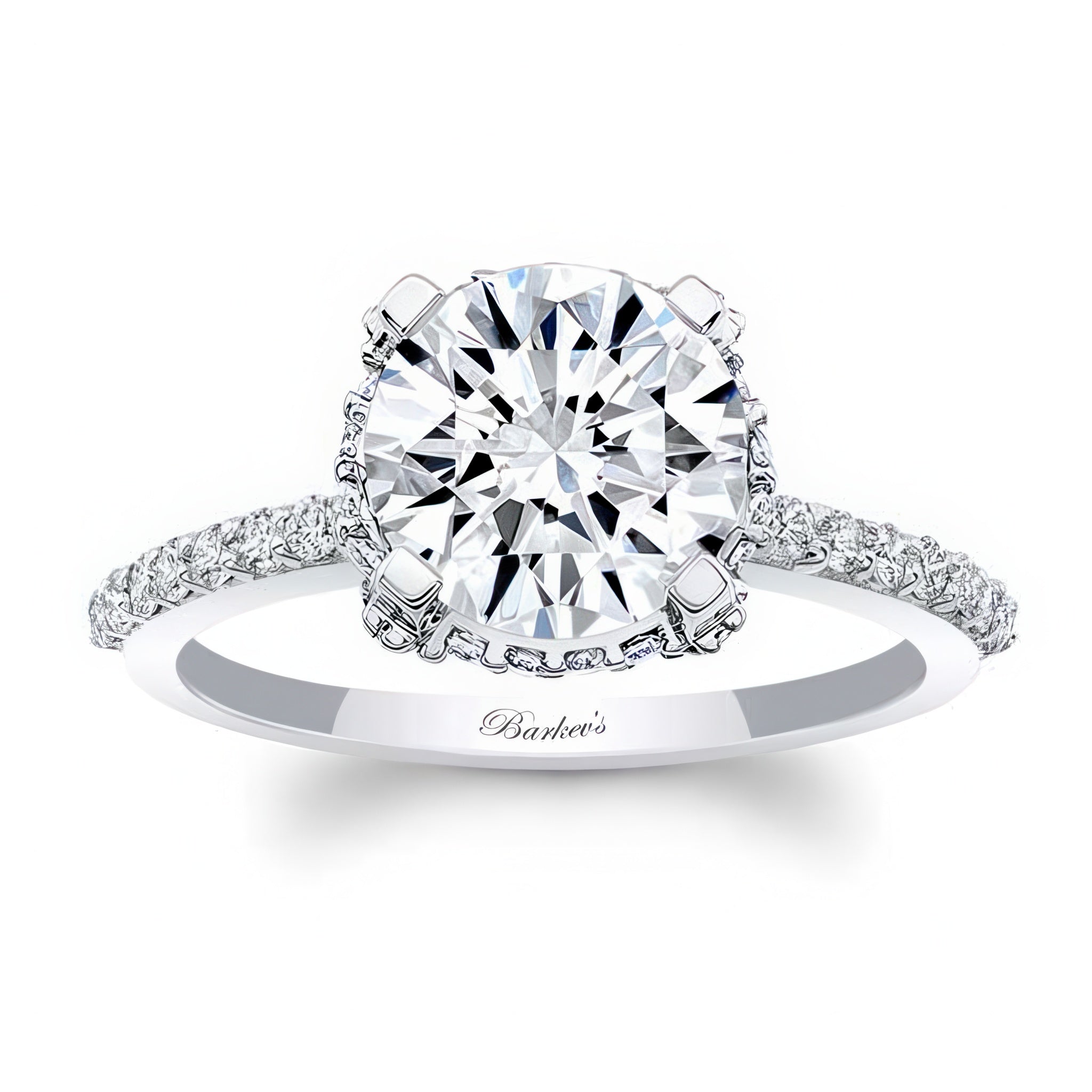 This 2 carat moissanite hidden halo ring features a prong set round center surrounded by shared prong set diamonds just underneath as they cascade and flow down the shank for a look that shimmers from every angle.