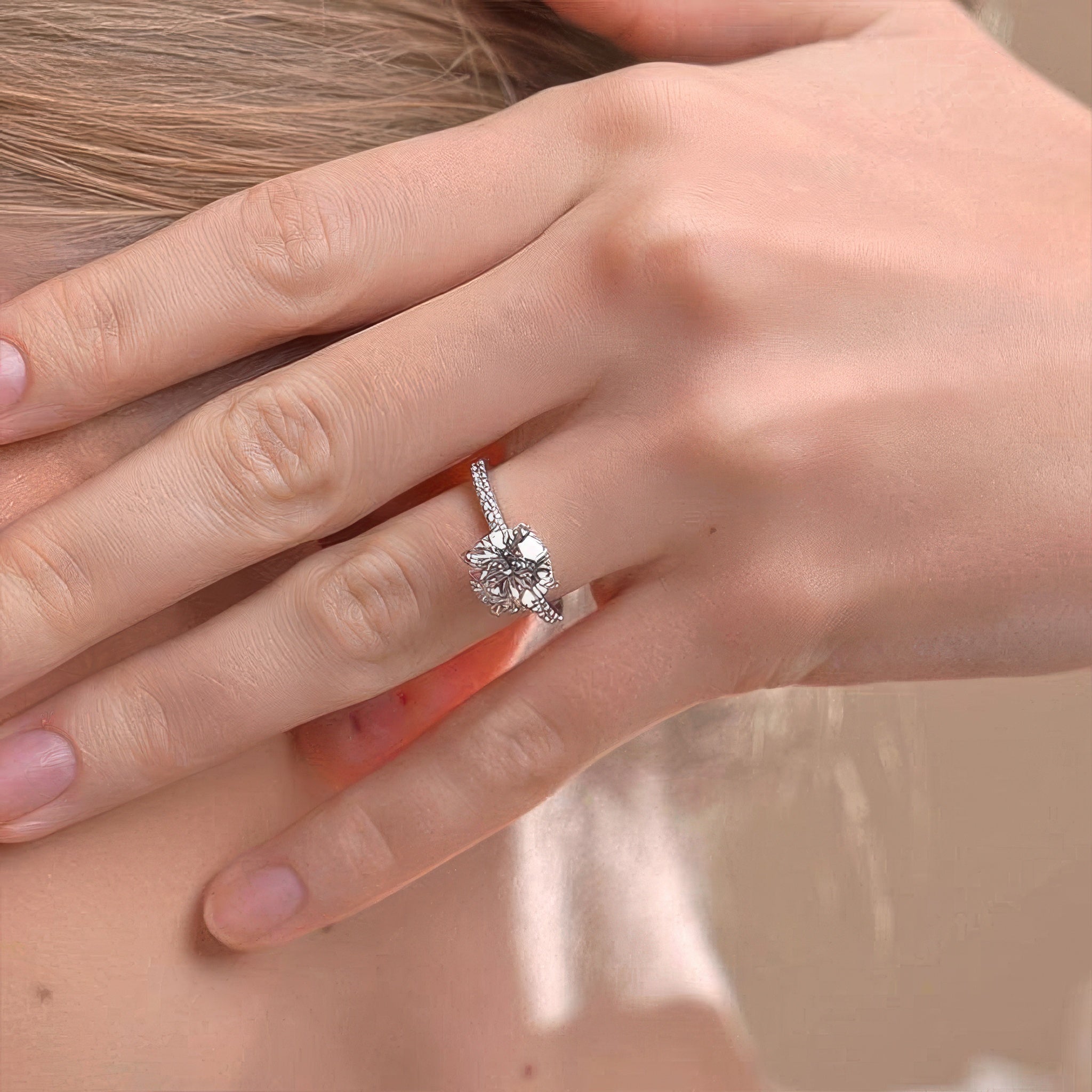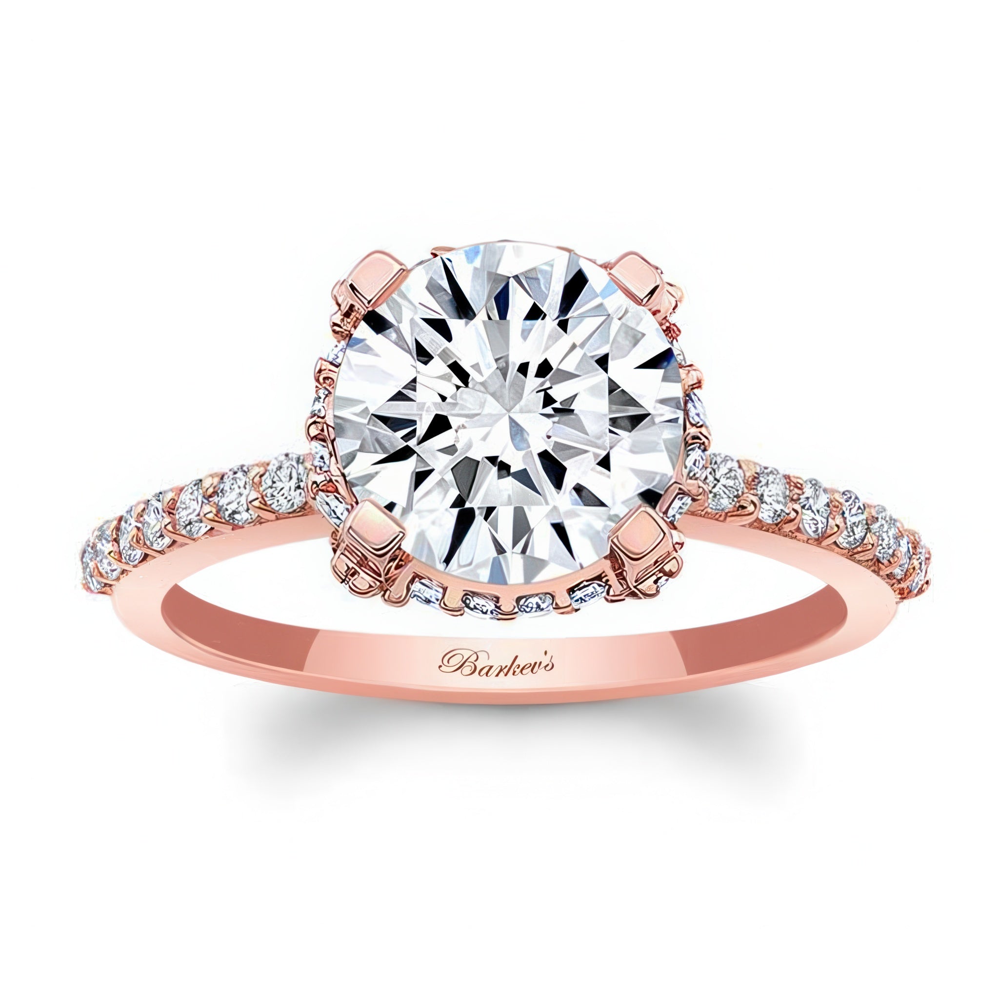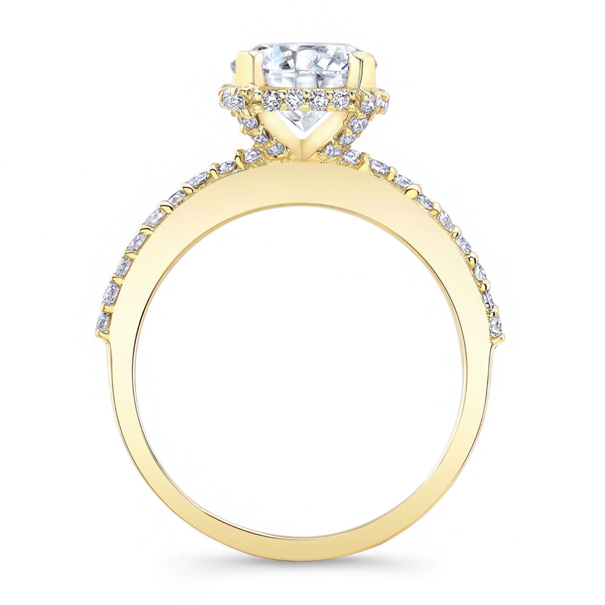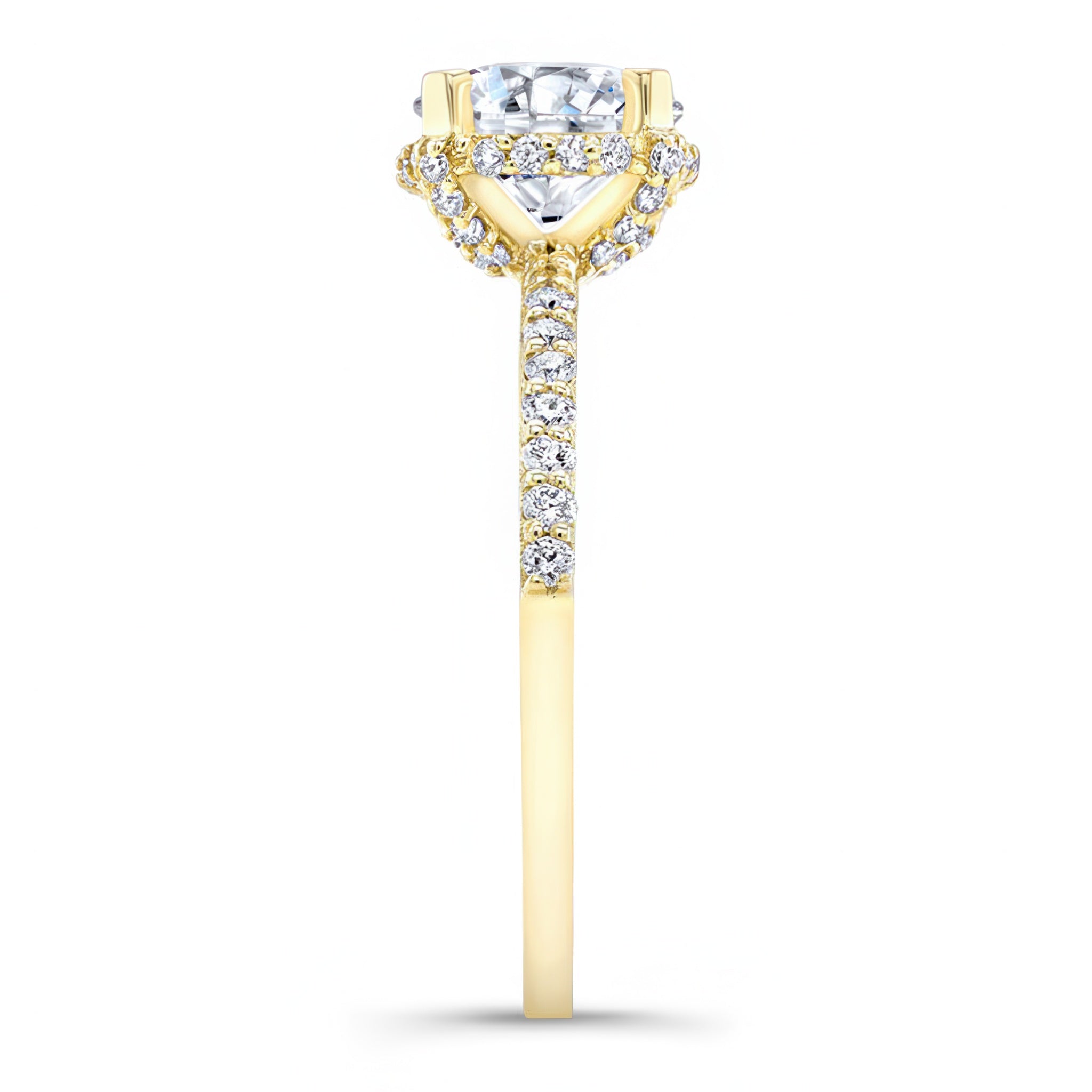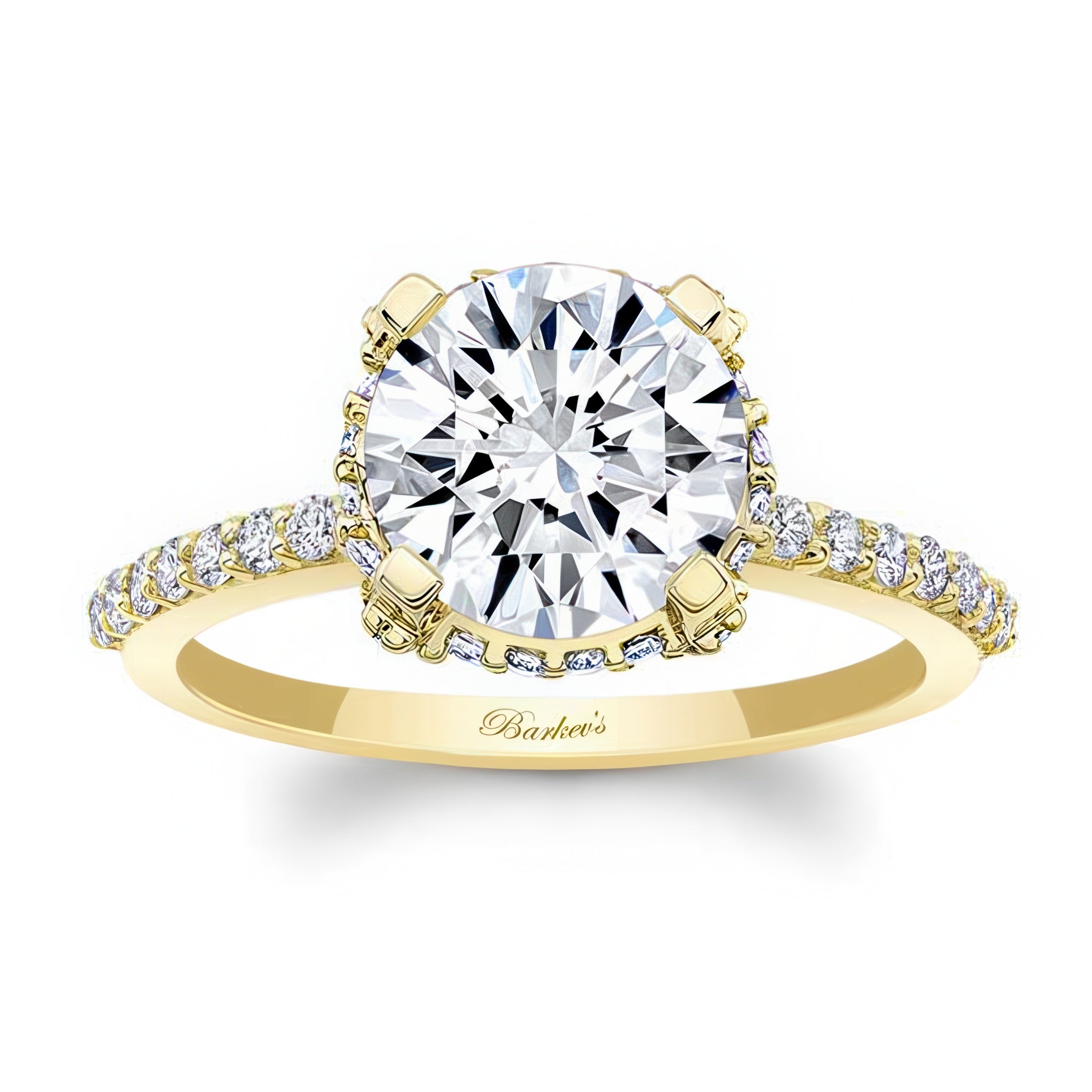 This 2 carat moissanite hidden halo ring features a prong set round center surrounded by shared prong set diamonds just underneath as they cascade and flow down the shank for a look that shimmers from every angle.