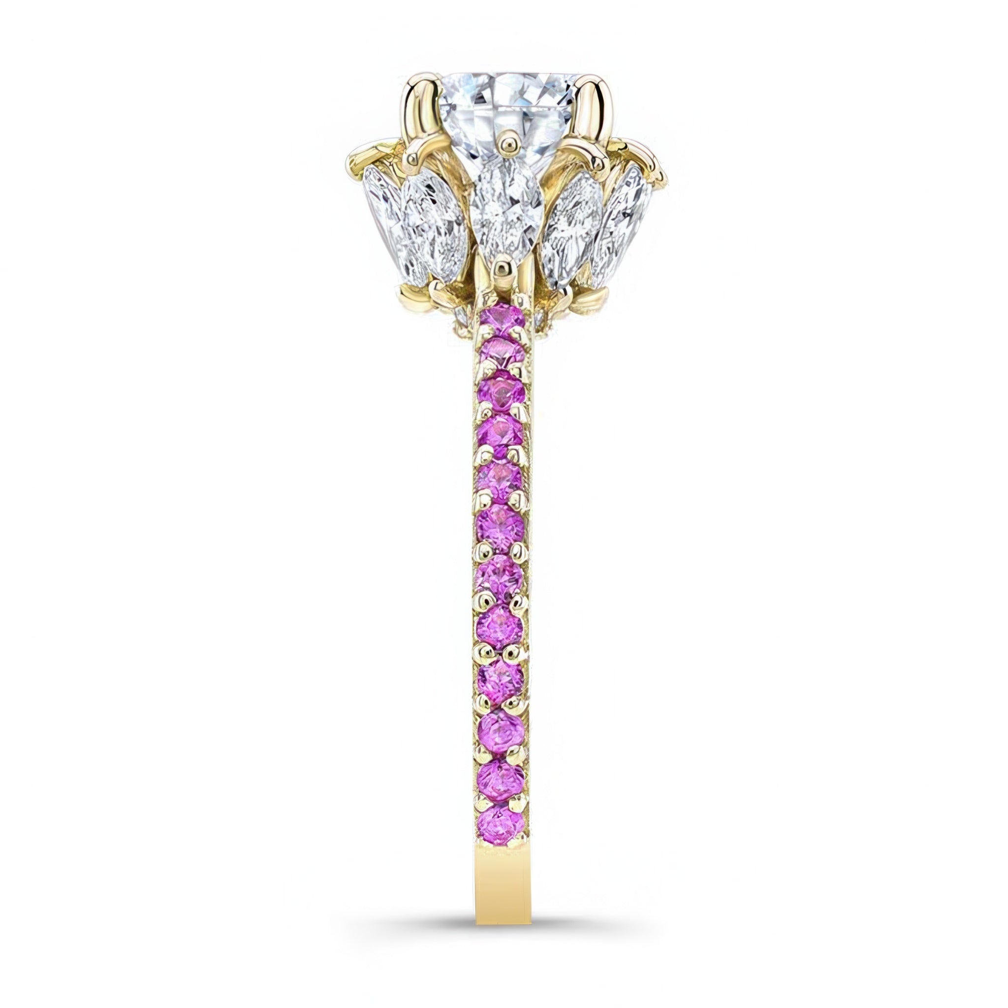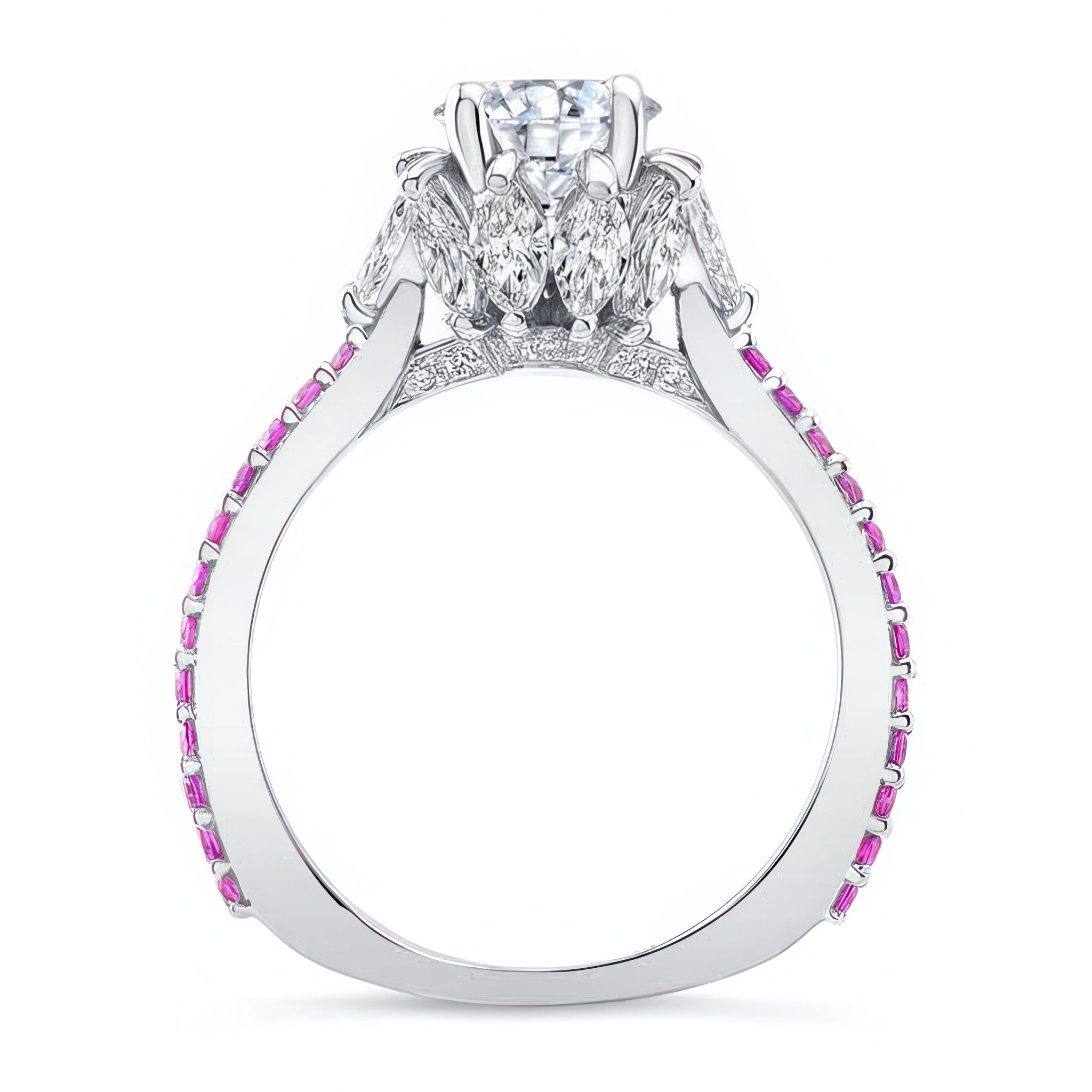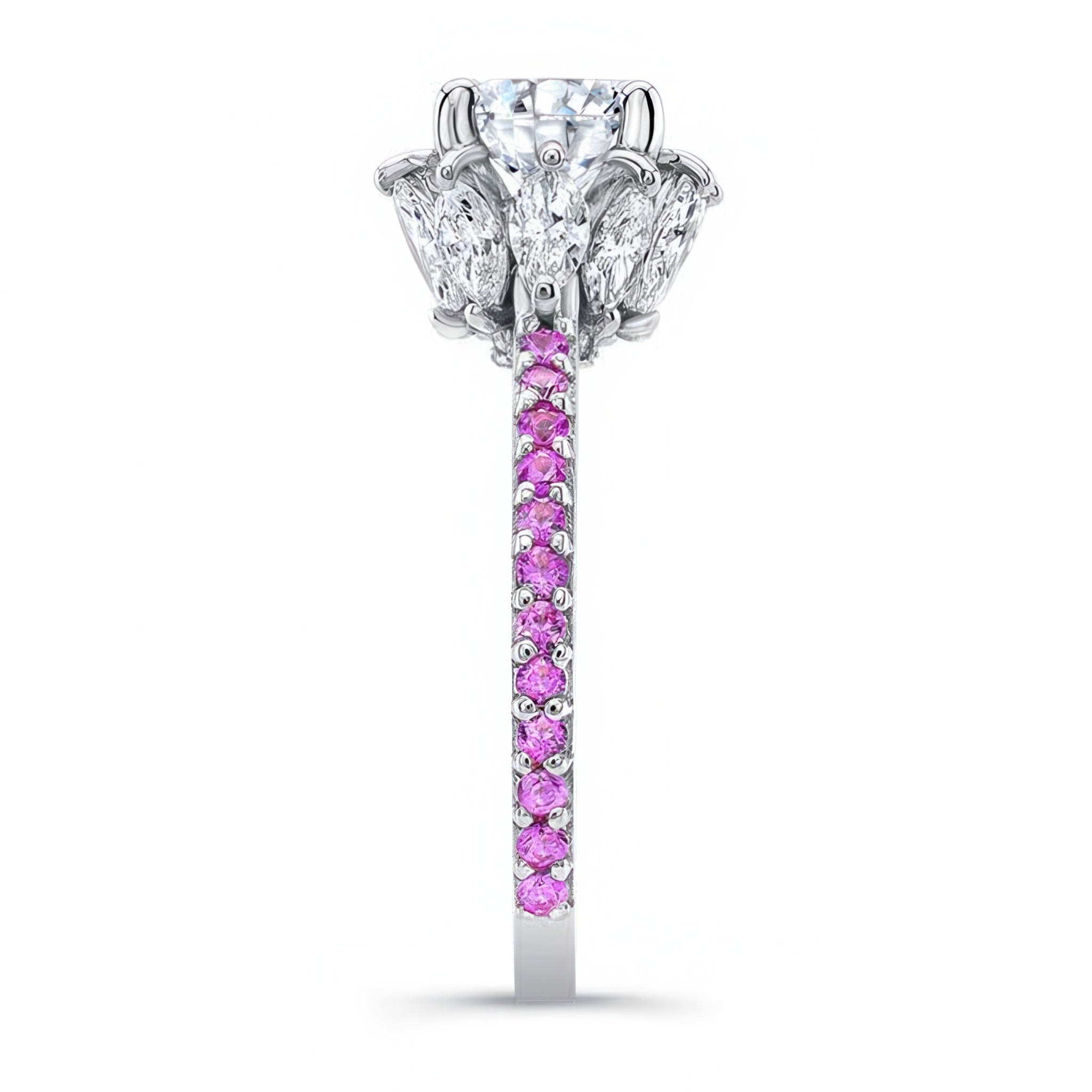 This 2 carat moissanite pink sapphire accent ring features a prong set round center with marquise diamonds adorning the gallery and shared prong set pink sapphires on the ridges of the shank for a sophisticated finish.
