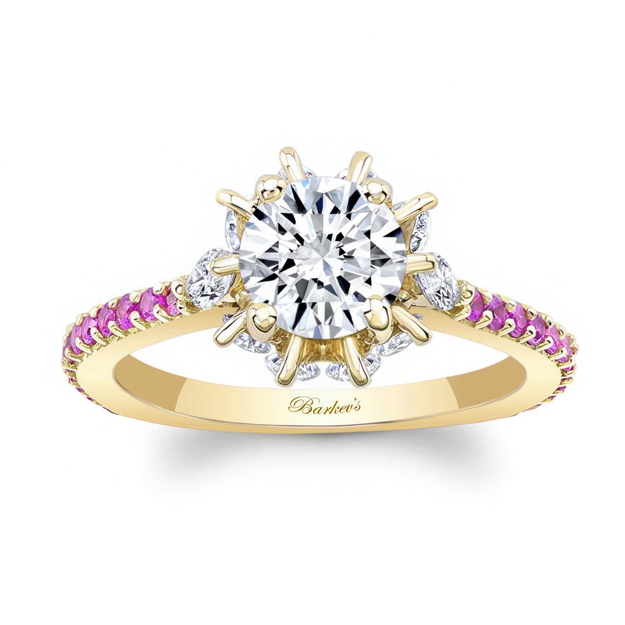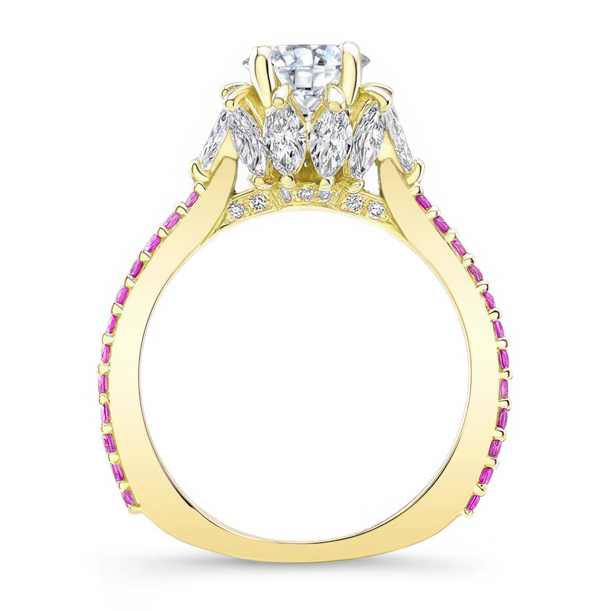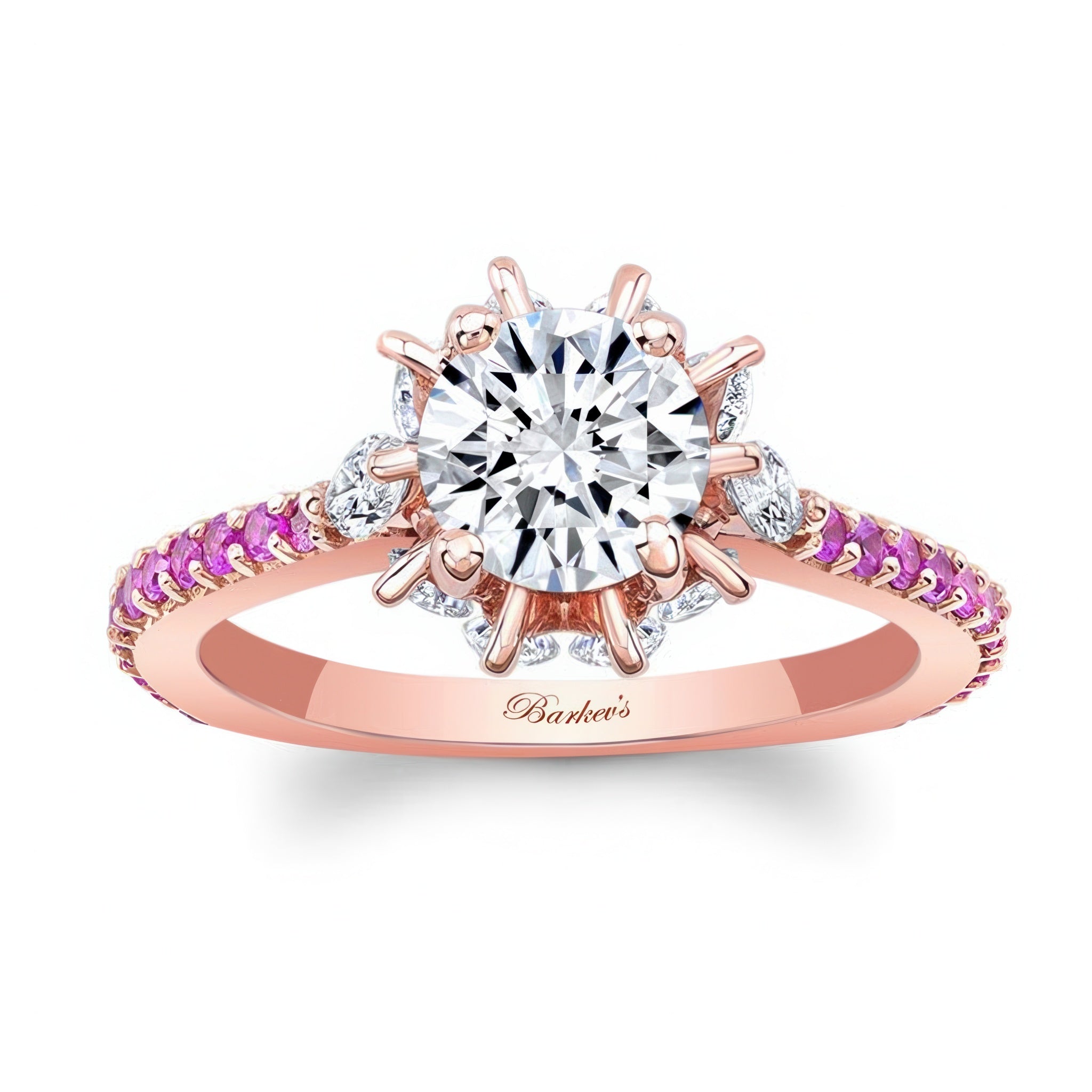This 2 carat moissanite pink sapphire accent ring features a prong set round center with marquise diamonds adorning the gallery and shared prong set pink sapphires on the ridges of the shank for a sophisticated finish.