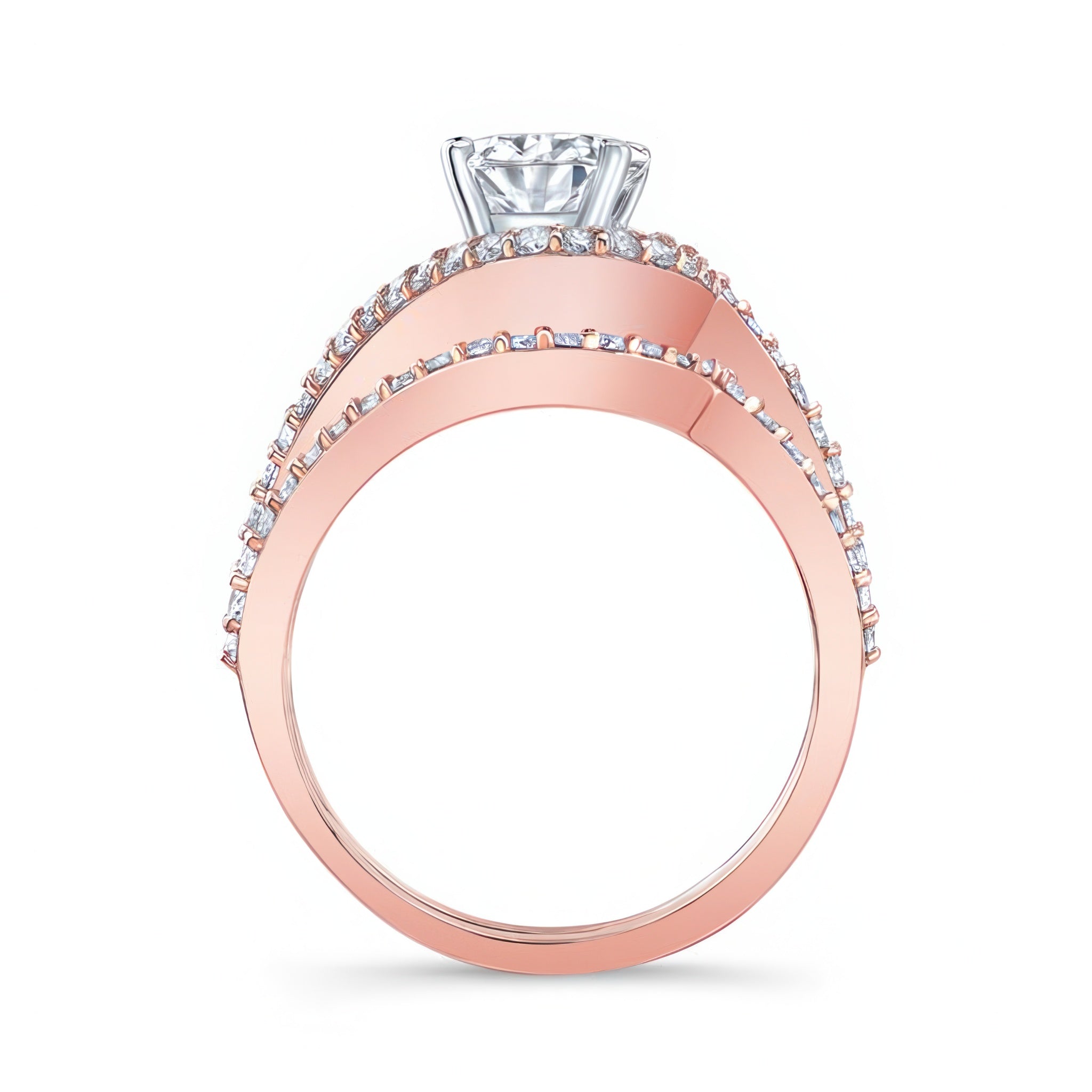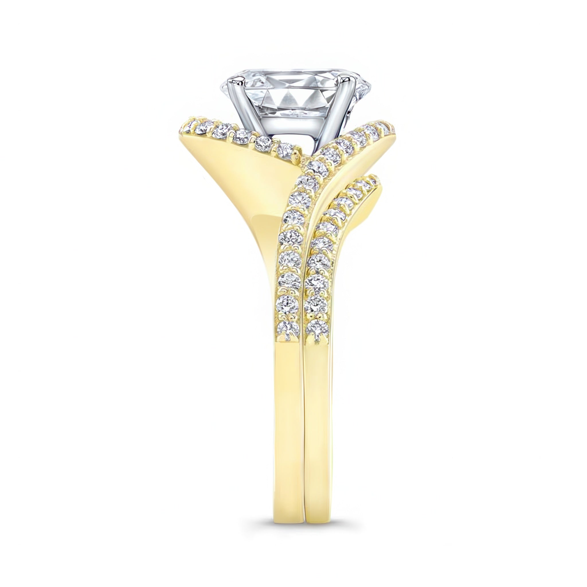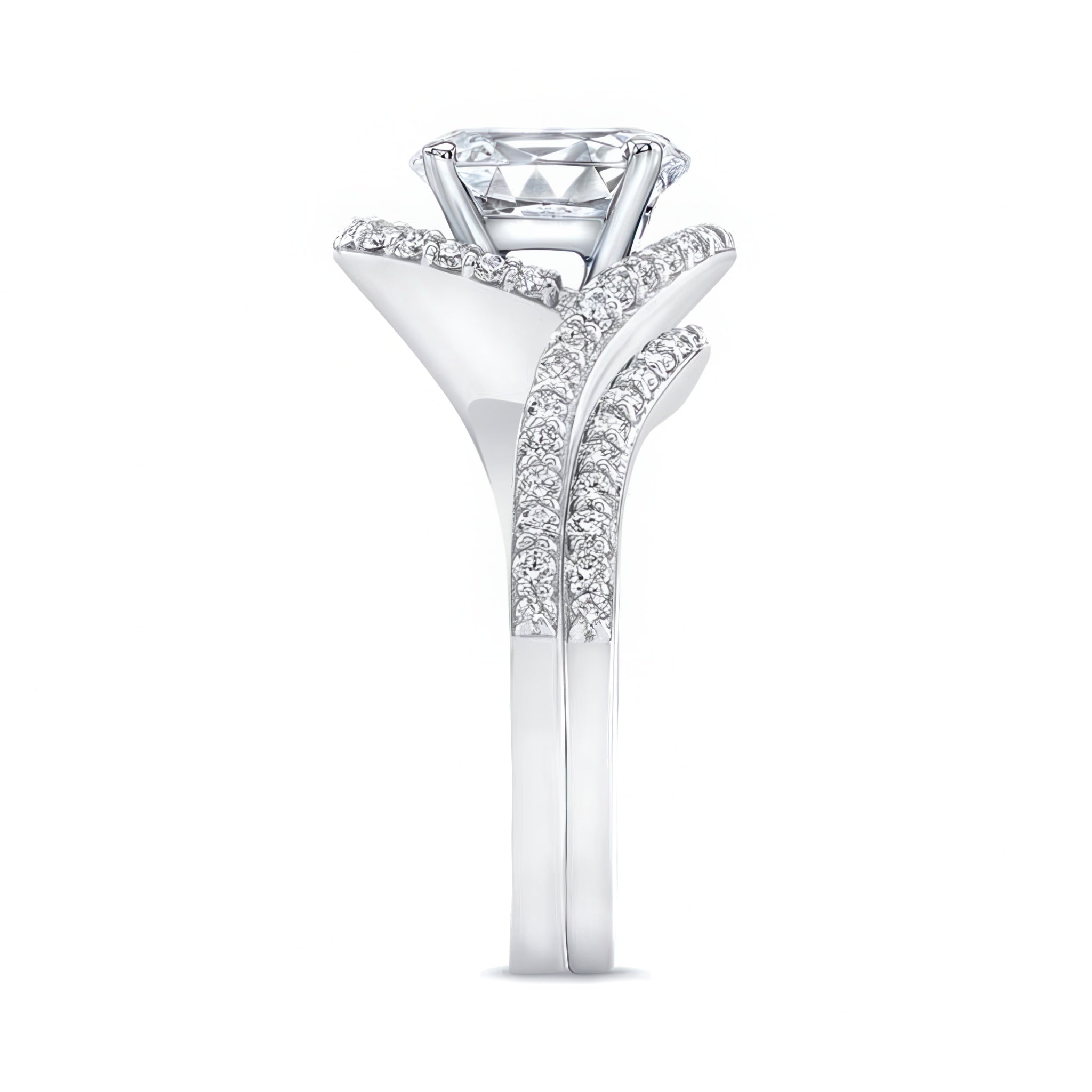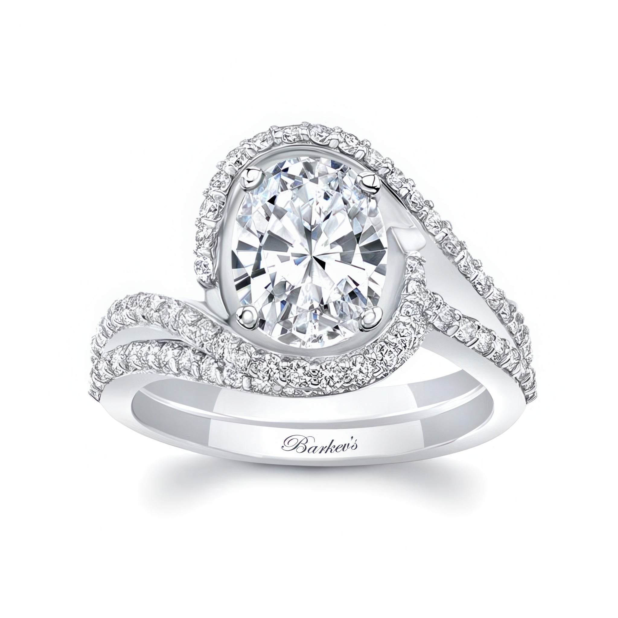 This 2 carat oval moissanite wedding ring set features a split shank that curves around the center stone, which is presented in a floating semi halo by pave diamonds that cascade down the shoulders in a swirl.