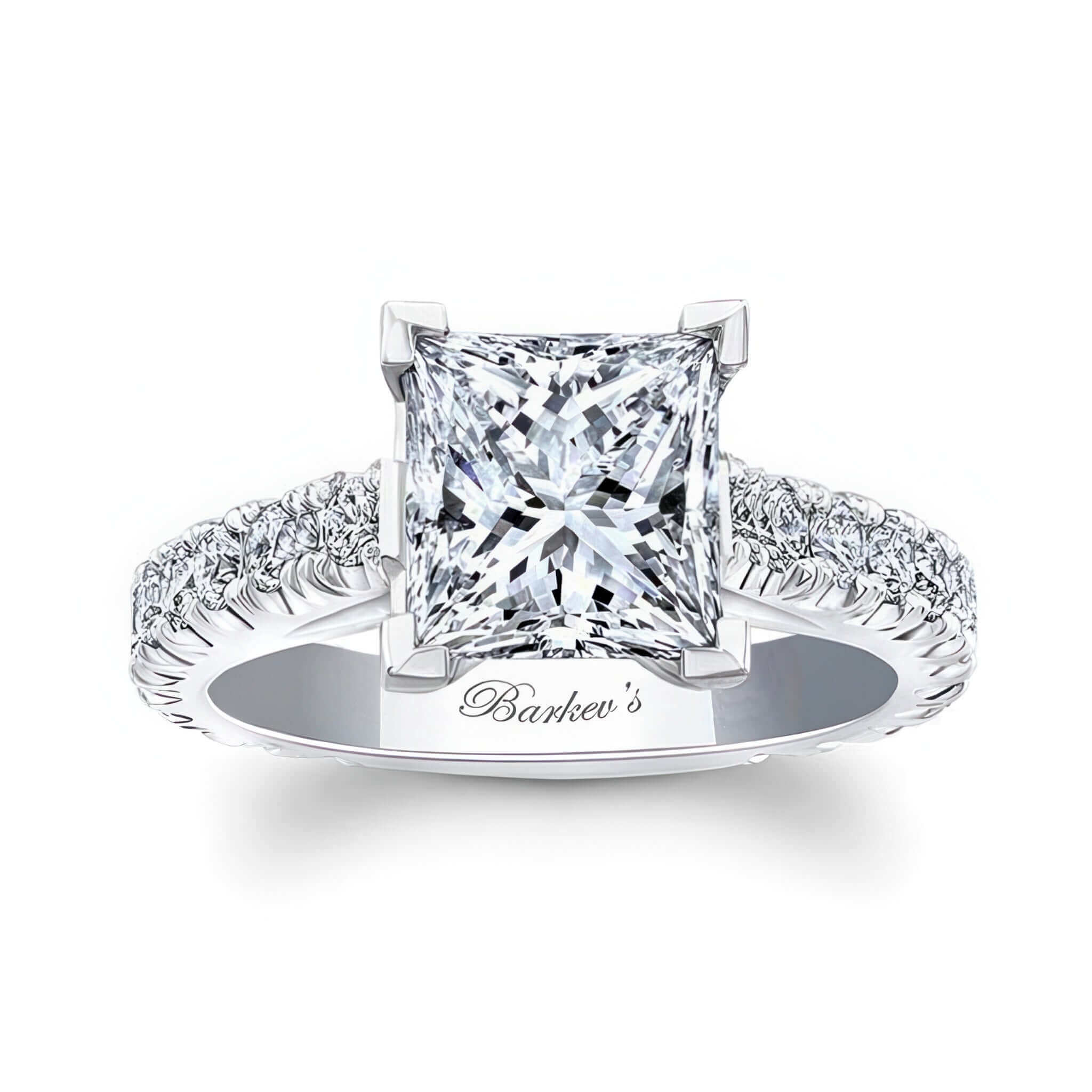 A Glamorous 2 carat princess cut moissanite ring featuring a stunning large center with a river of side diamonds flowing on the shank for a show stopping look.