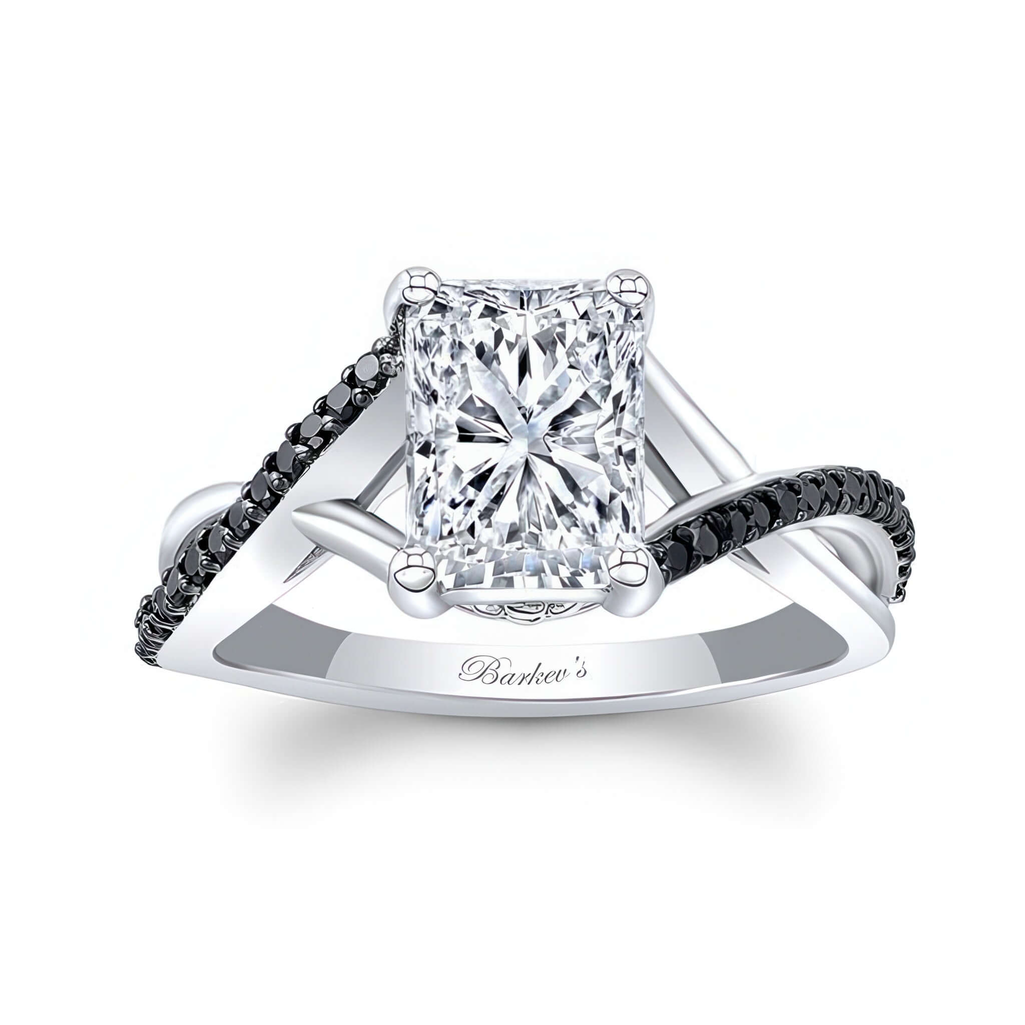 This 2 carat radiant cut black diamond accent moissanite ring will turn heads with it's overlapping black diamond shank, large center stone and flower motif.