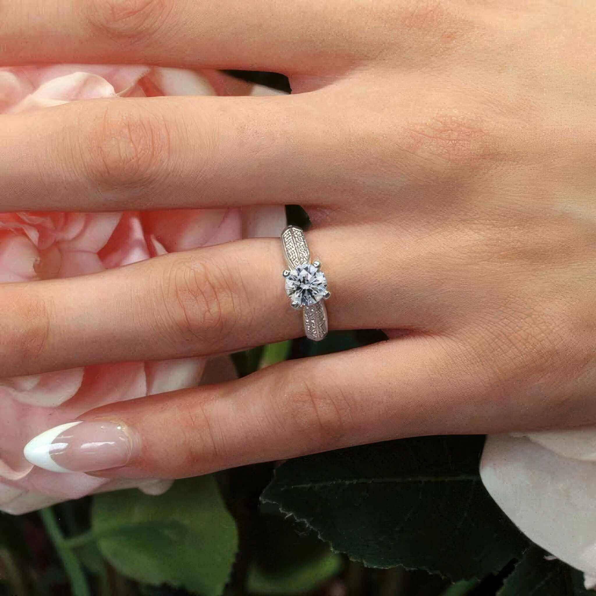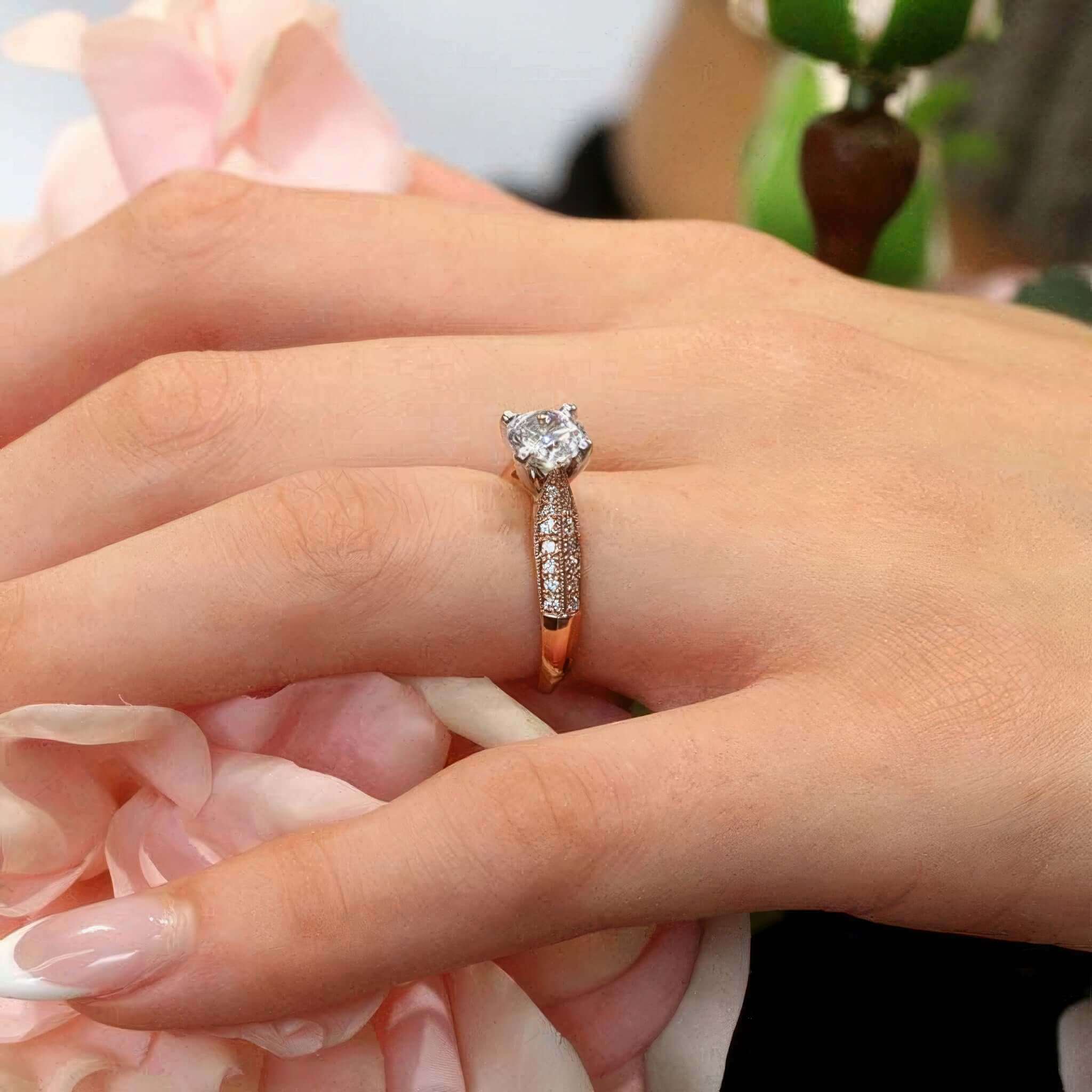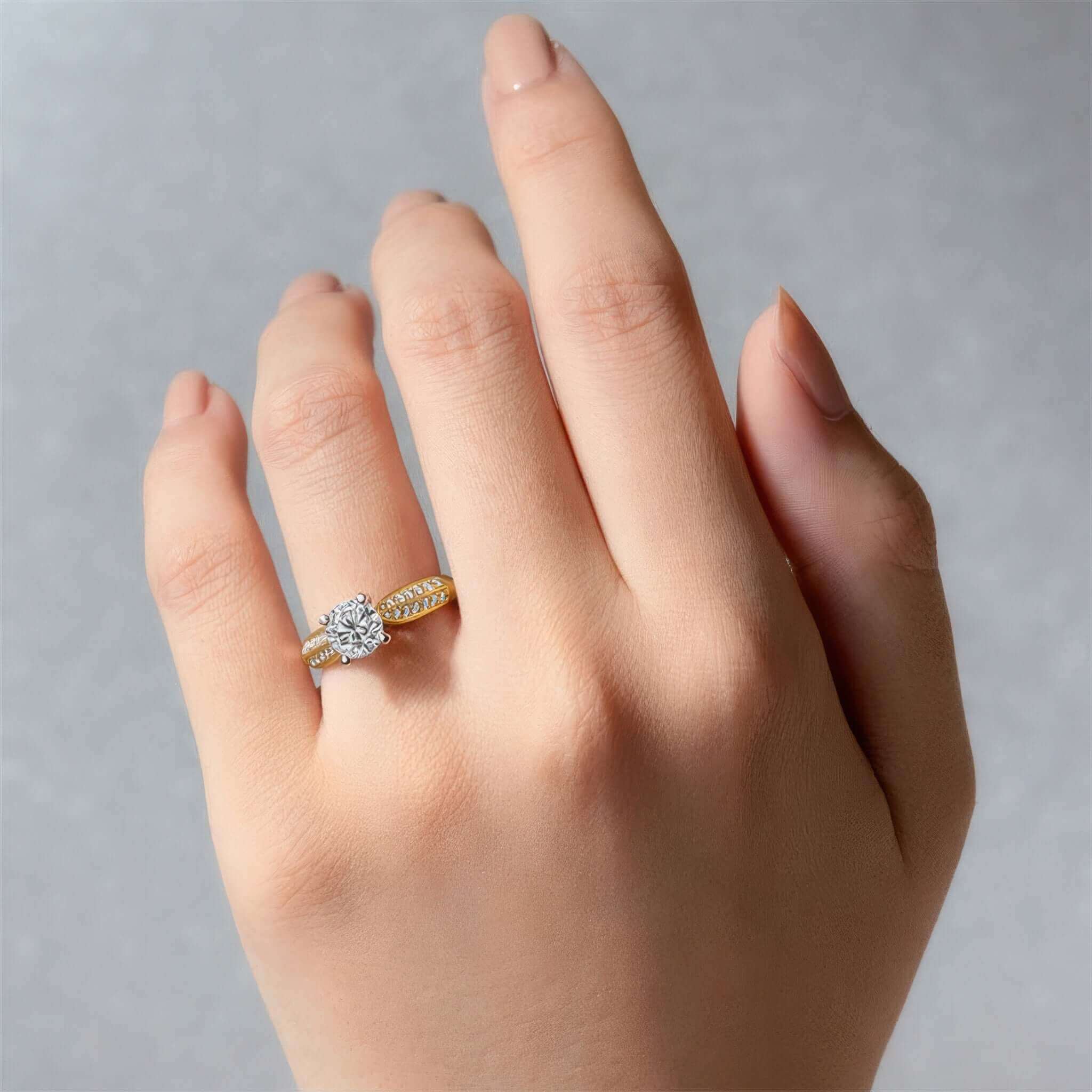 A beautiful 2 row moissanite ring featuring two rows of diamonds neatly set into the band and a brilliant 1 carat round center made to impress onlookers.