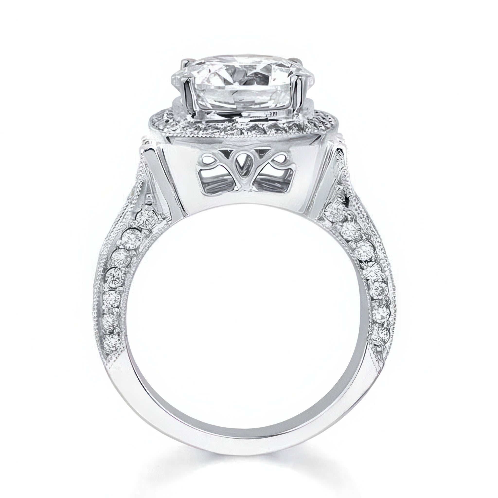 This 3 carat antique moissanite ring features a large prong set round center with a diamond halo and pave set diamonds cascading down the shank for a touch of elegance from every angle.