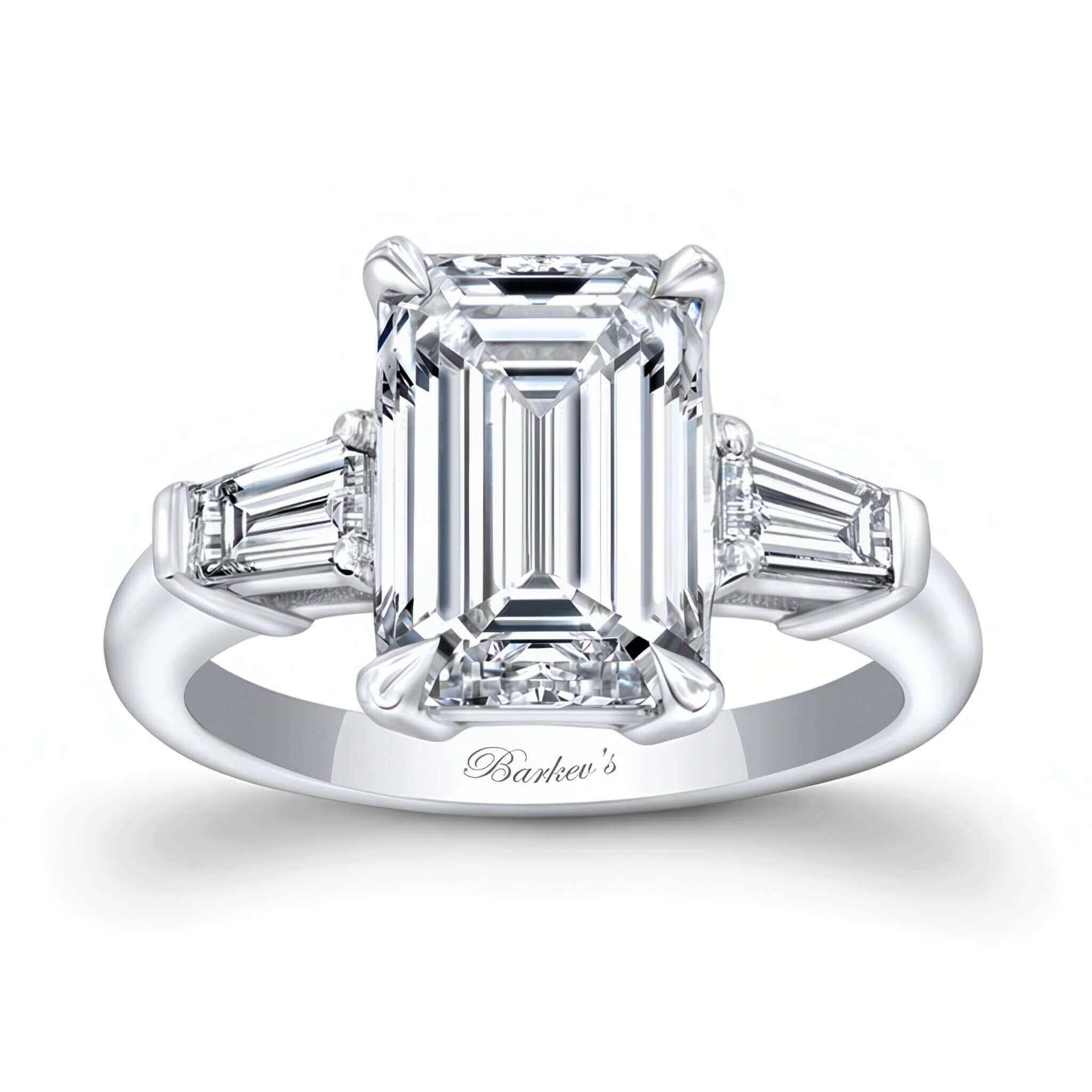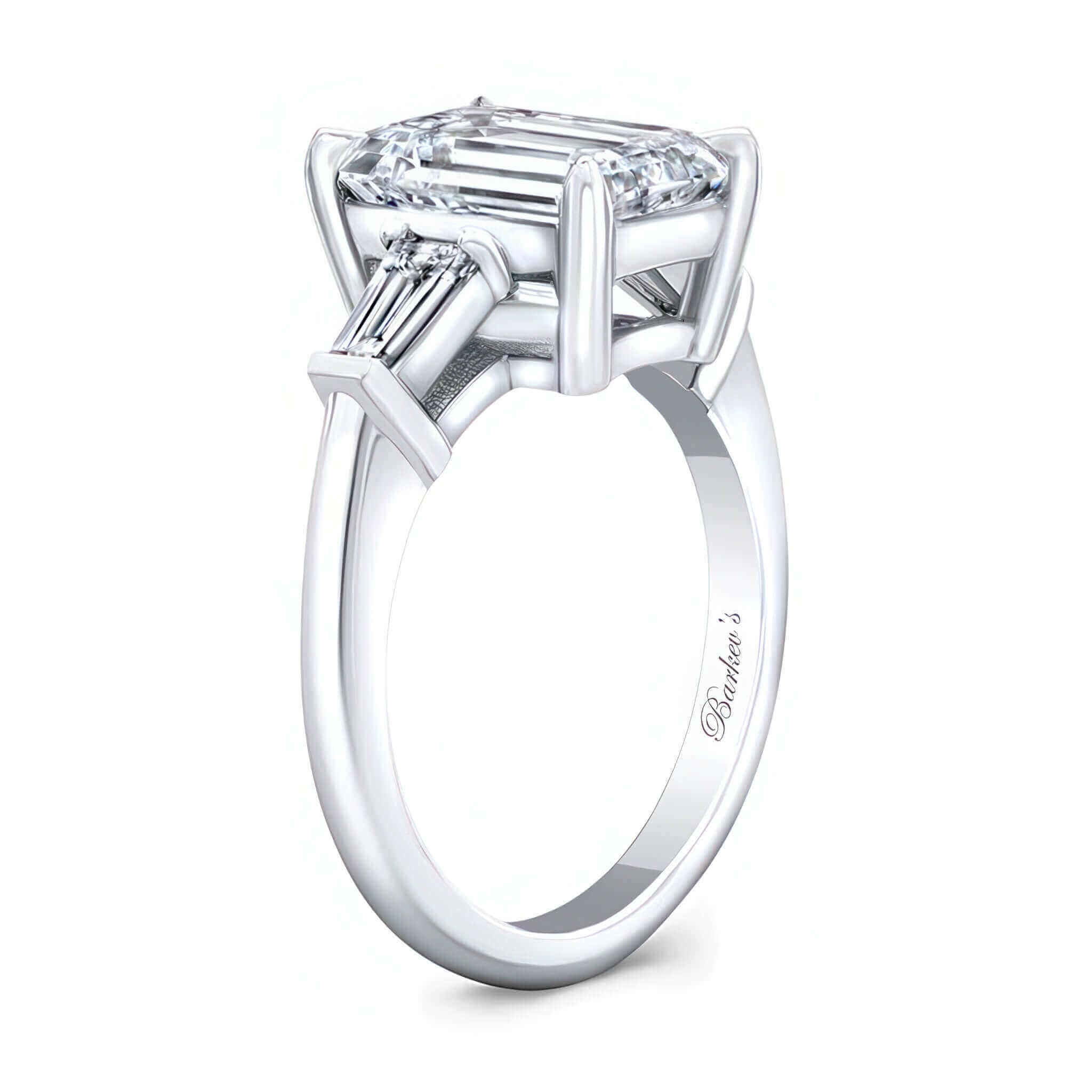 A beautiful 3 carat emerald cut moissanite ring featuring a three stone design with two tapering baguette diamonds on each side.