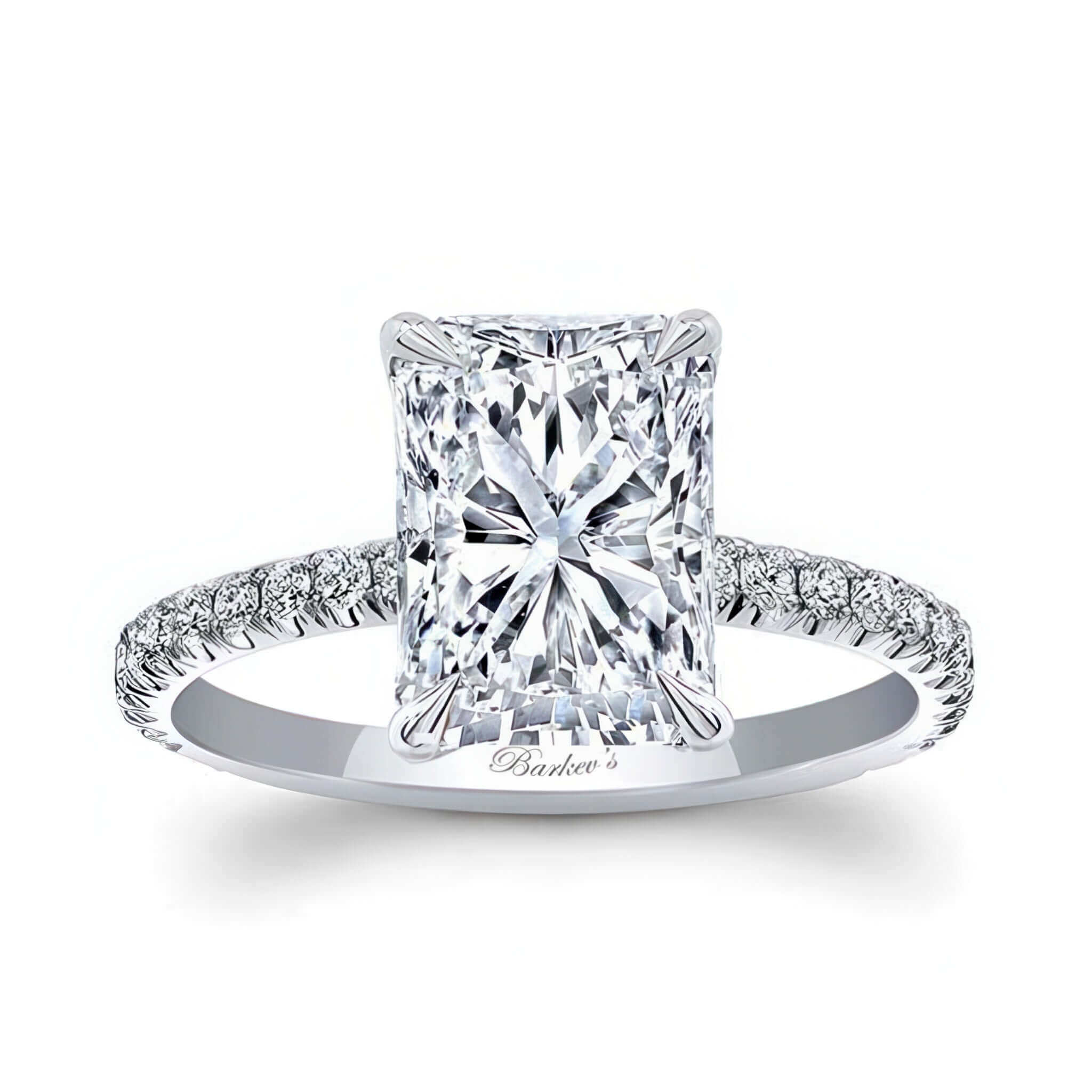 Discover the stunning allure of our 3 carat radiant cut moissanite ring, where elegance meets artistry. The centerpiece is a breathtaking 3 carat radiant cut moissanite cradled securely by four delicate prongs that maximize its light-catching facets, but the magic does not stop there. Hidden beneath the center stone lies a circle of 24 shimmering diamonds, forming a hidden halo that adds a unique touch of brilliance from every angle. The band is further elevated with 30 expertly french cut pave set diamonds, creating a continuous stream of sparkle. This stunning ring is more than just a piece of jewelry, it is a celebration of beauty, craftsmanship, and unforgettable moments.
