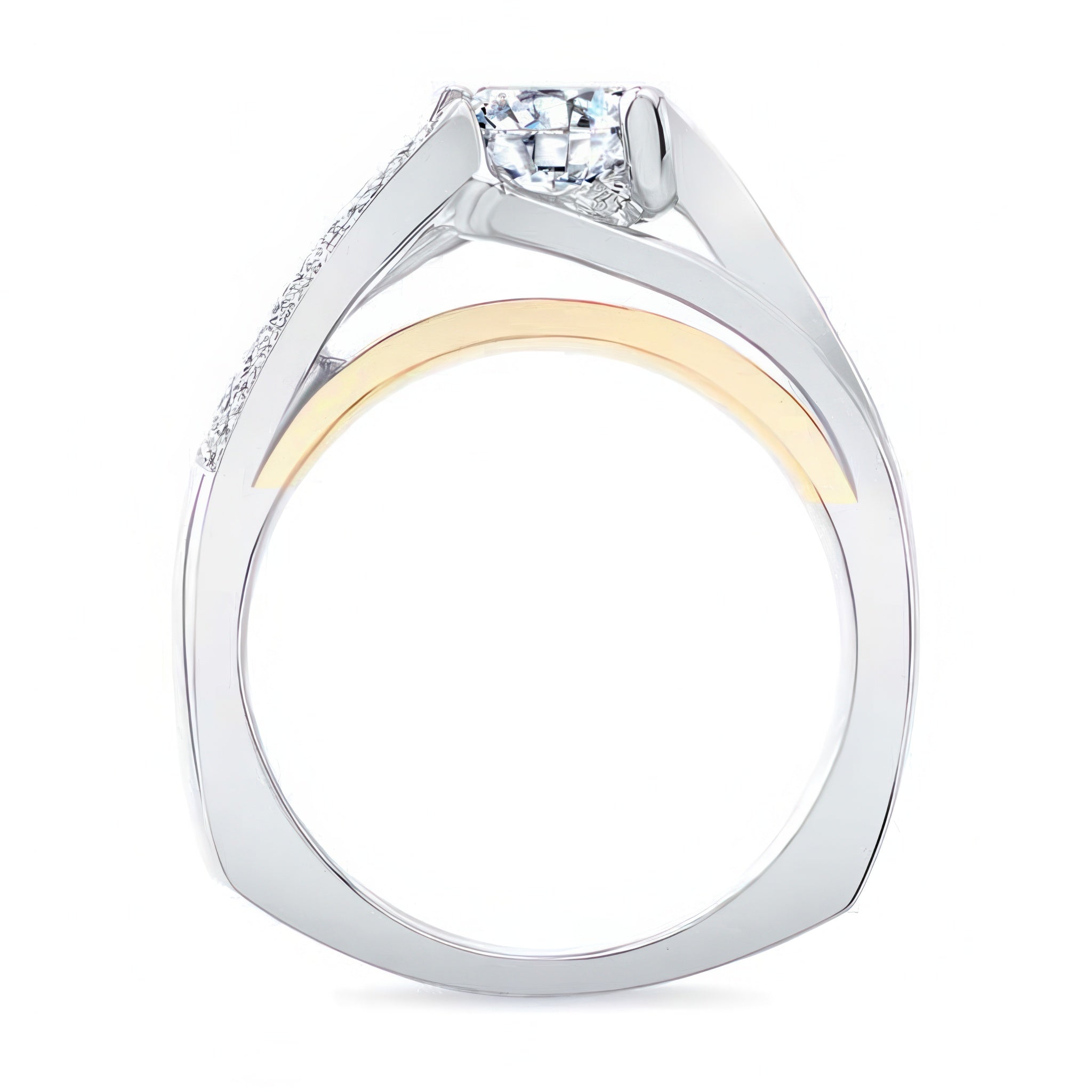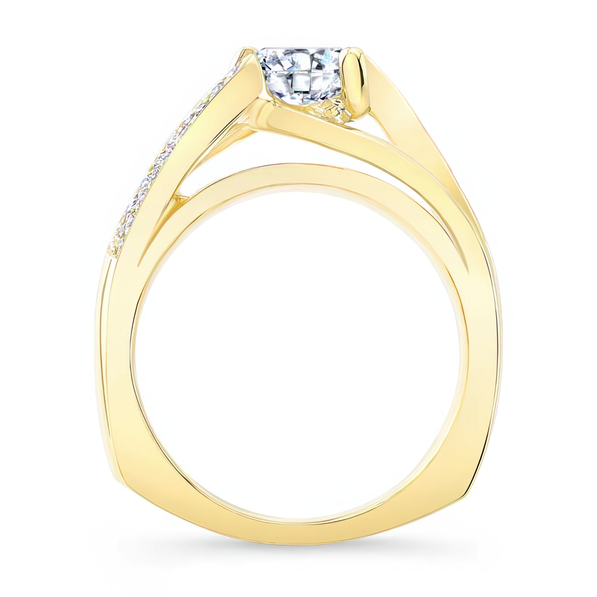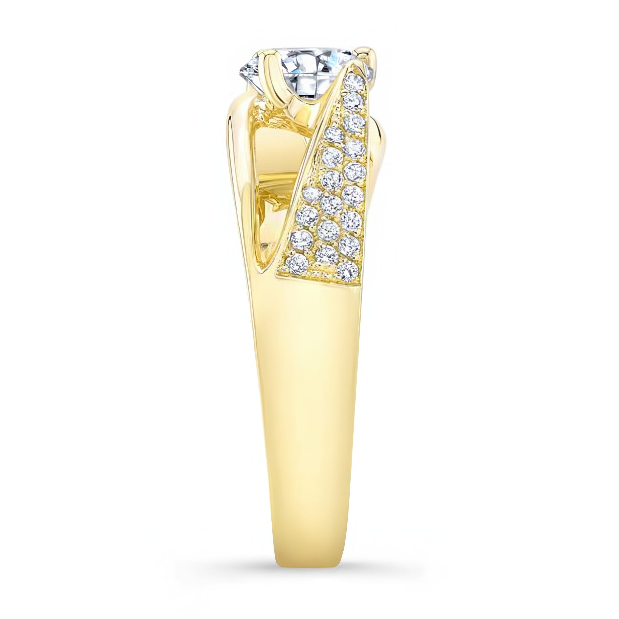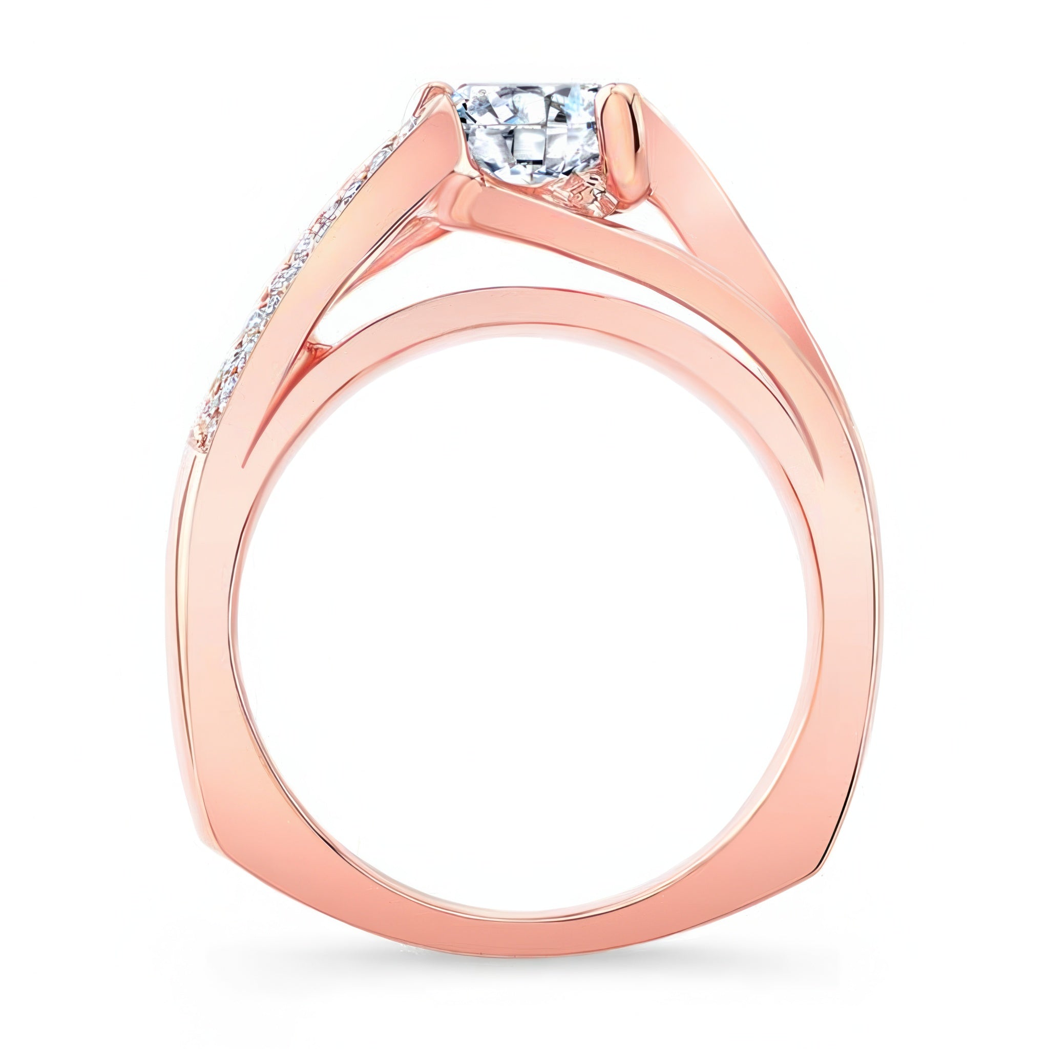 This 3 row moissanite ring is artfully designed with cathedral shoulders that rise up to the prong set center. Three bold rows of pave set diamonds decorate both sides making a statement that will catch the eye of many admirers.