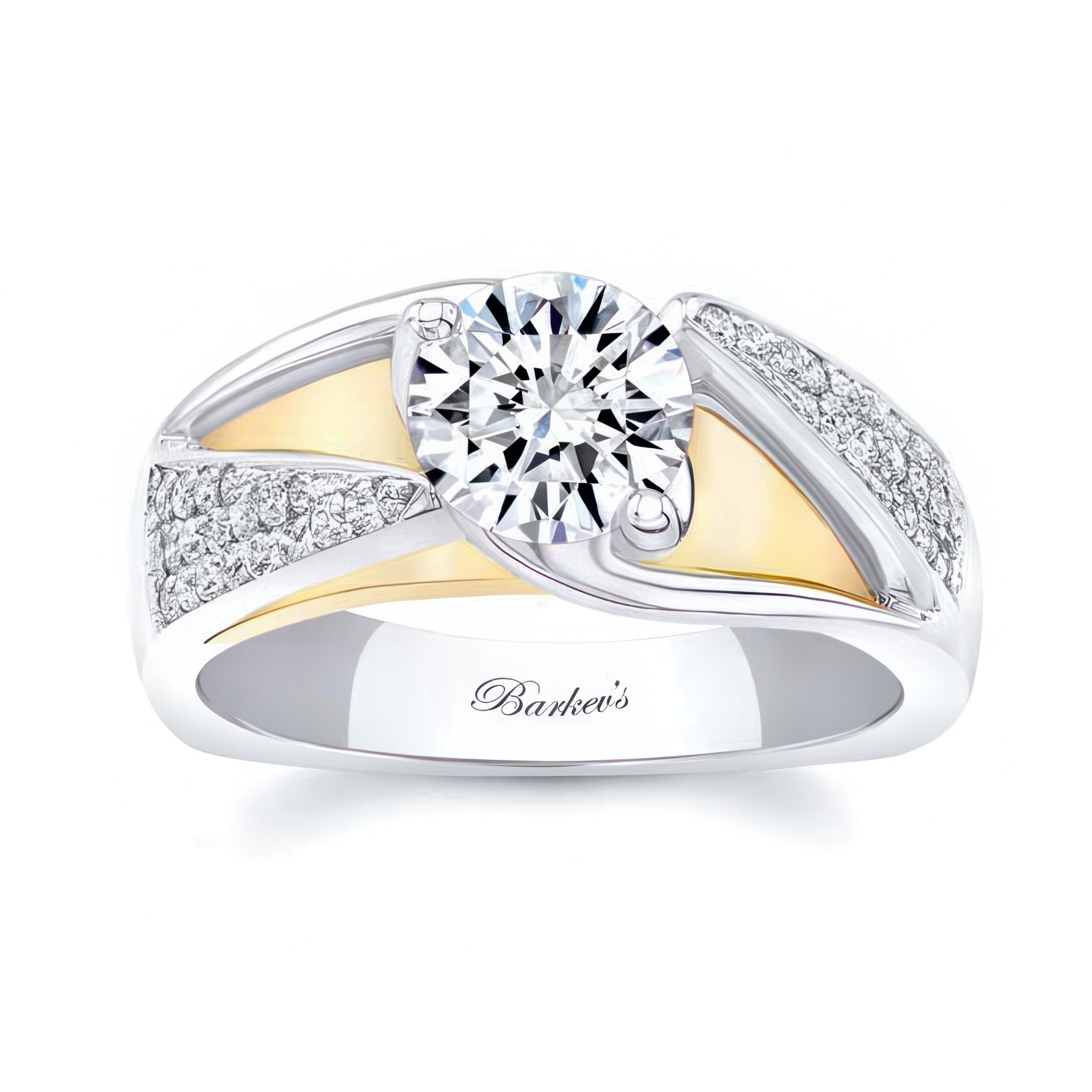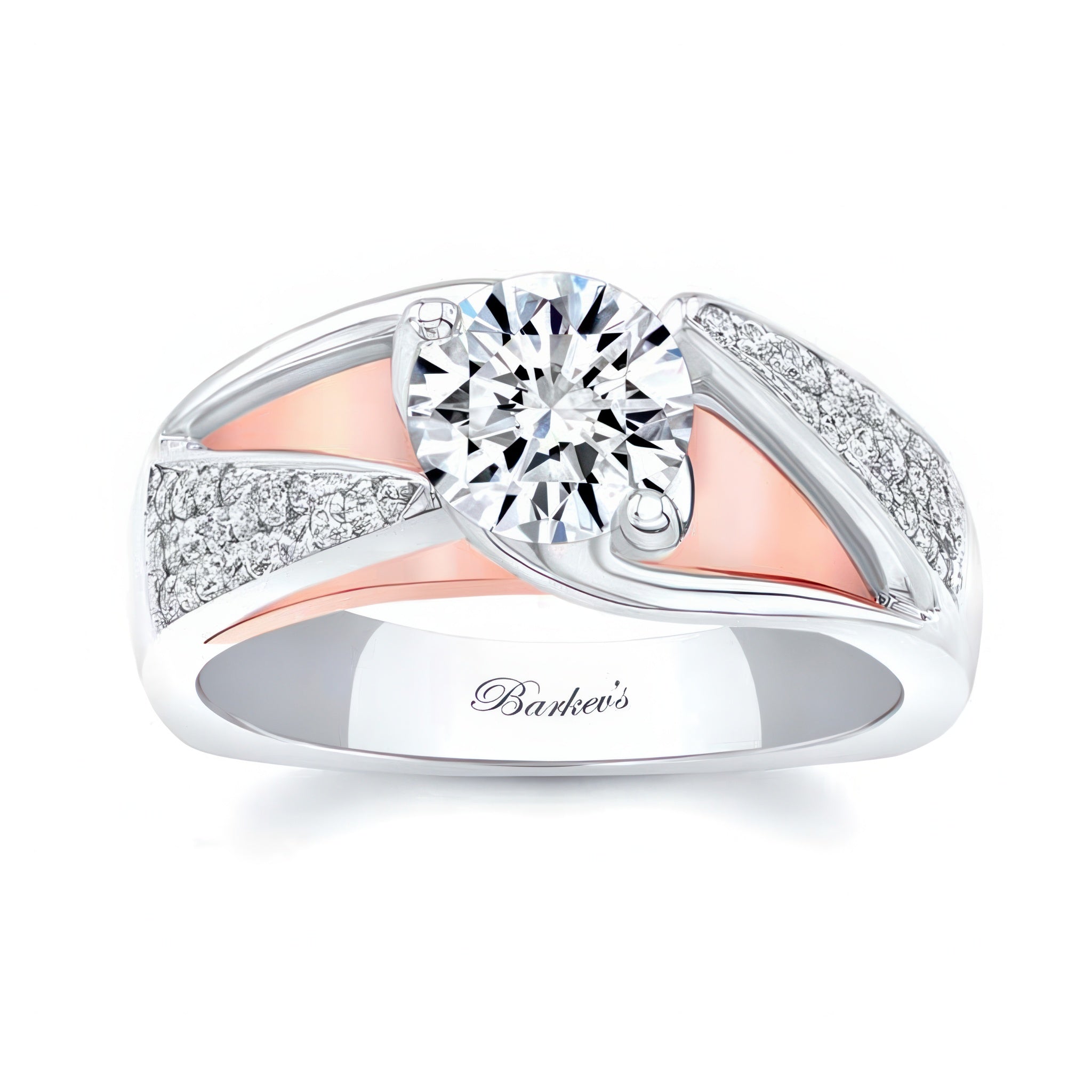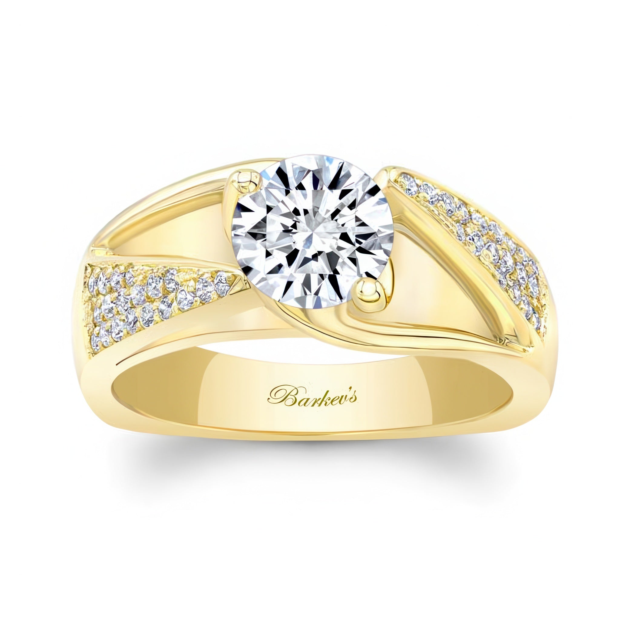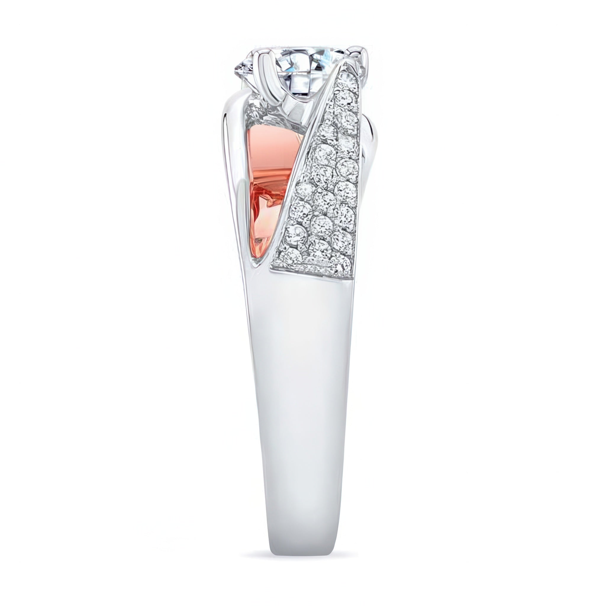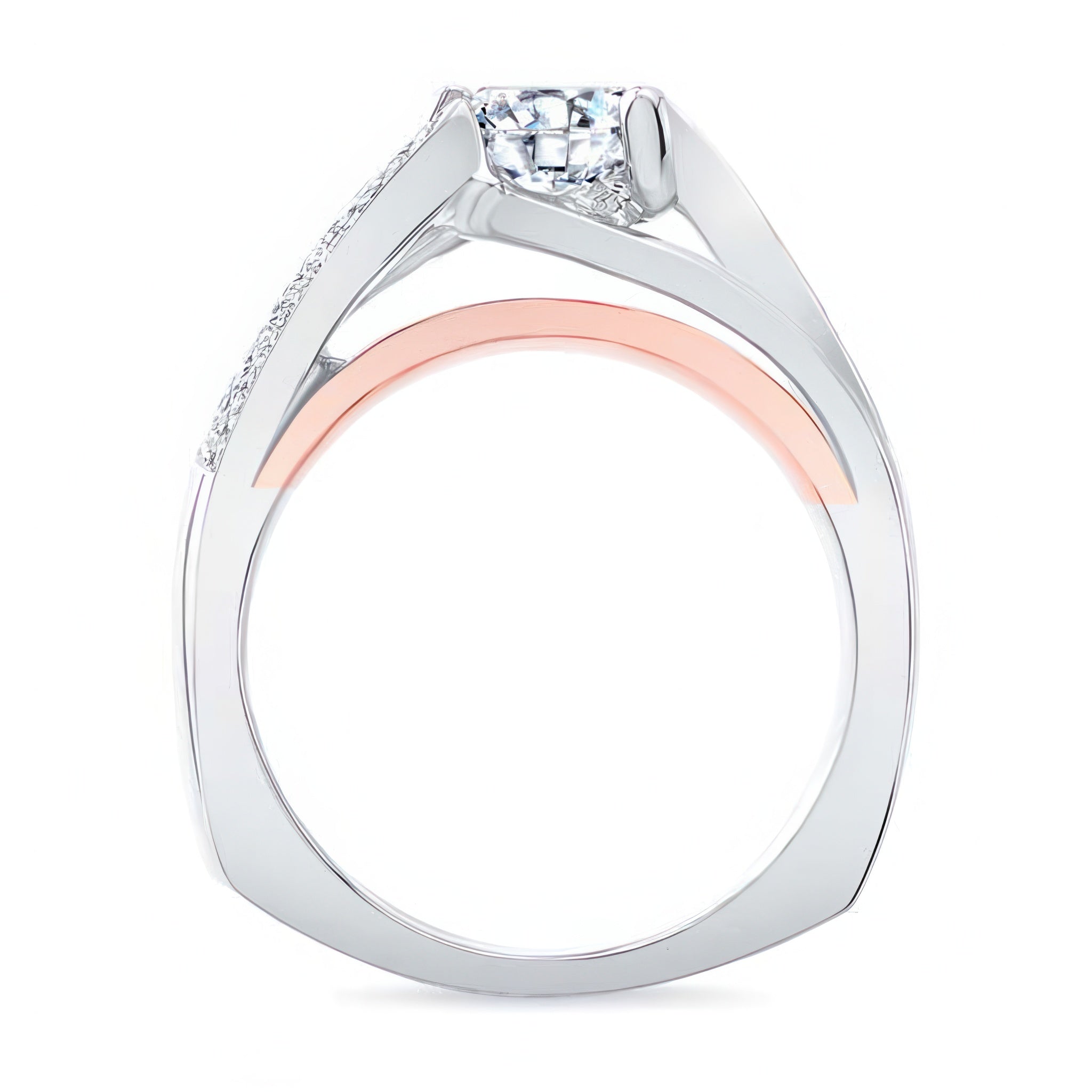 This 3 row moissanite ring is artfully designed with cathedral shoulders that rise up to the prong set center. Three bold rows of pave set diamonds decorate both sides making a statement that will catch the eye of many admirers.